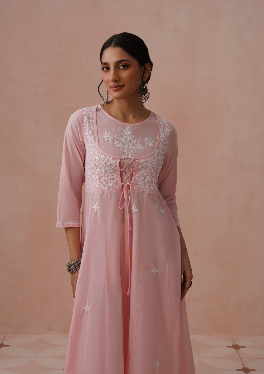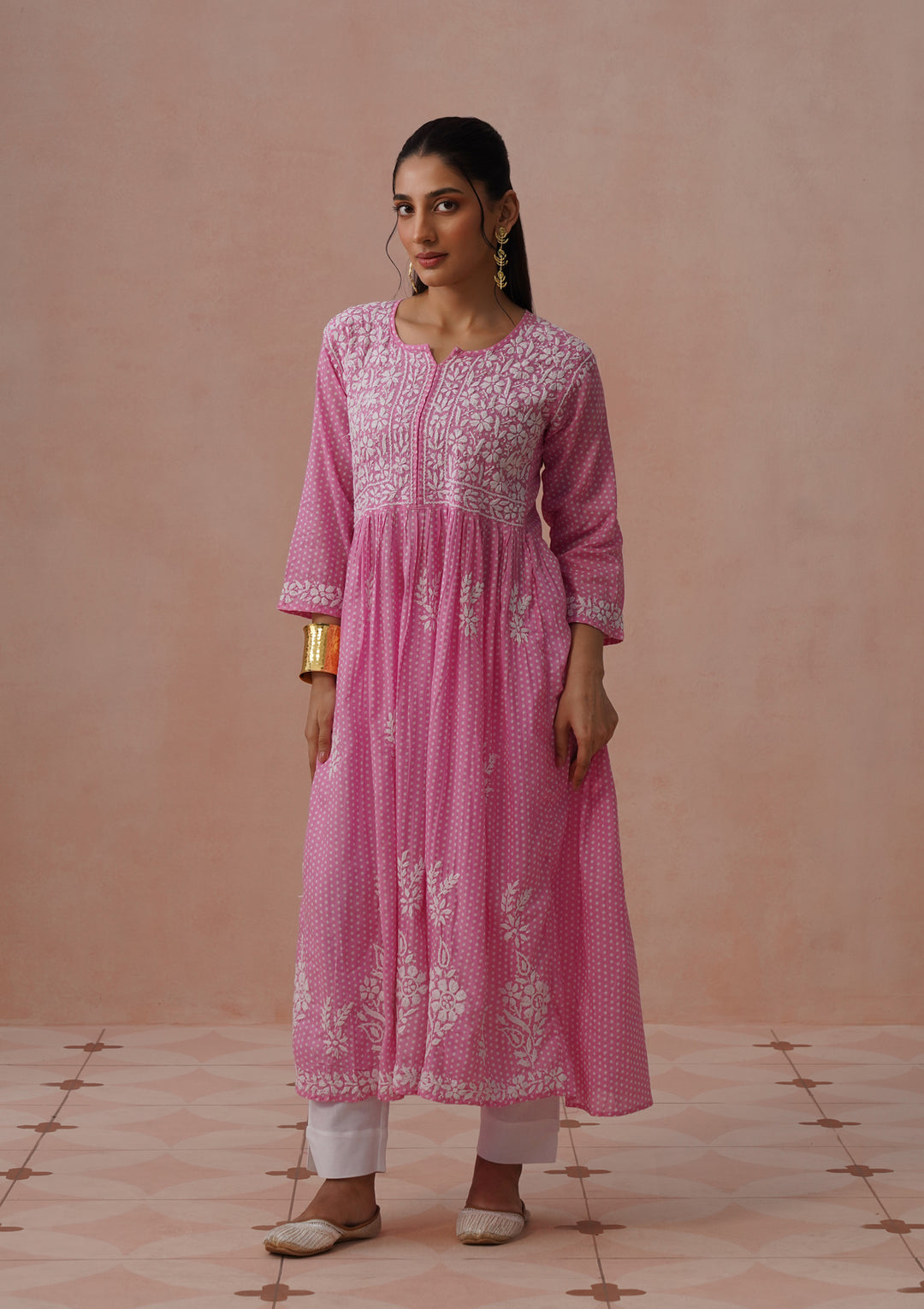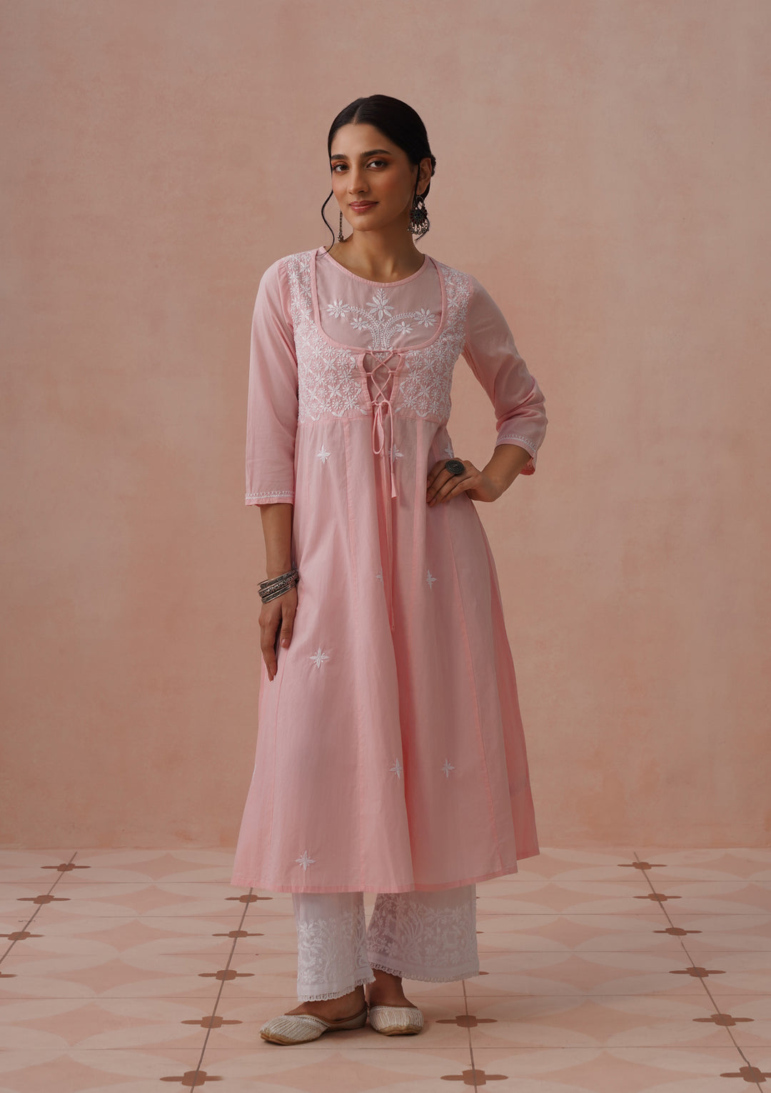 HOC Cotton Chikankari Mughal Solid Flared Women's Long Kurta - Pink