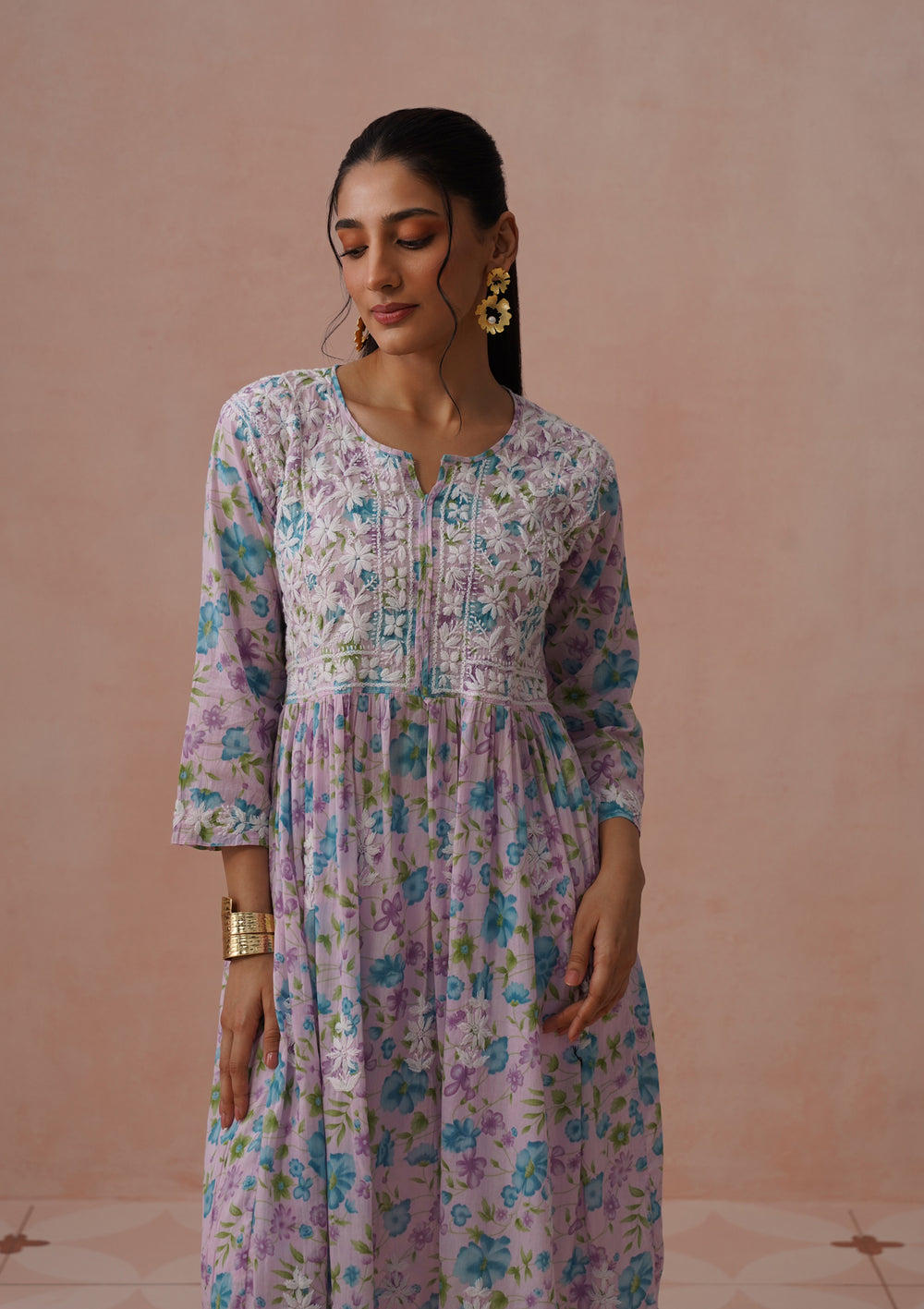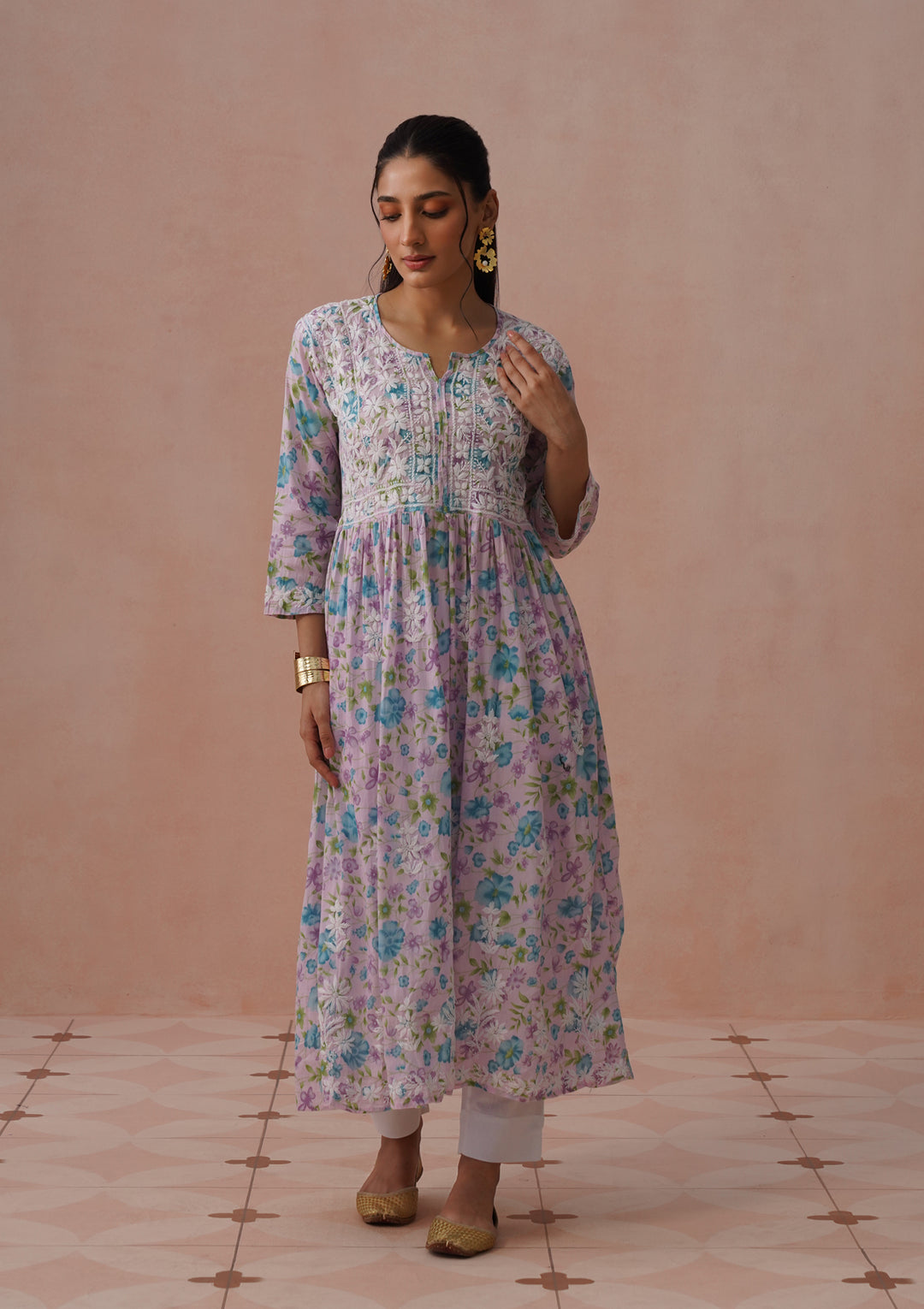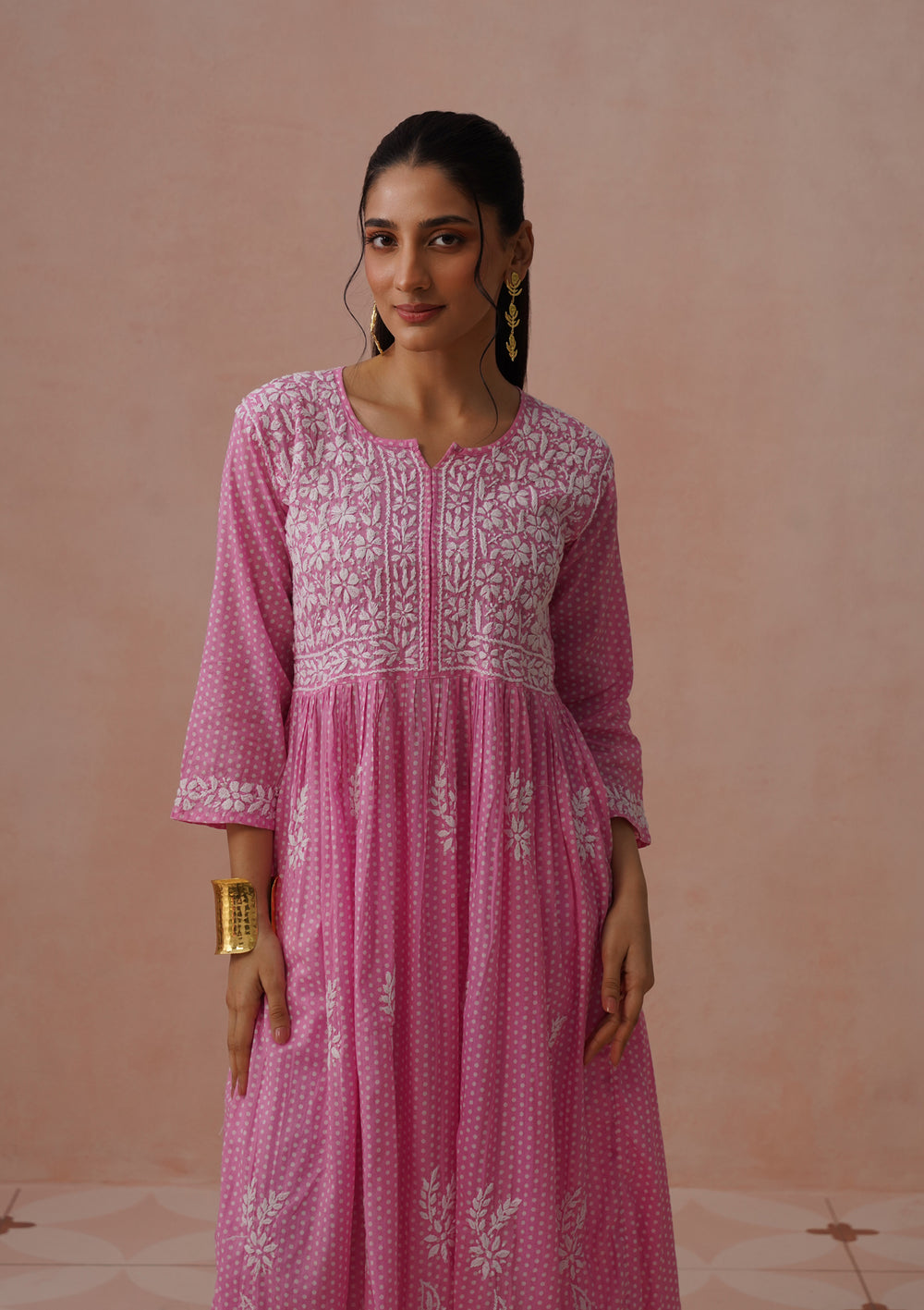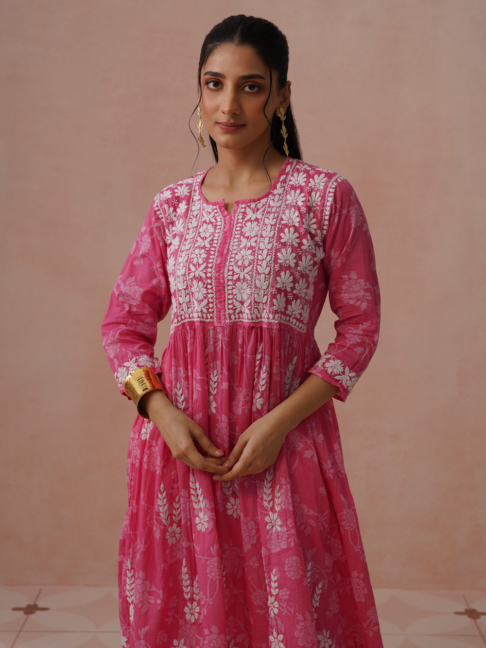 HOC Cotton Chikankari Mughal Solid Flared Women's Long Kurta - Pink