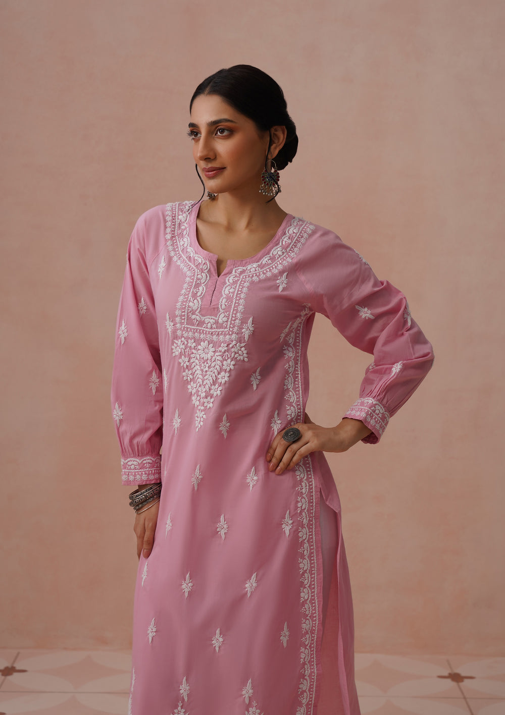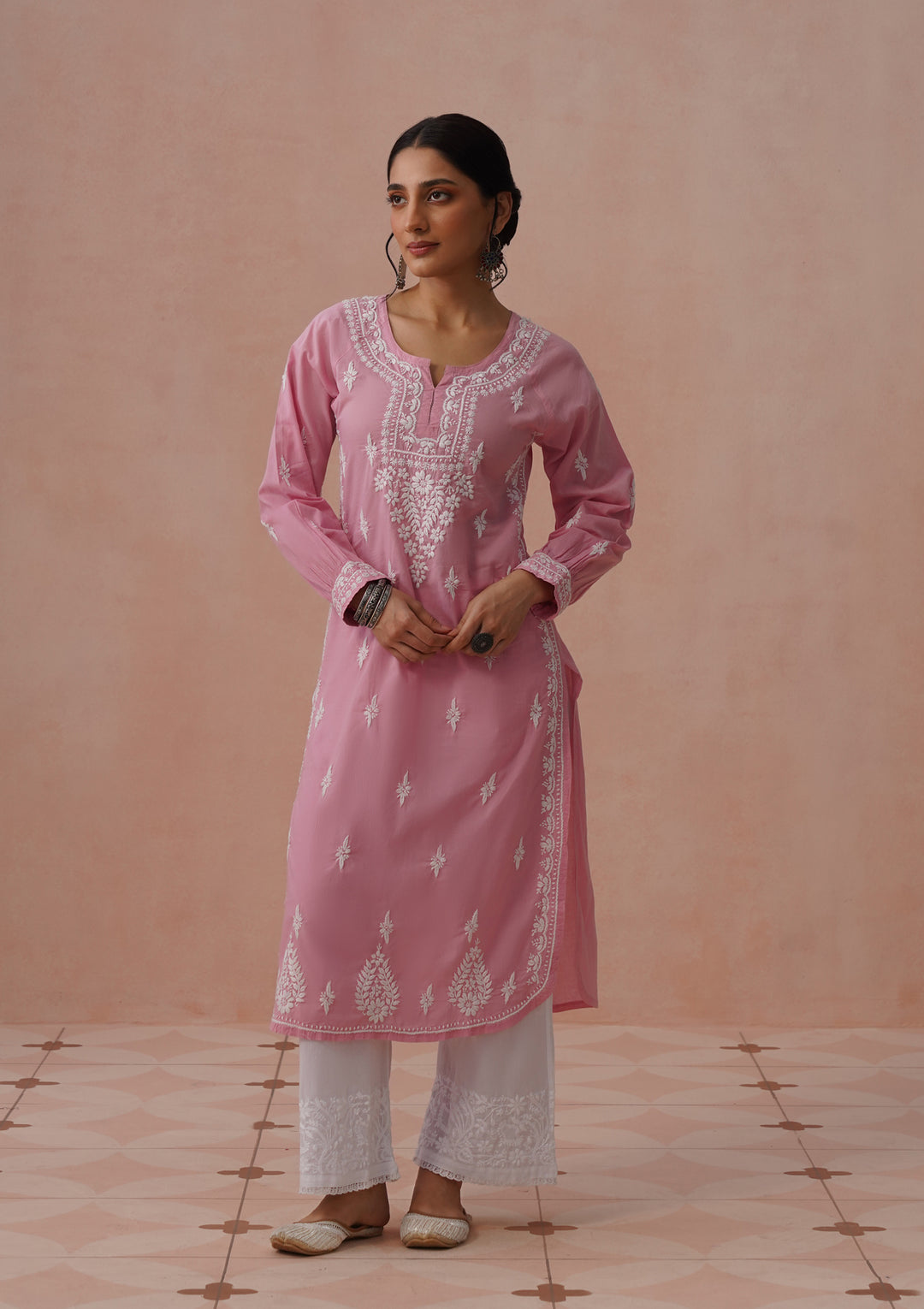 HOC Cotton Cambric Chikankari Solid Straight Women's Long Kurta-Dust Pink
