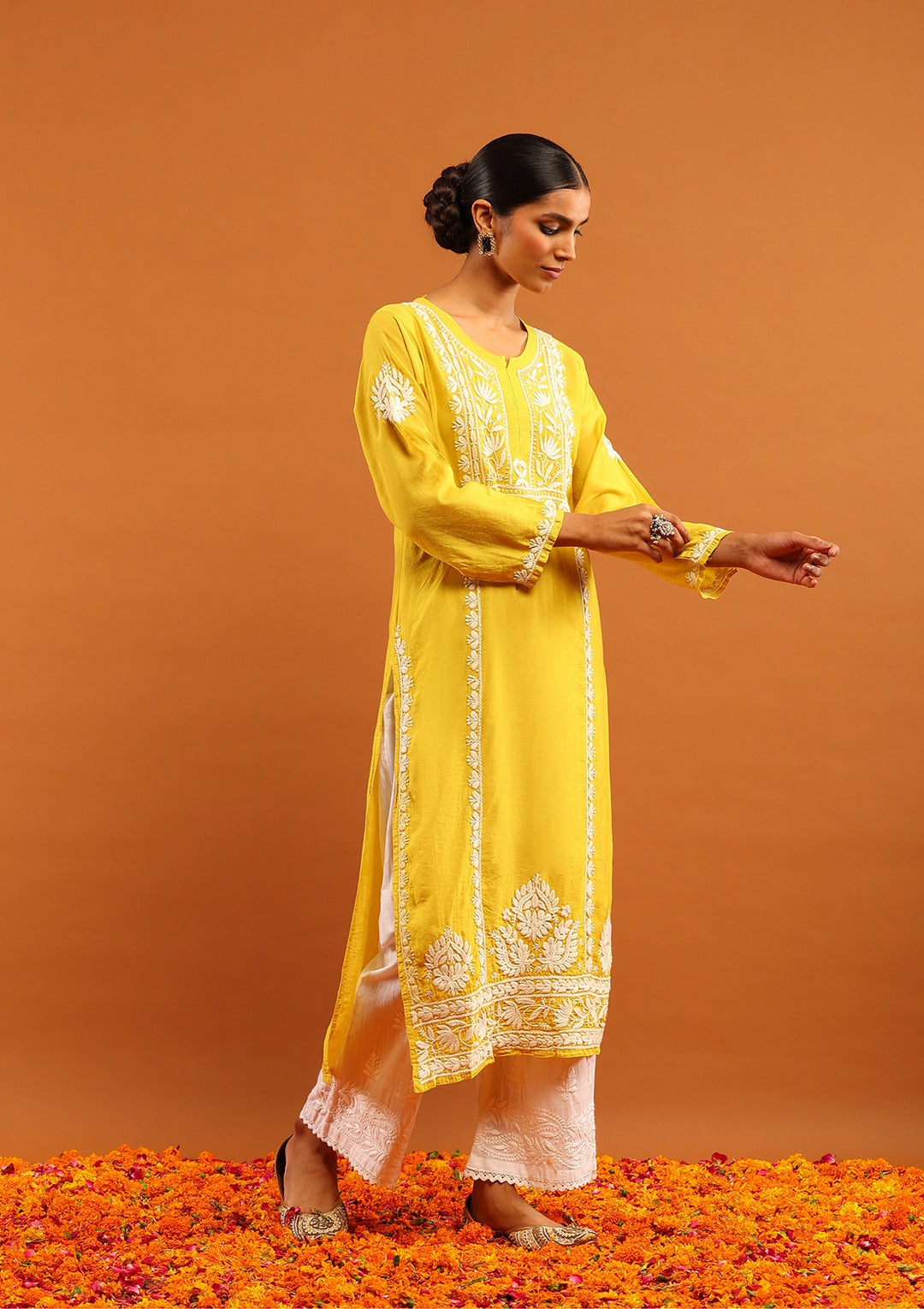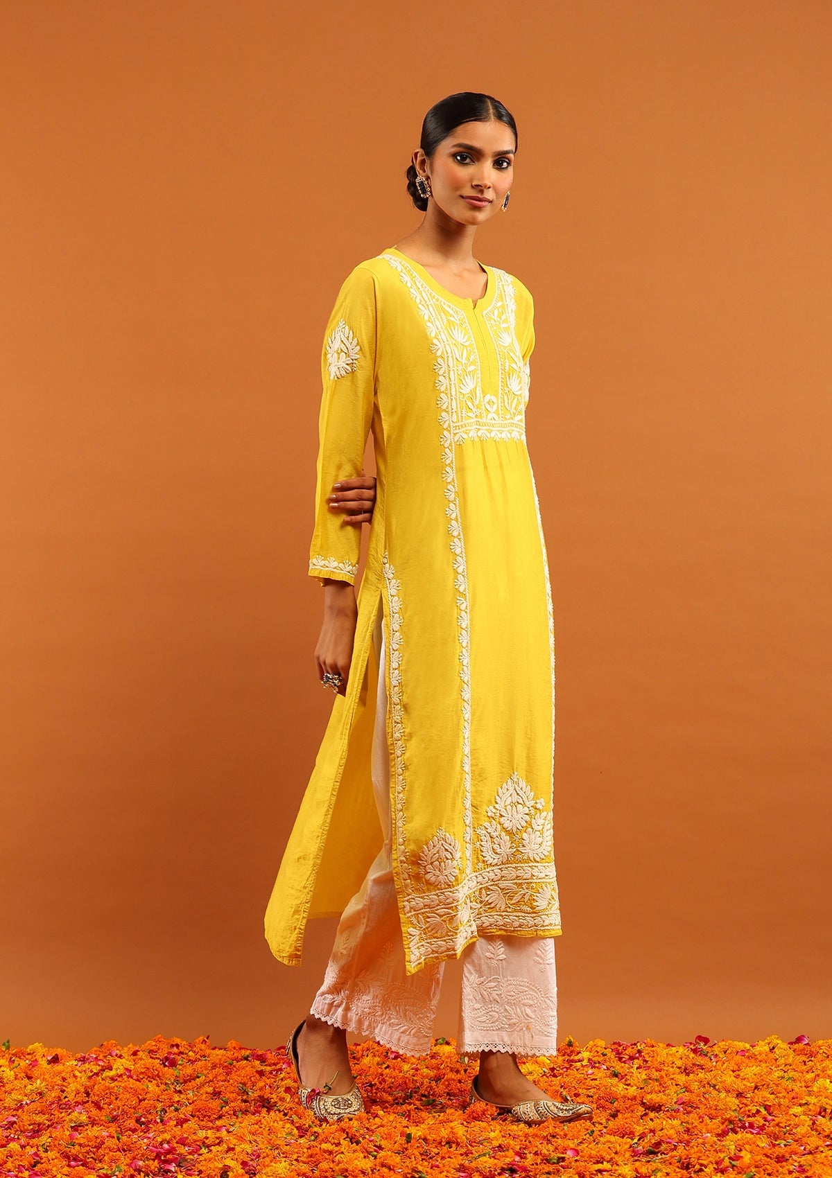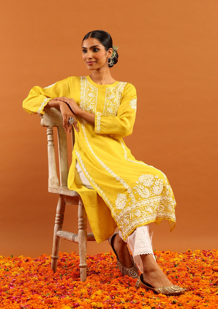 HOC Chanderi Chikankari Solid Women's Long Kurta -Mustard