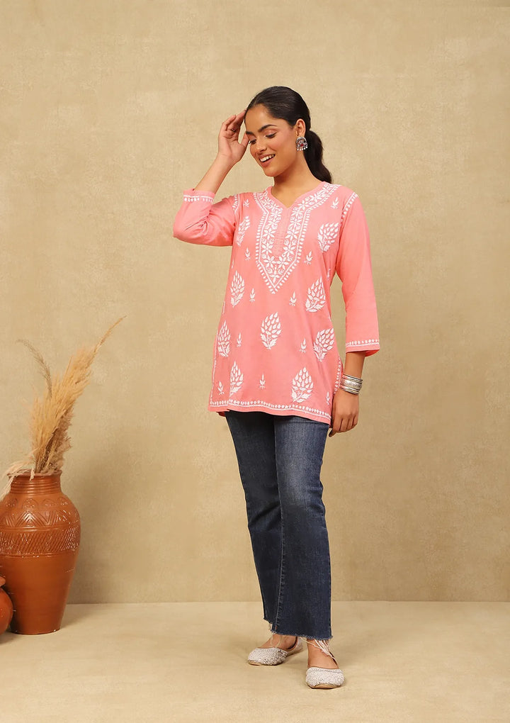 HOC Cotton Chikankari Solid Women's Short Kurta - Peach