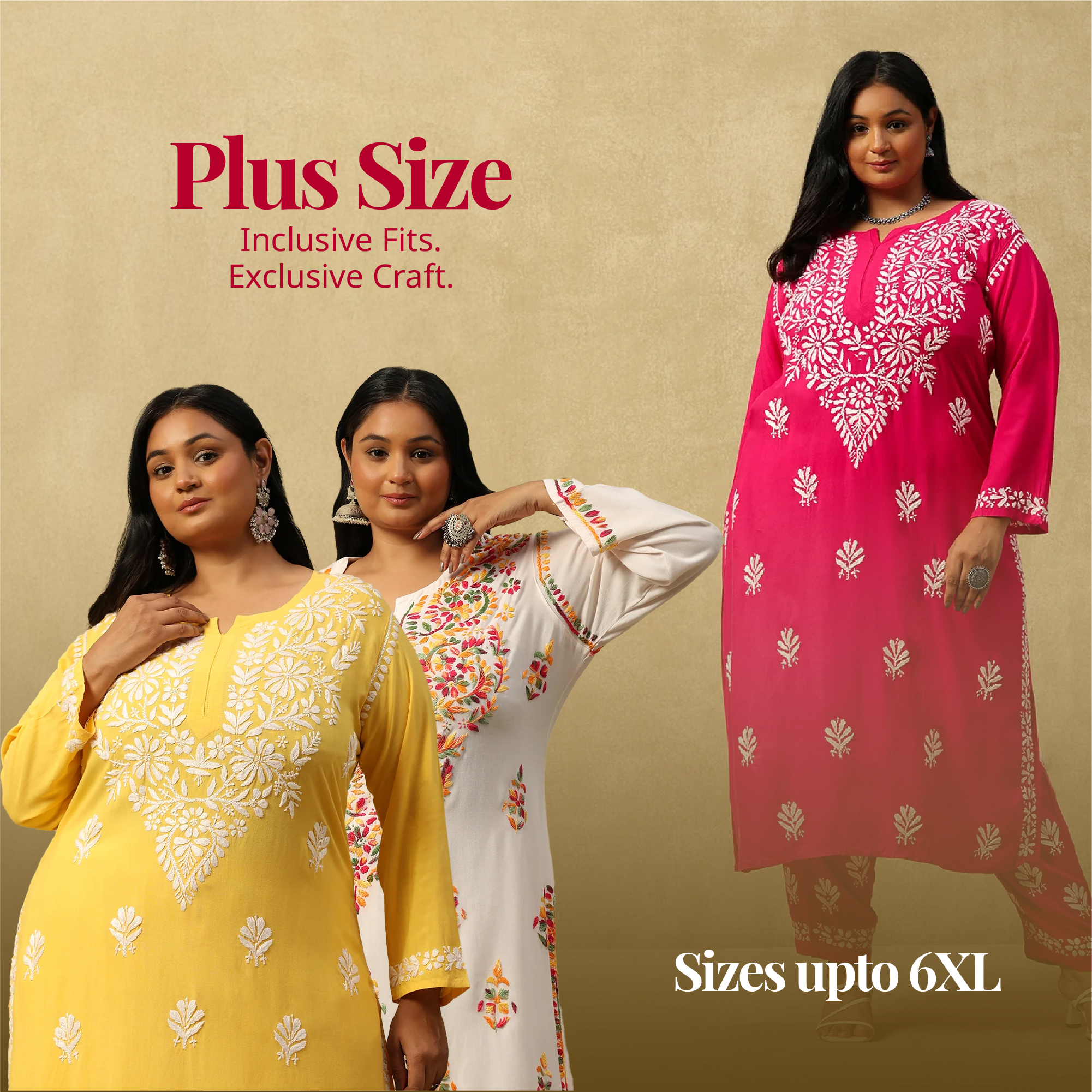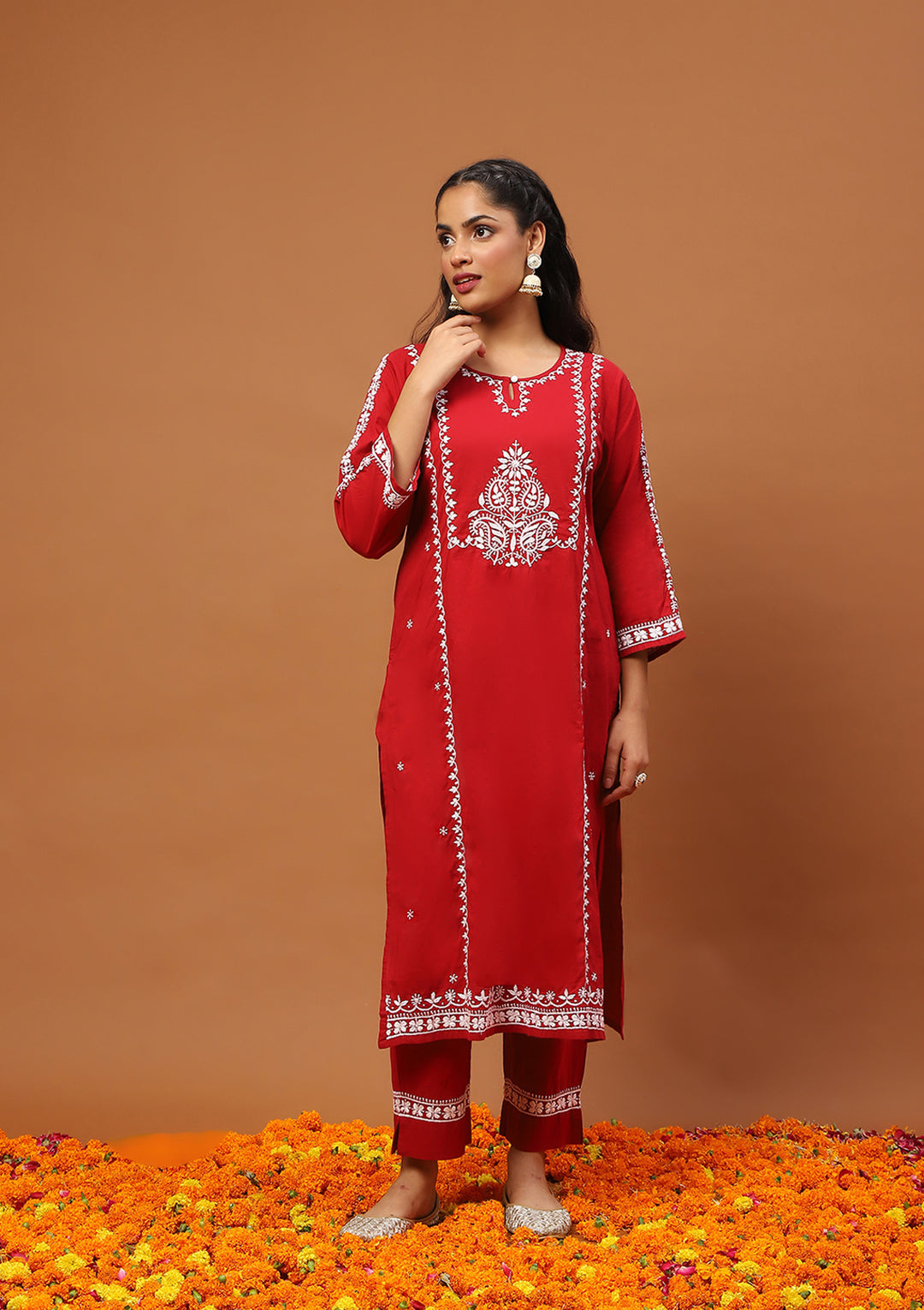 HOC Banarasi Chanderi Chikankari Solid Women's Long Kurta-Red