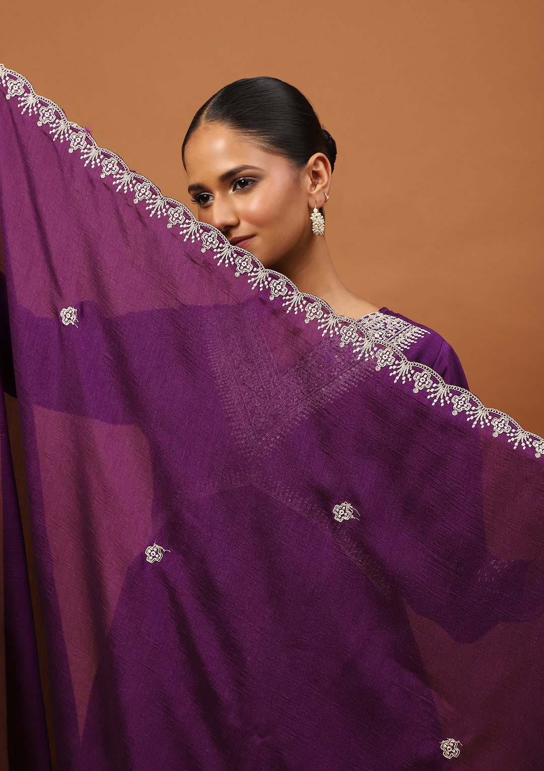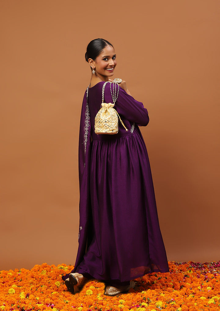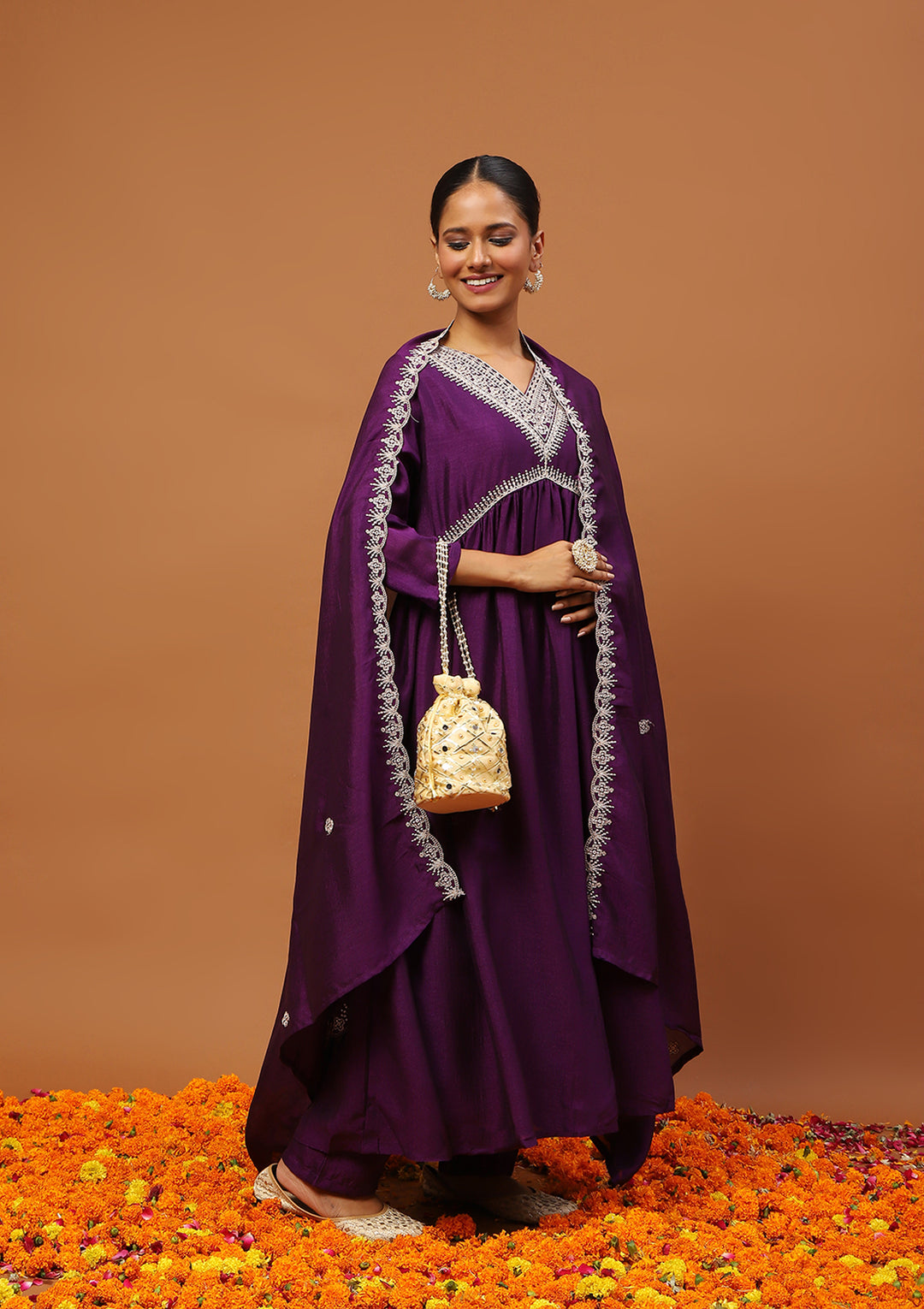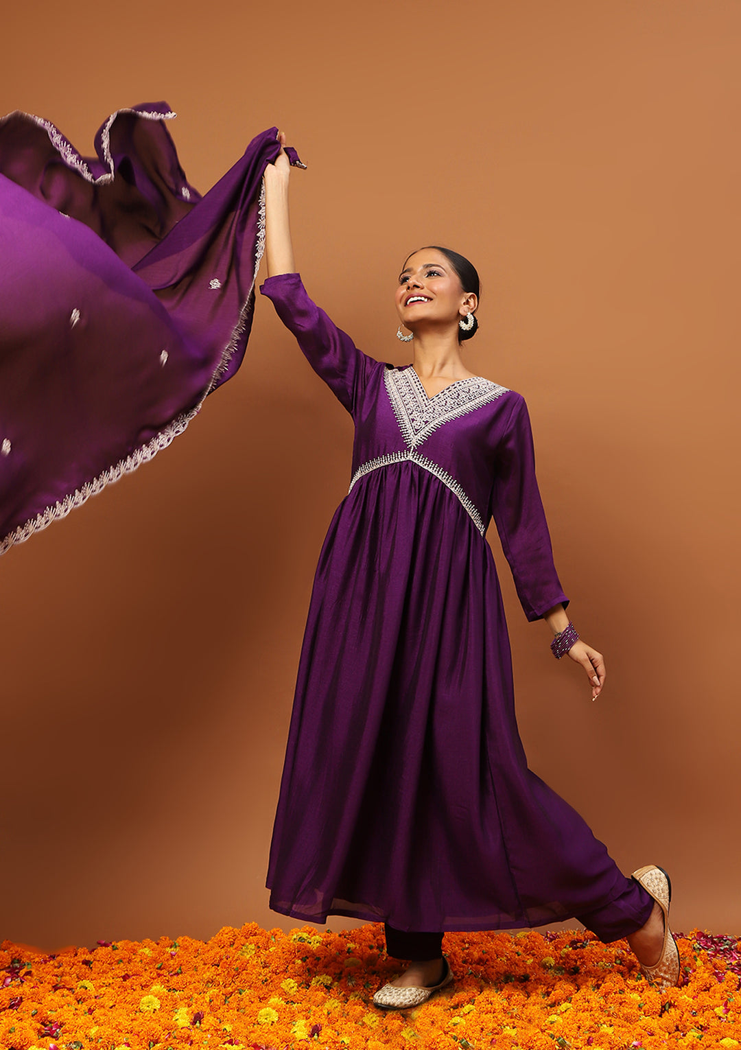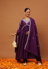 HOC Silk Blend Embroidered With Sequins Solid Women's 3 PC A-Line Kurta Set-Purple