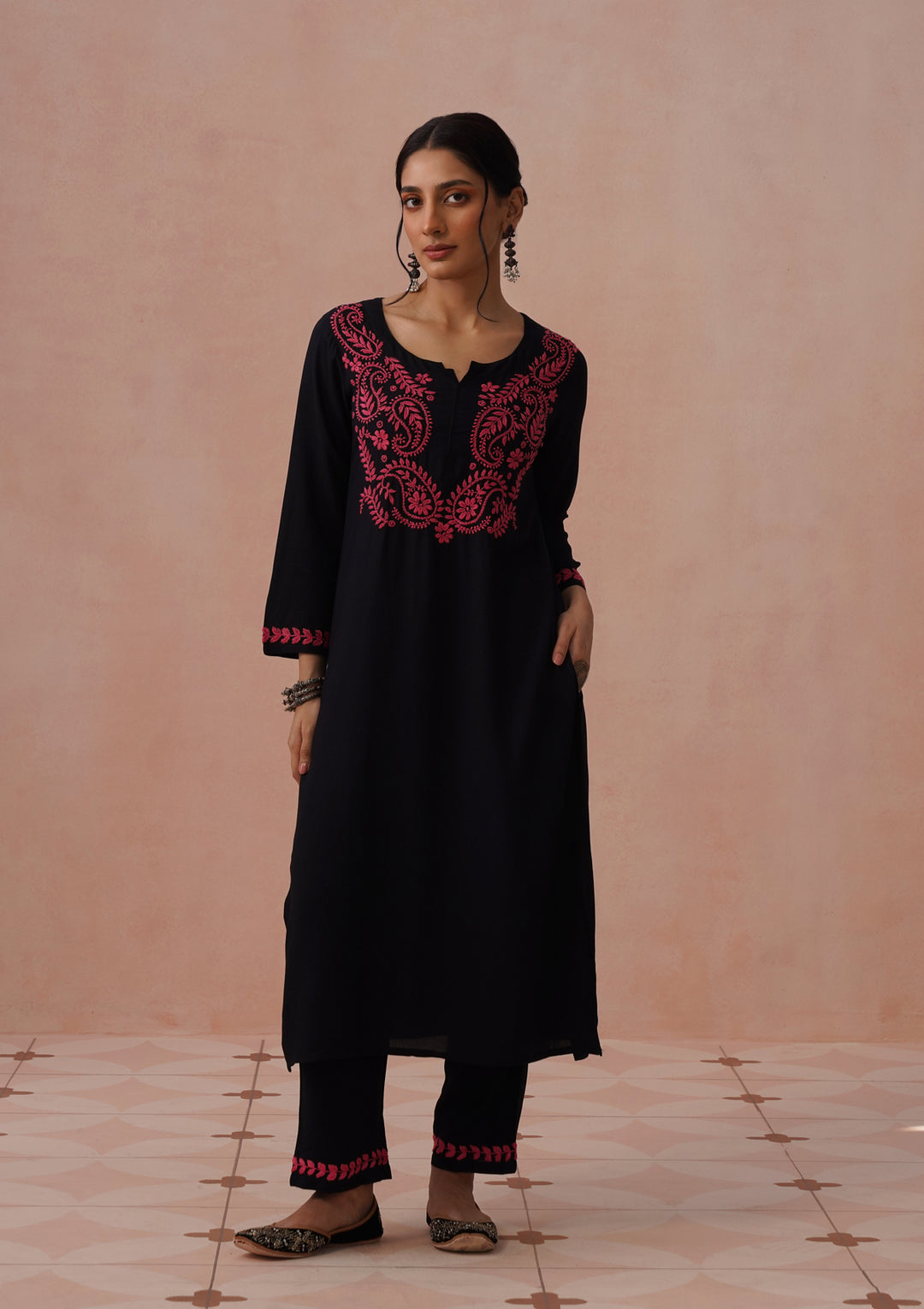 - Afifa Chikankari Rayon Kurta Set - Available in Black, & Bottle Green