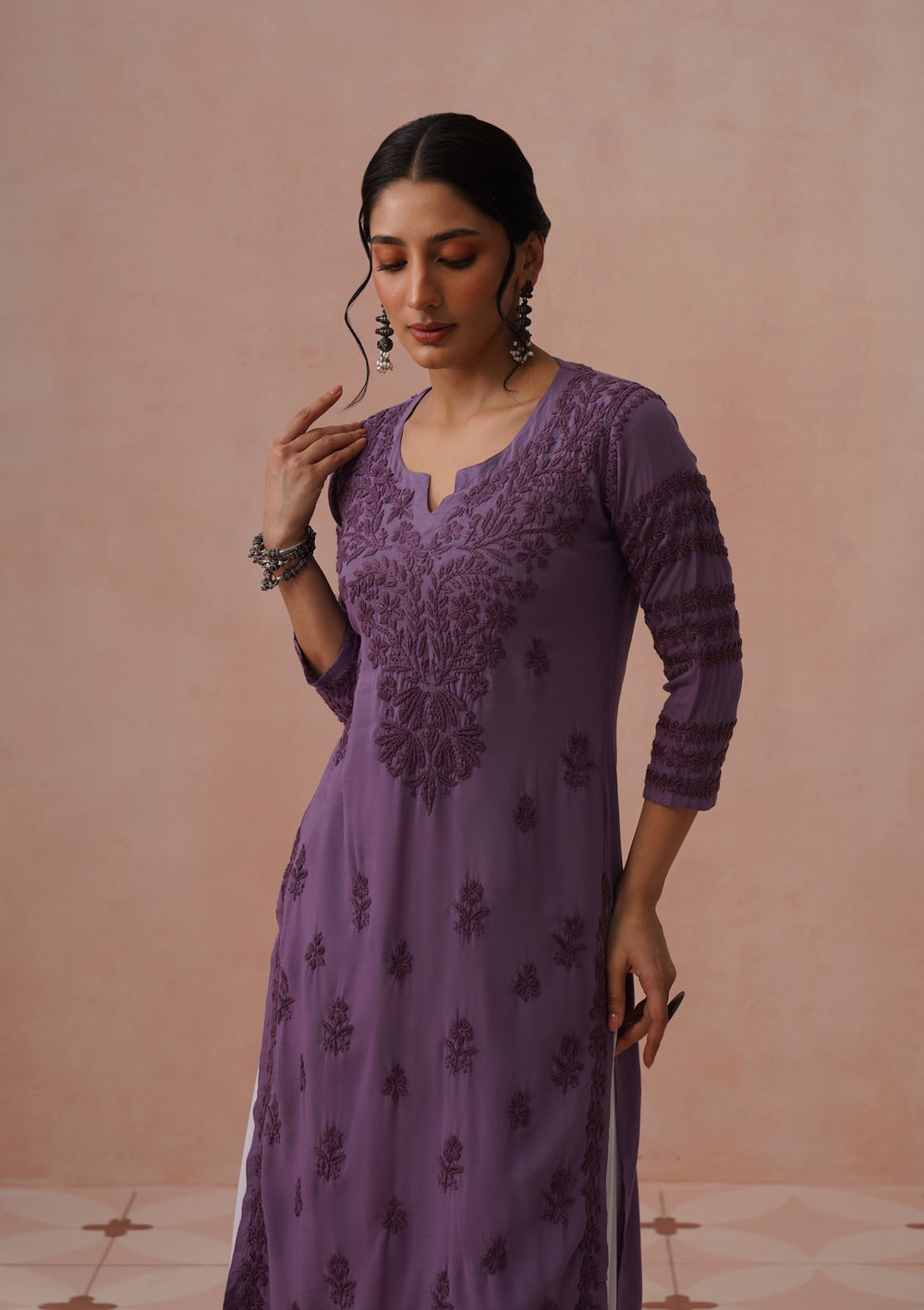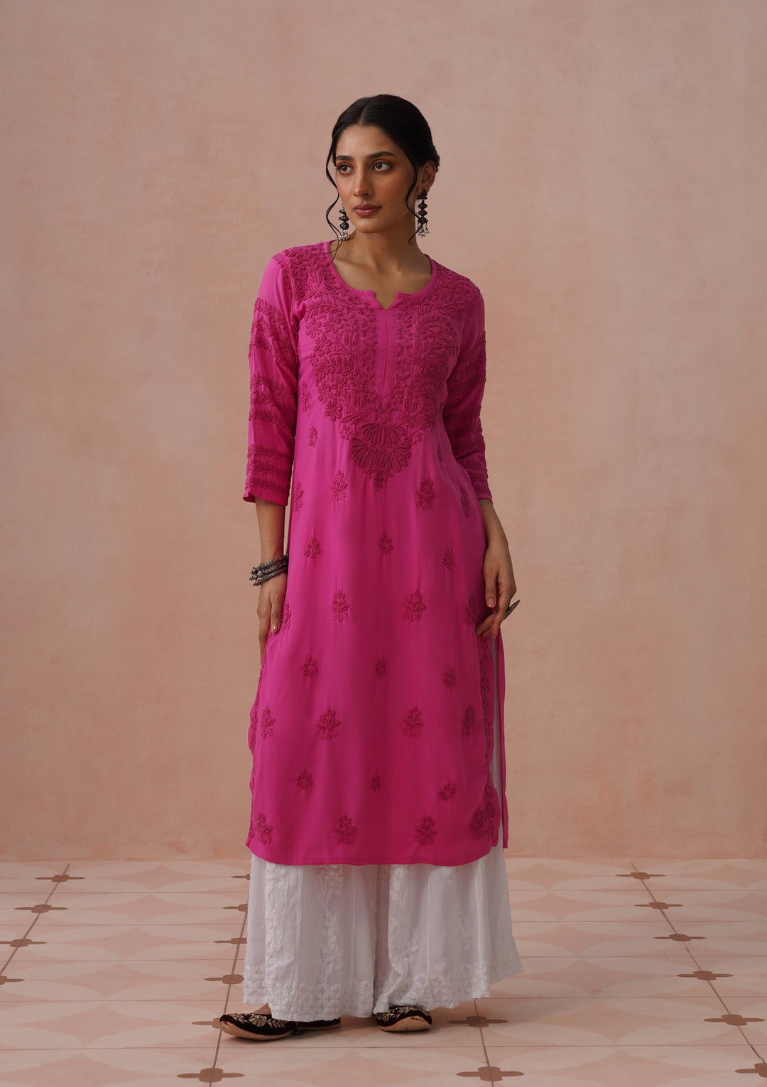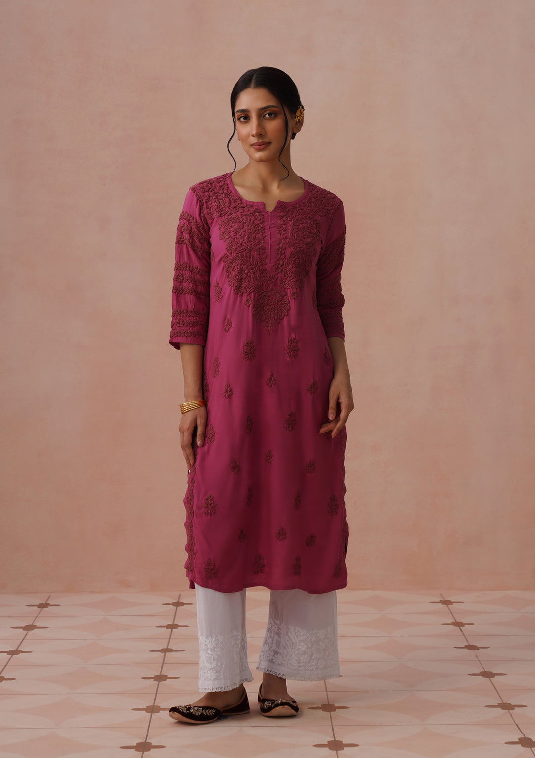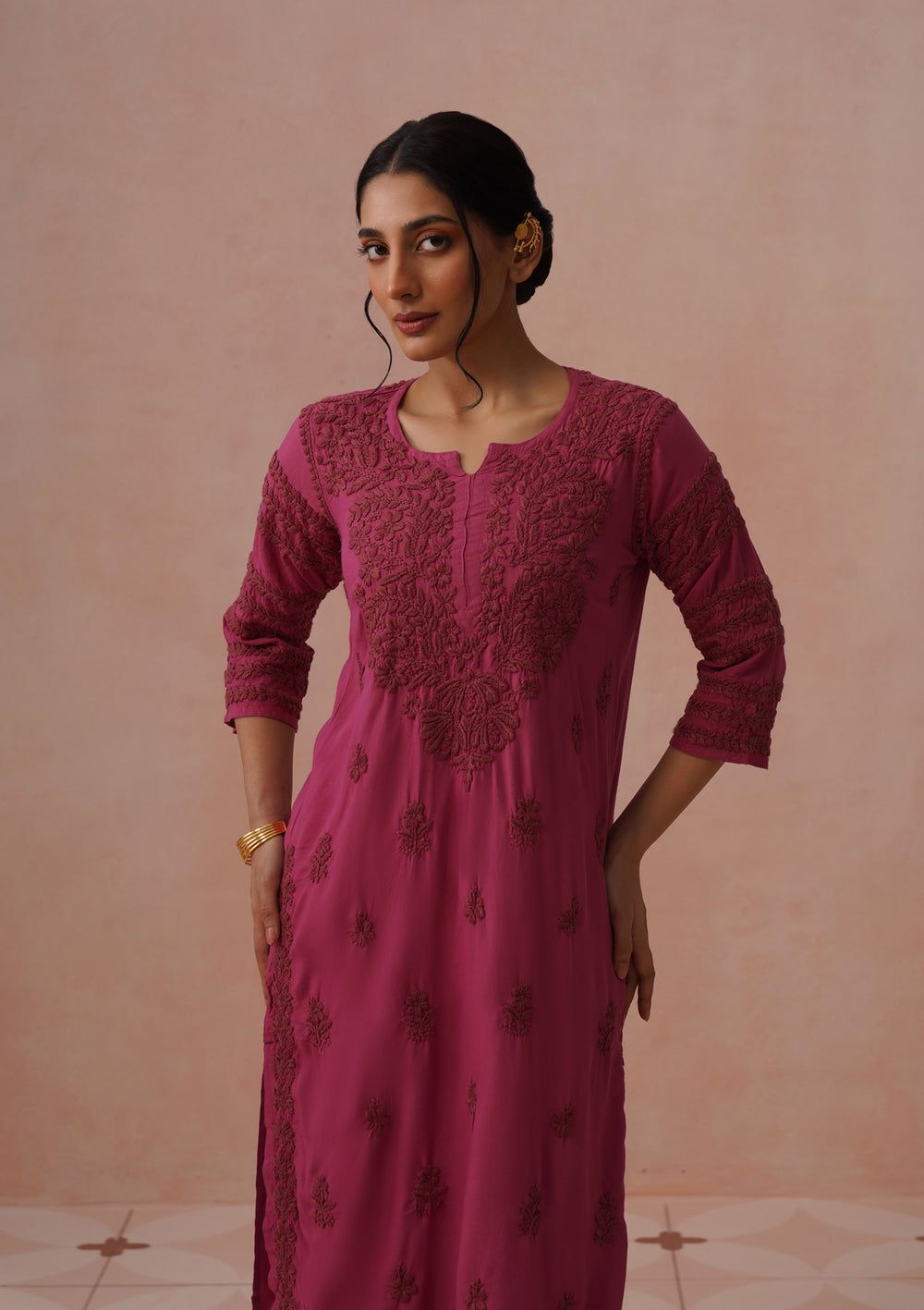 - Habiba Chikankari Rayon Straight Kurta– Available in Mustard, Pink, Purple and Wine