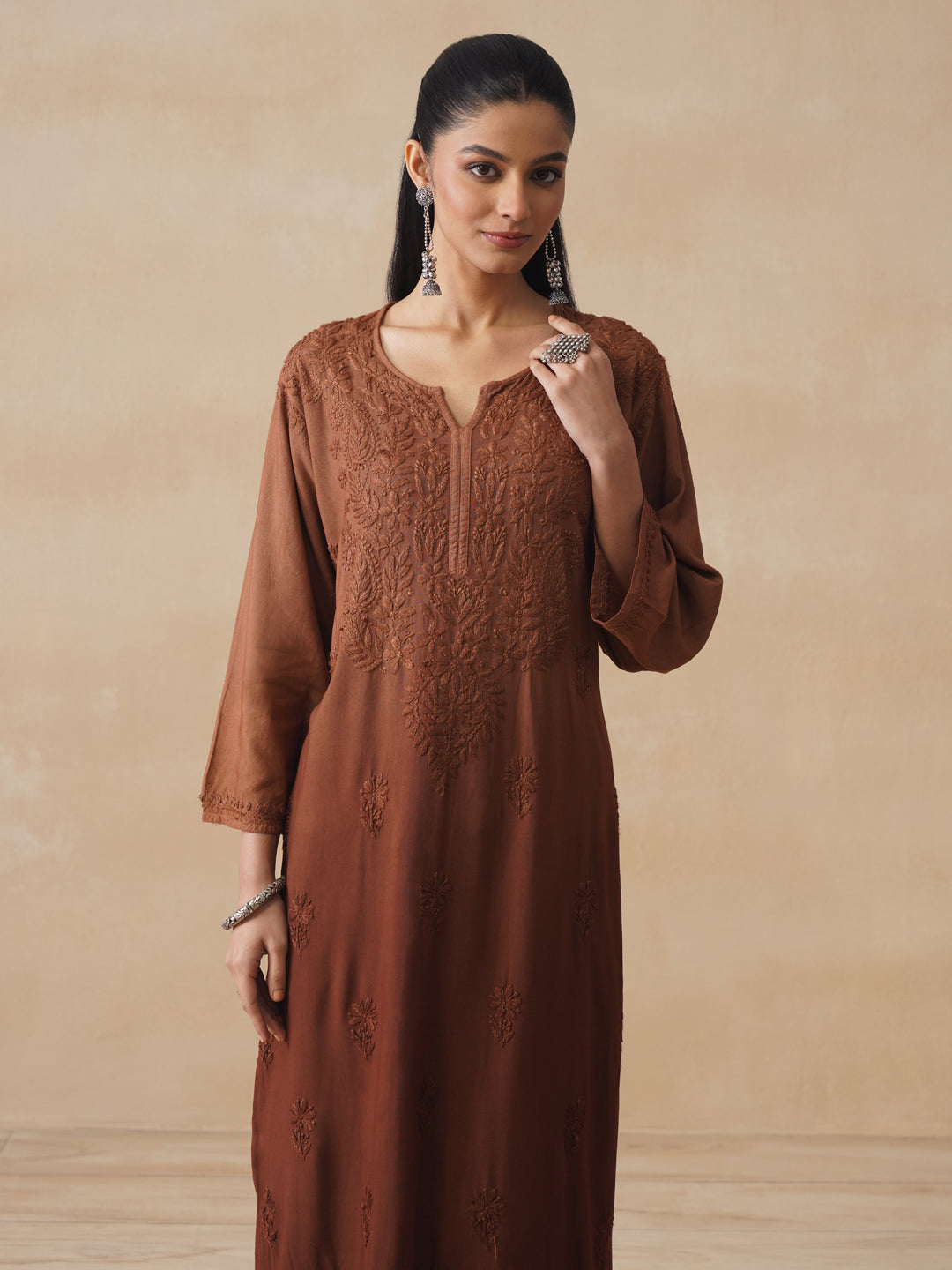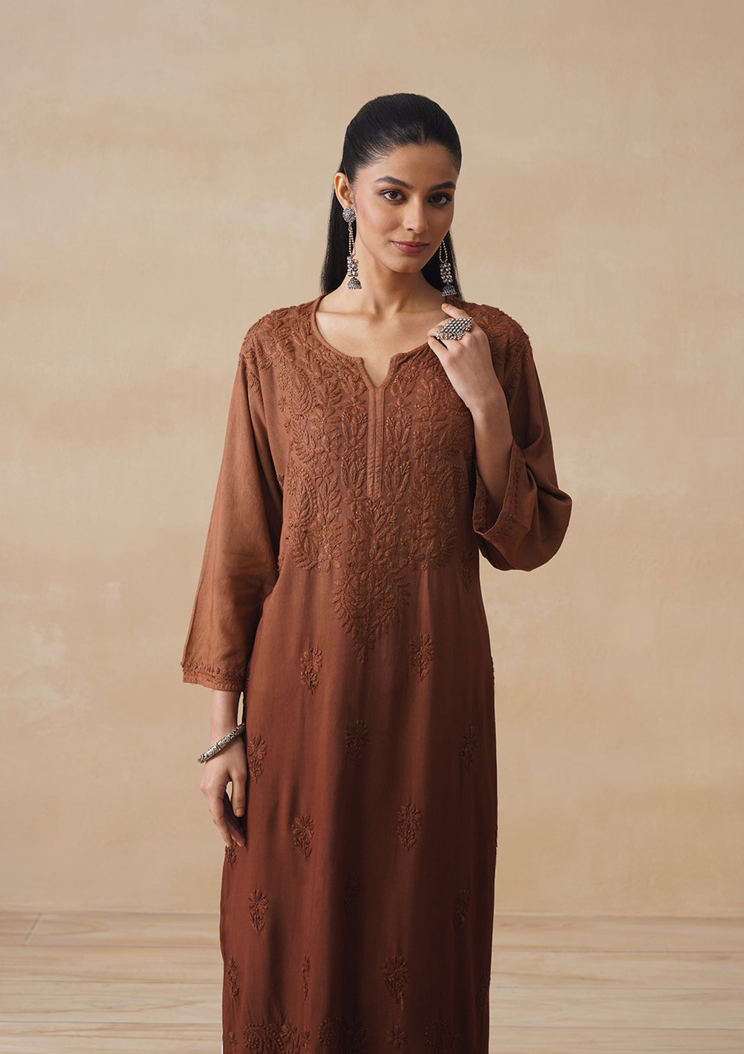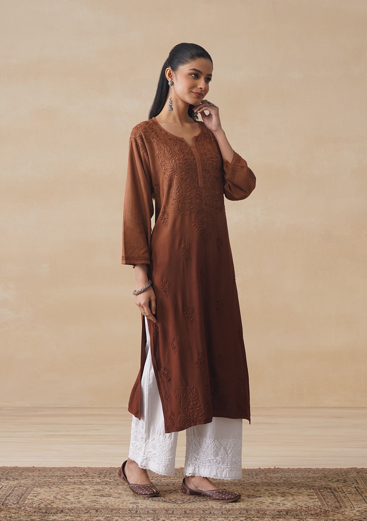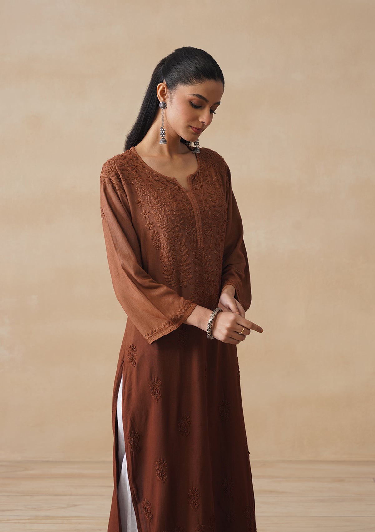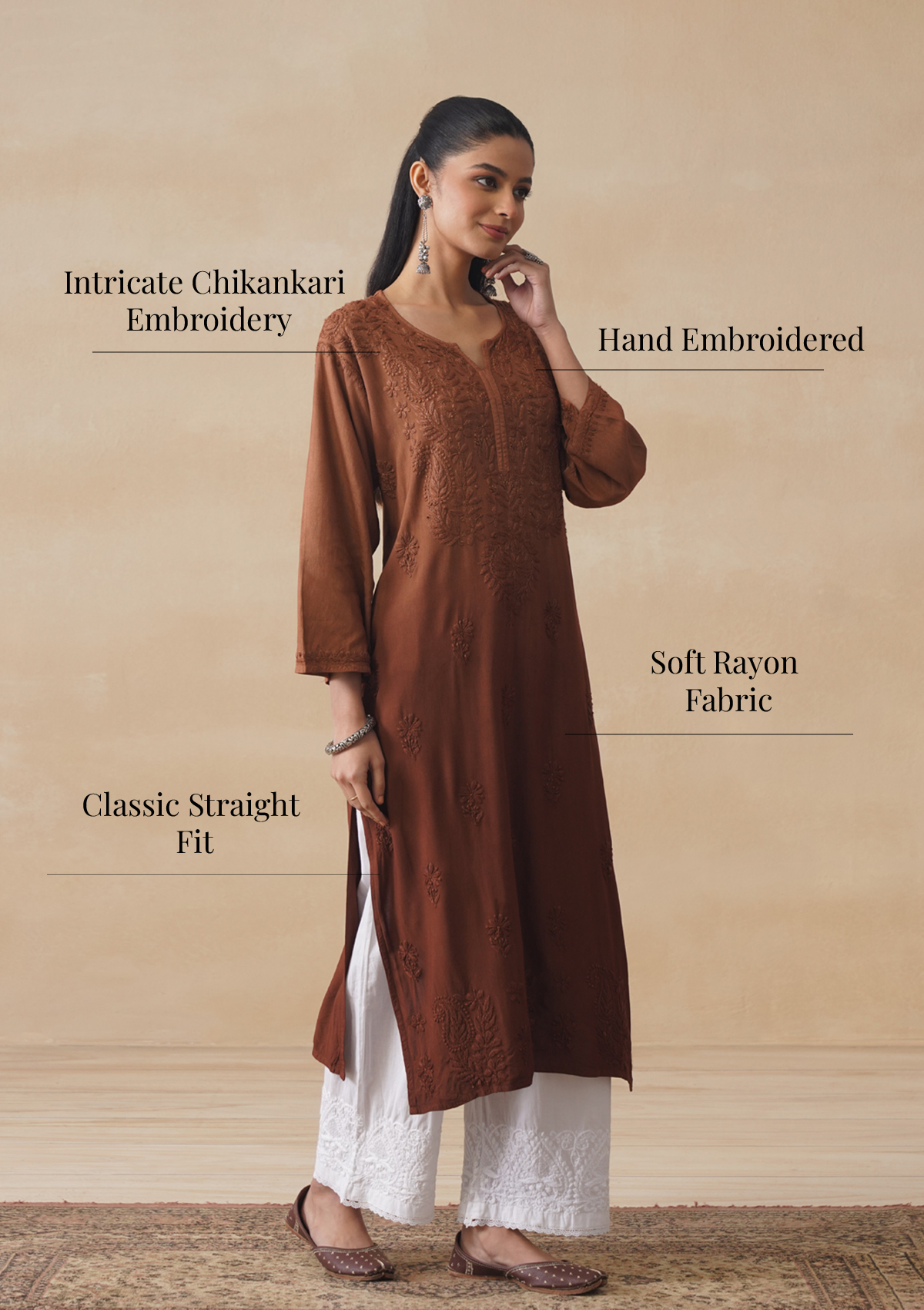 HOC Rayon Chikankari Solid Women's Long Kurta - Brown
