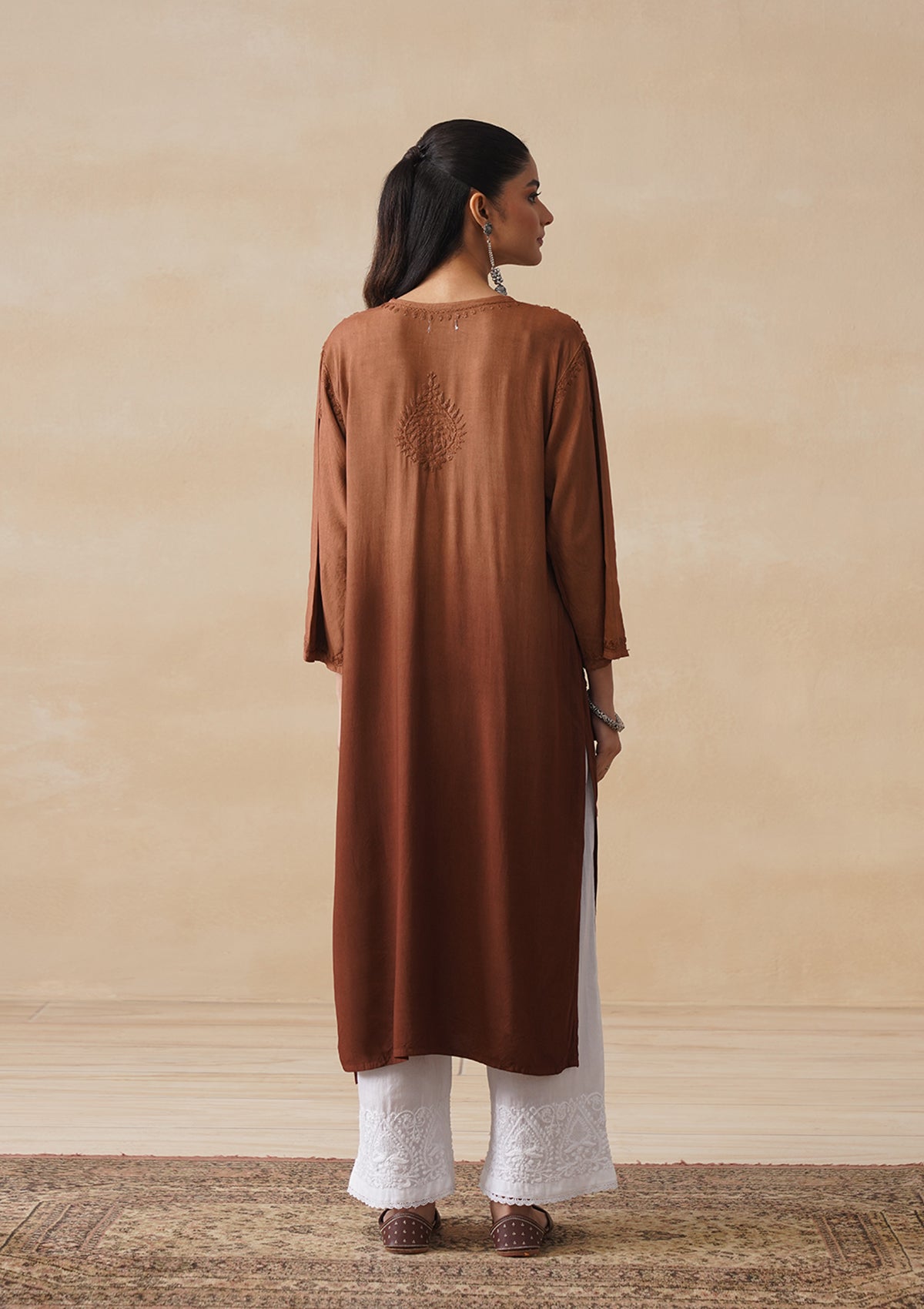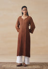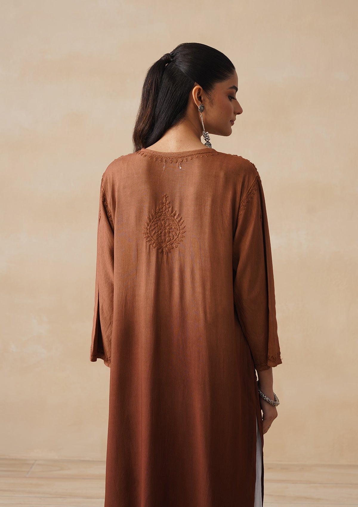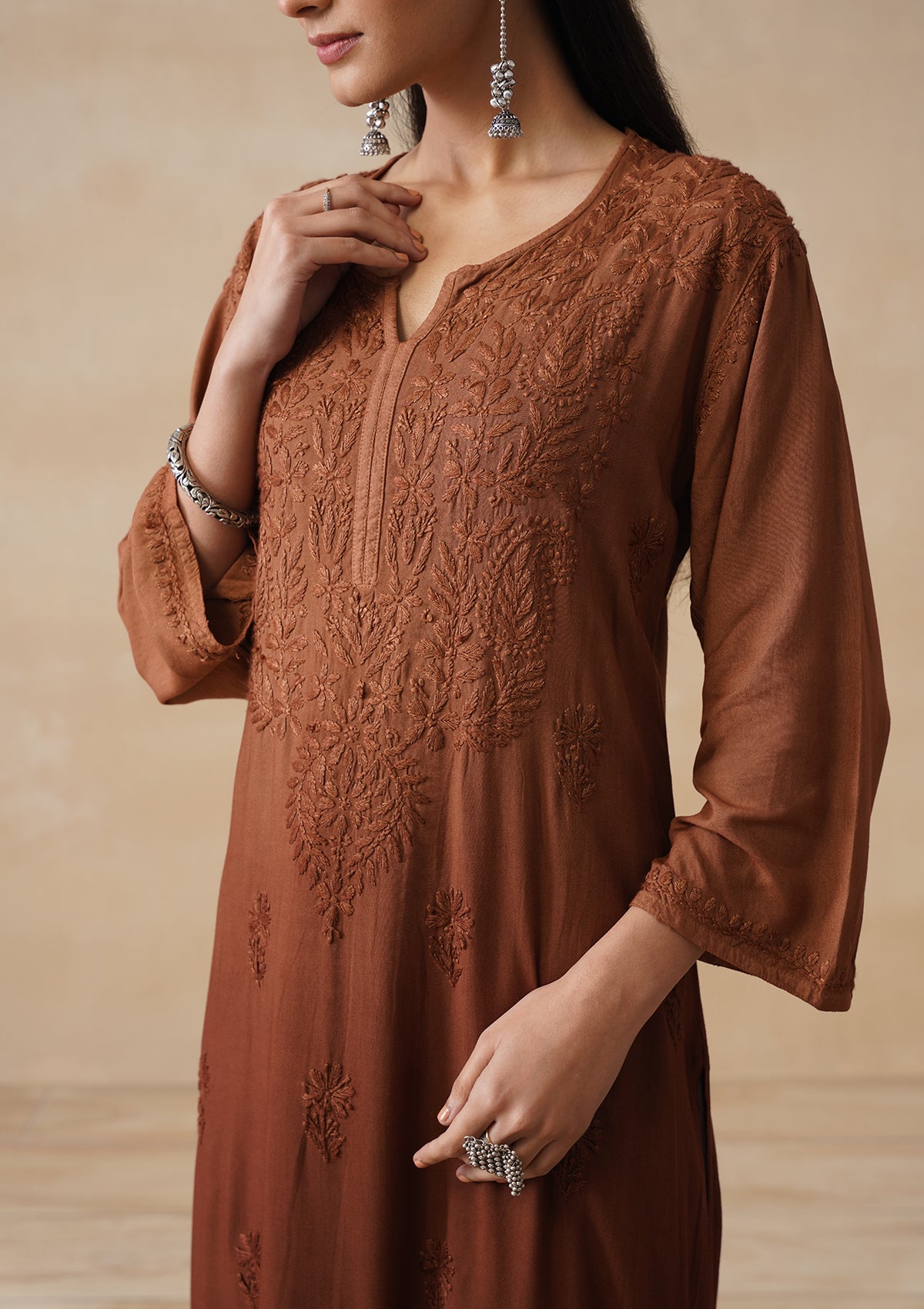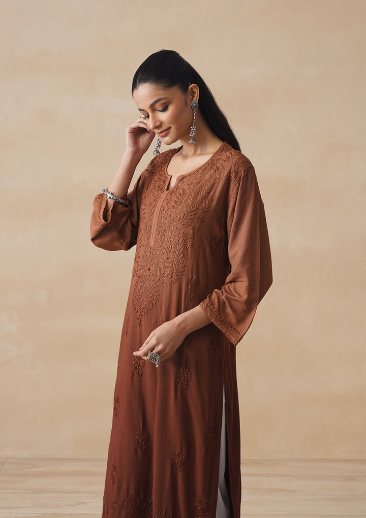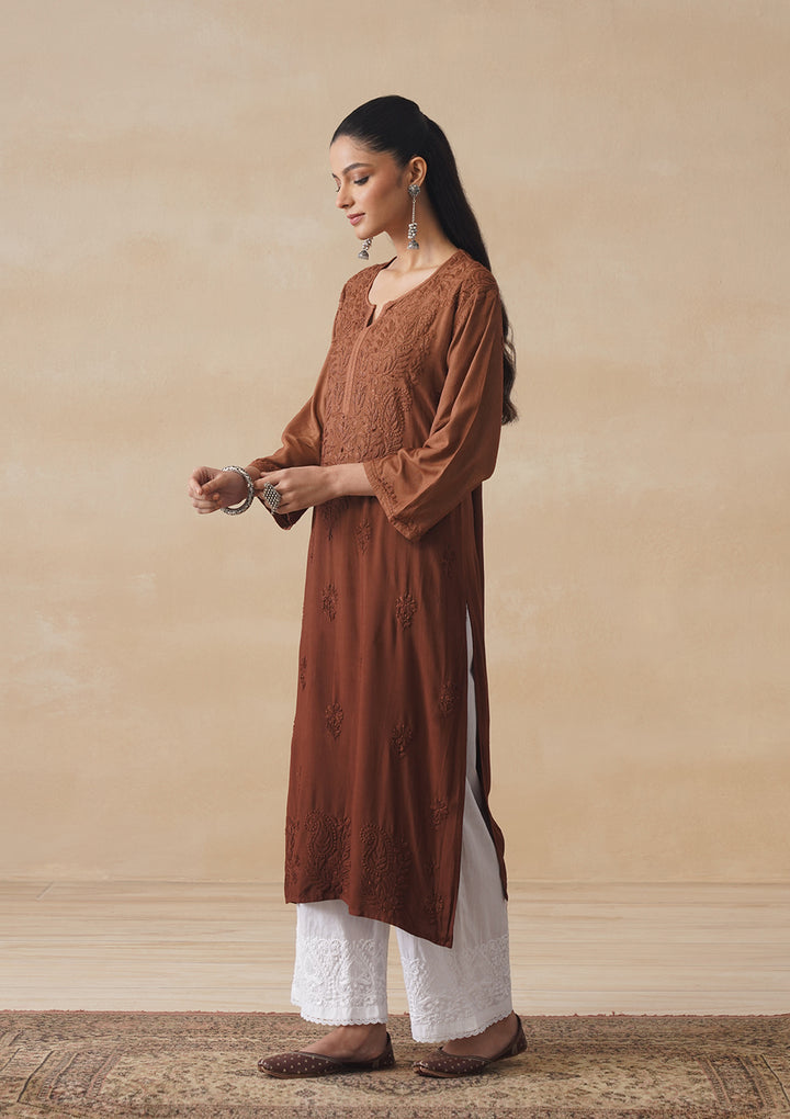 HOC Rayon Chikankari Solid Women's Long Kurta - Brown