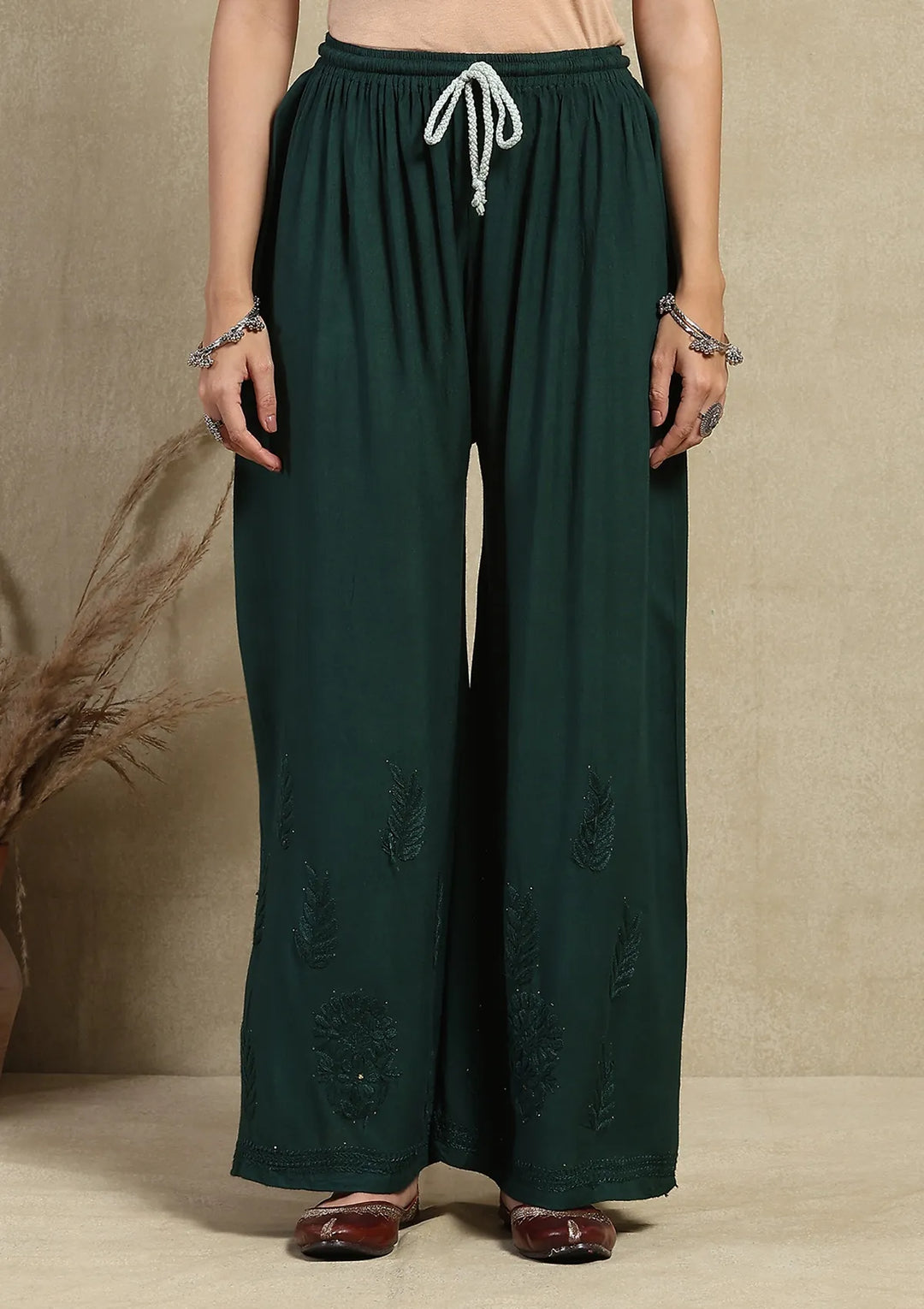 HOC Rayon Chikankari Mukaish Solid Women's 2PC Long Kurta Set - Dark Green