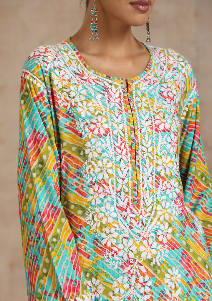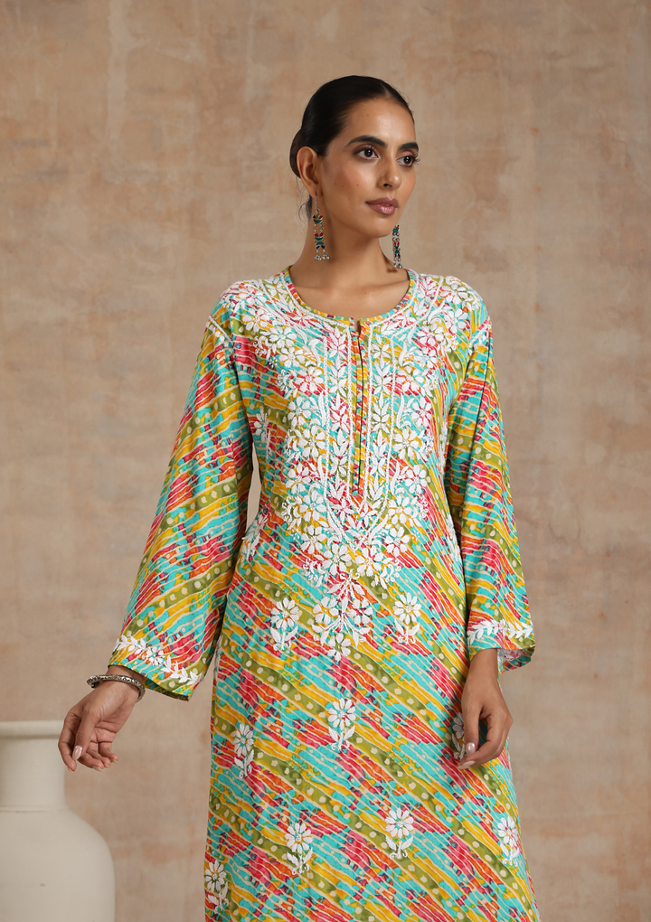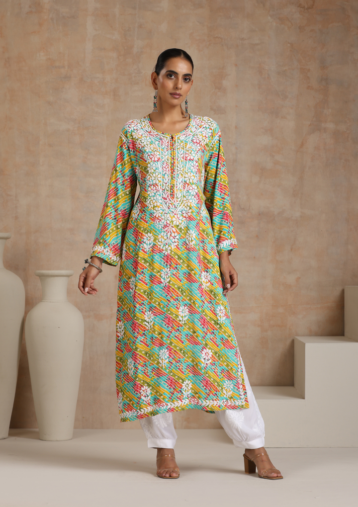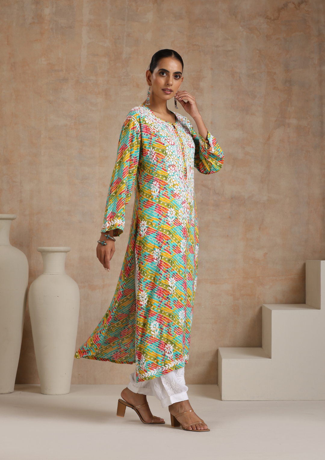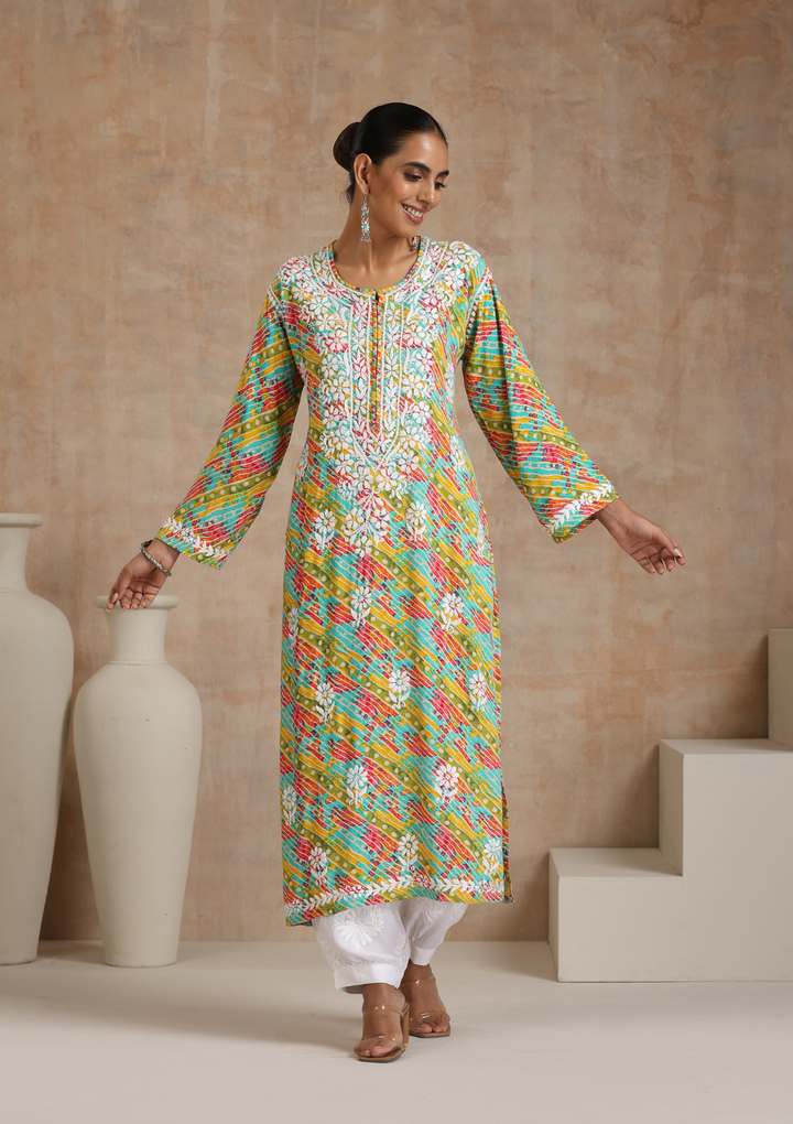 HOC Rayon Chikankari Printed Women's Long Kurta - Dark Green