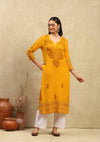 HOC Rayon Chikankari Printed Women's Long Kurta - Mustard Yellow