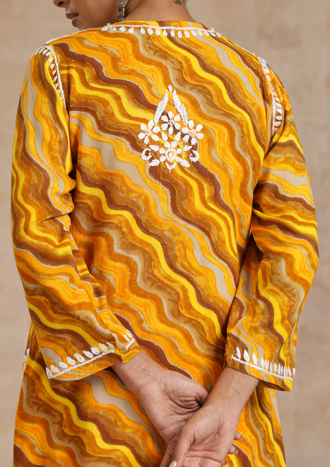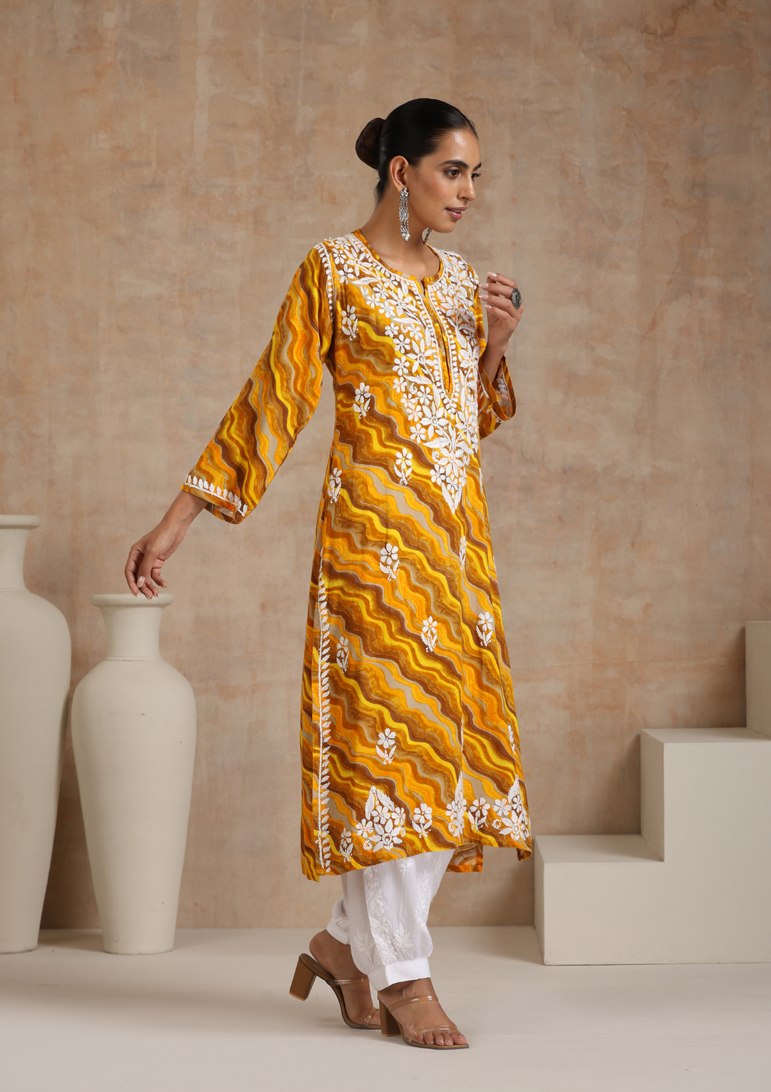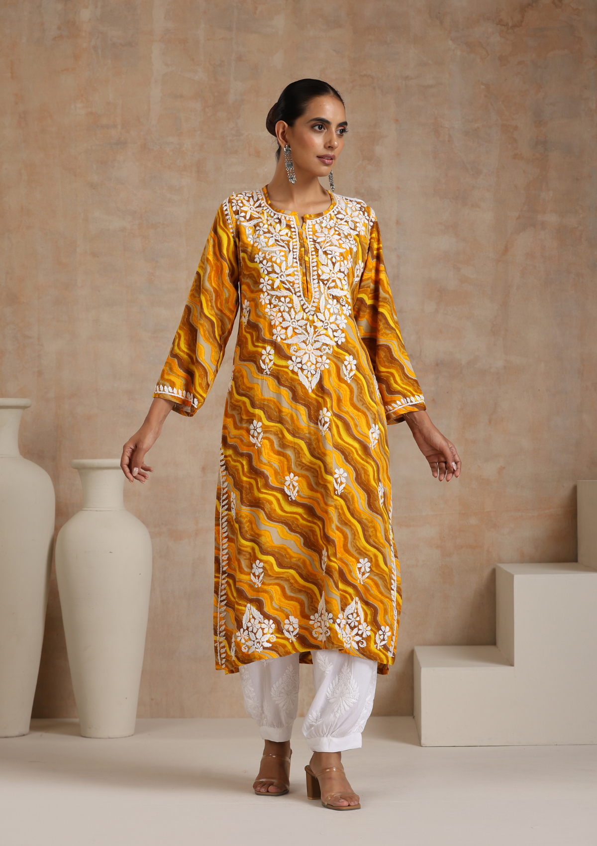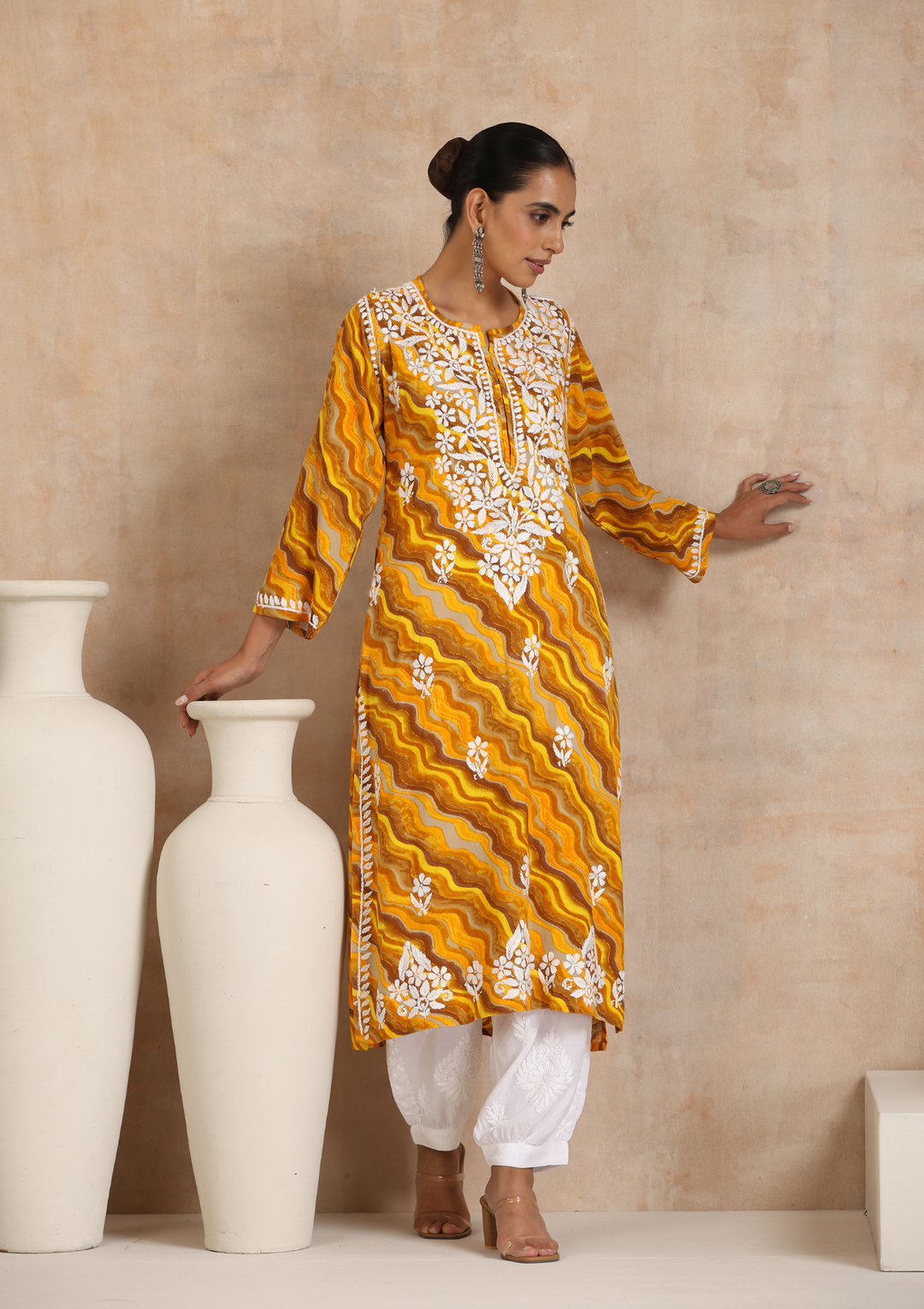 HOC Rayon Chikankari Printed Women's Long Kurta - Yellow