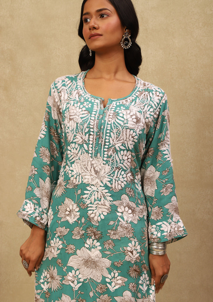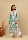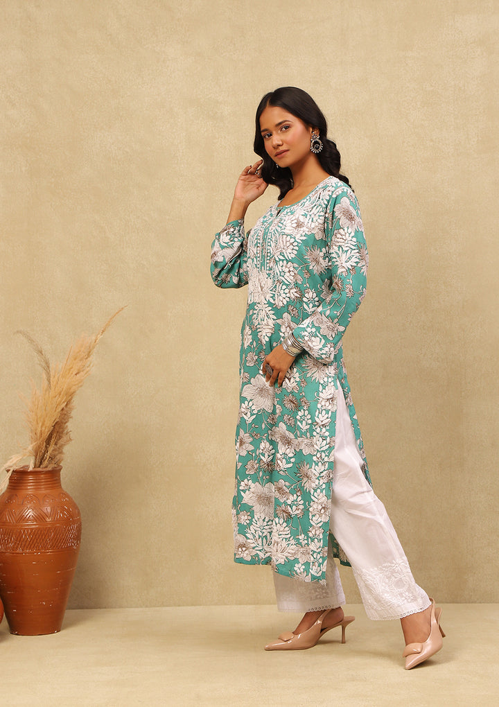 HOC Rayon Chikankari Printed Women's Long Kurta -Mint Green