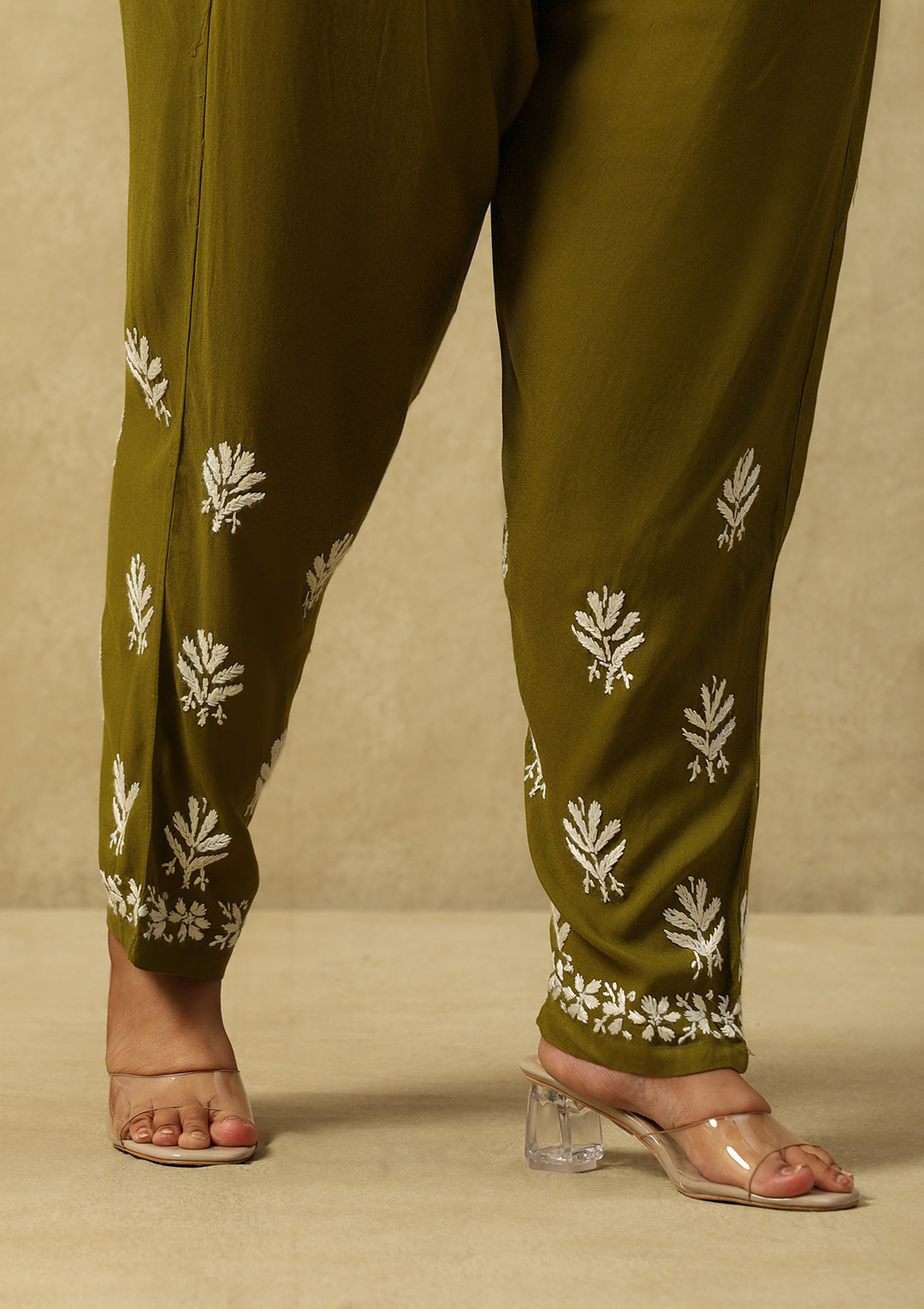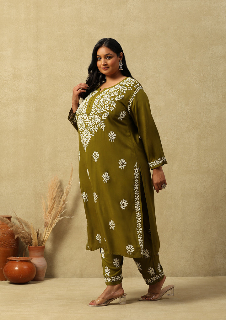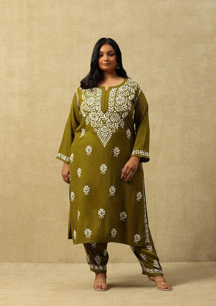 HOC Rayon Chikankari Solid Women's 2 PC Long Kurta Set-Olive Green