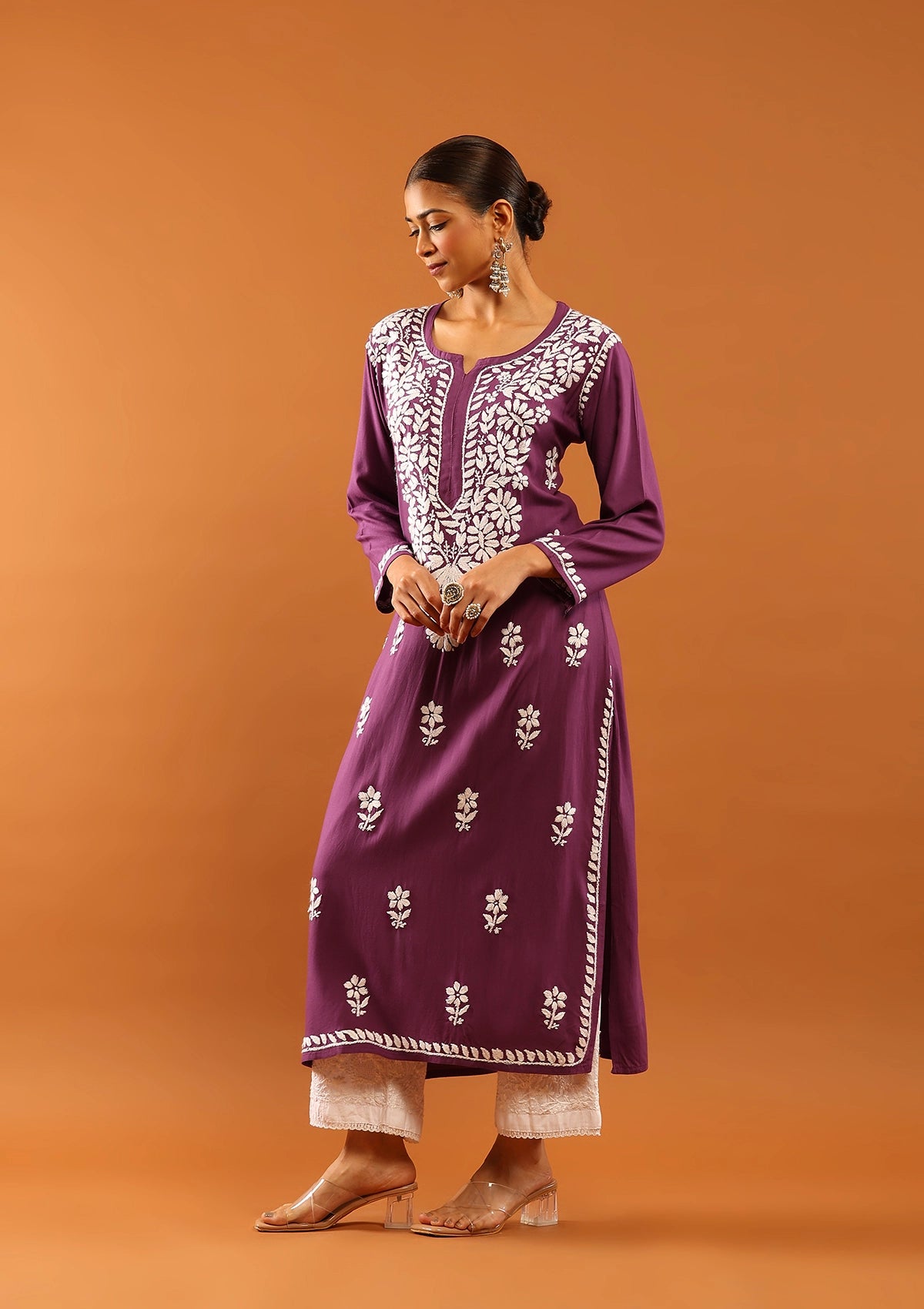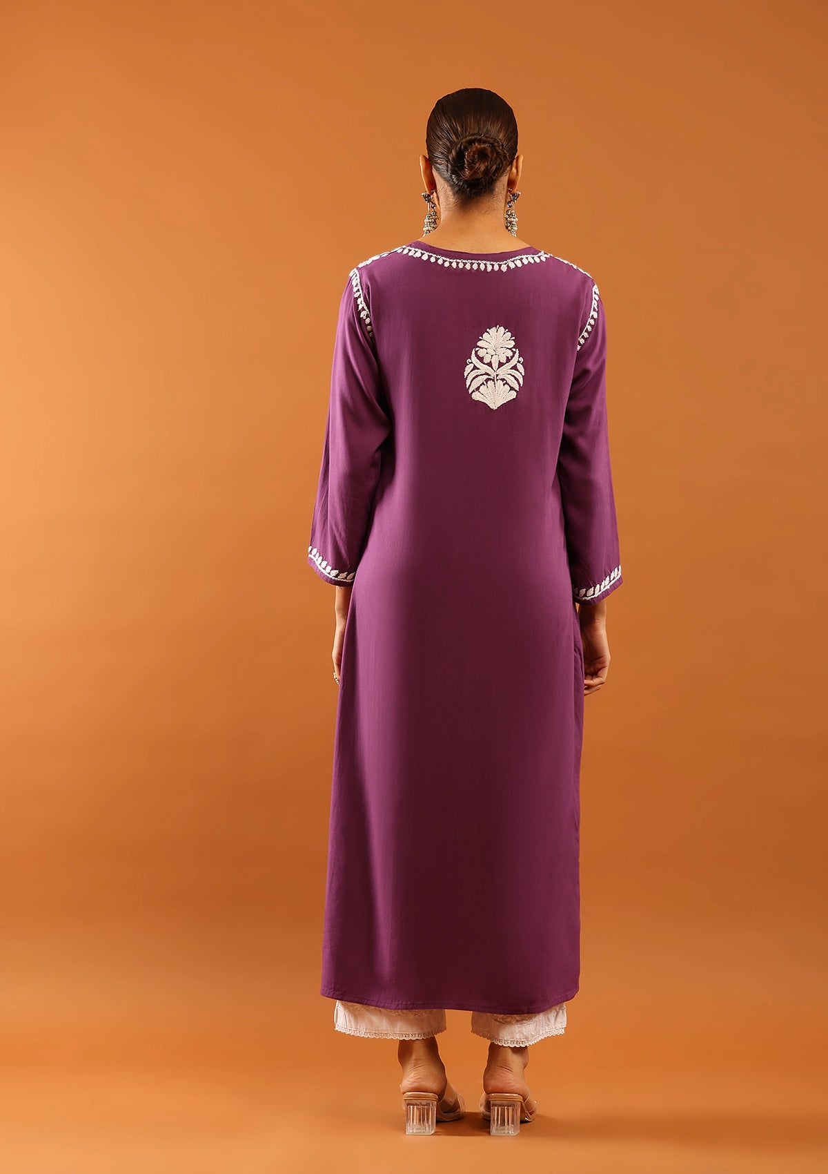 HOC Rayon Chikankari Solid Women's Long Kurta -Dark Purple