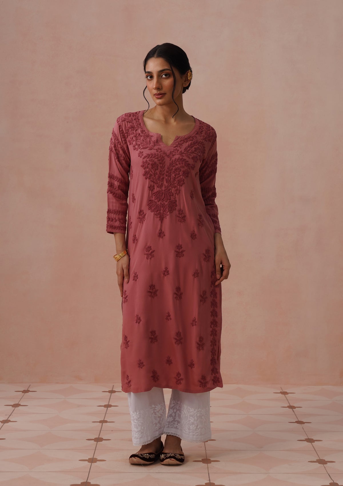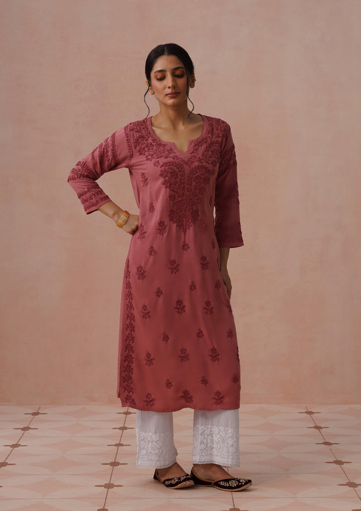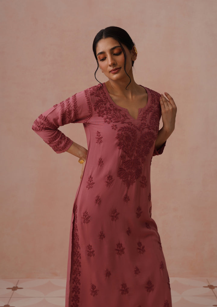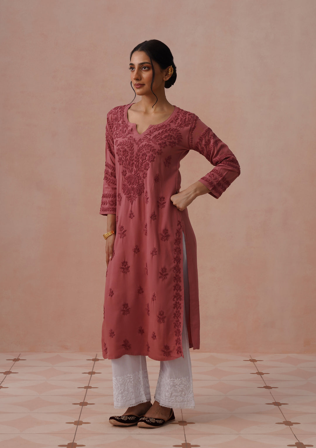 HOC Rayon Chikankari Solid Women's Long Kurta - Peach