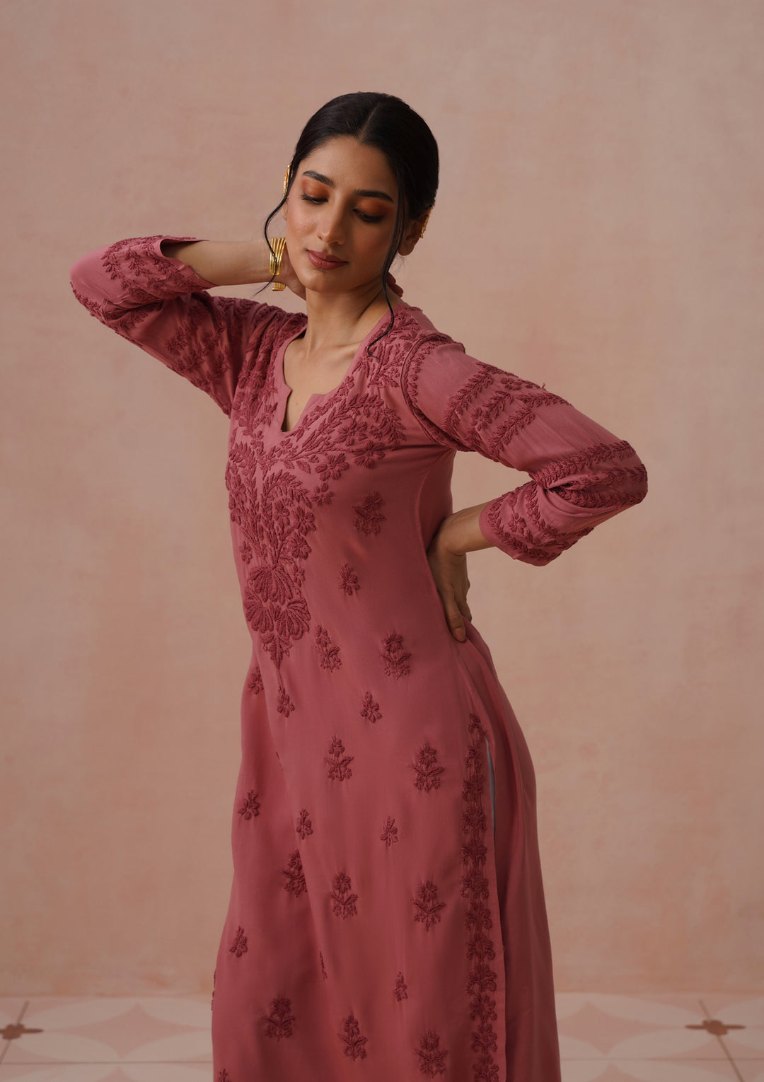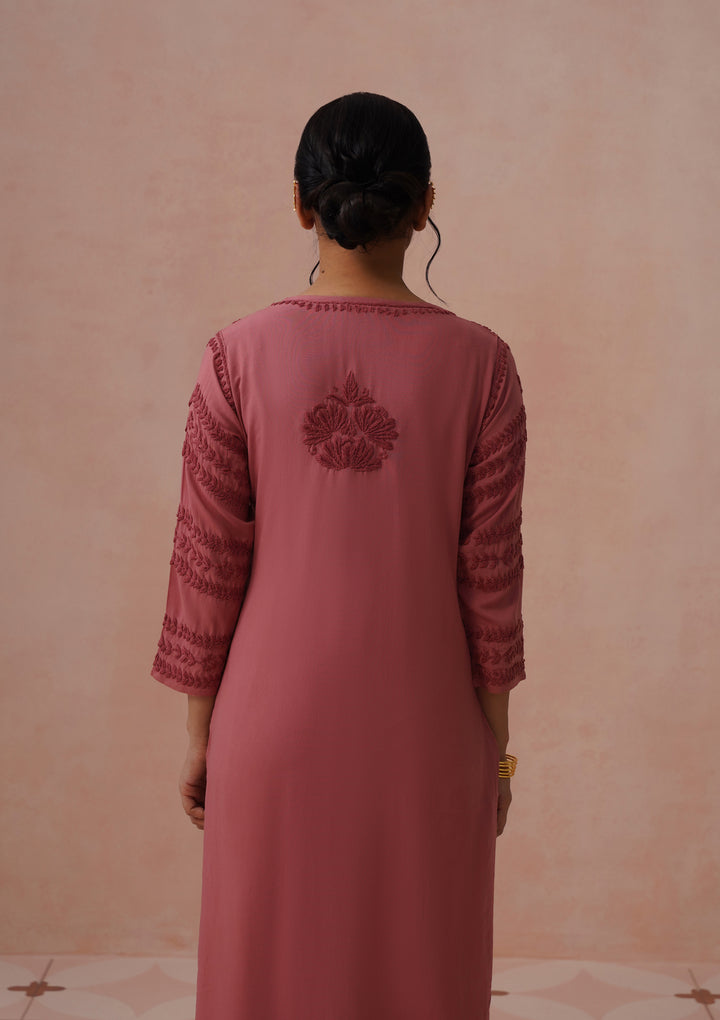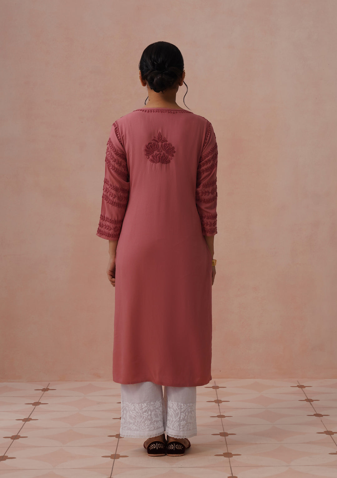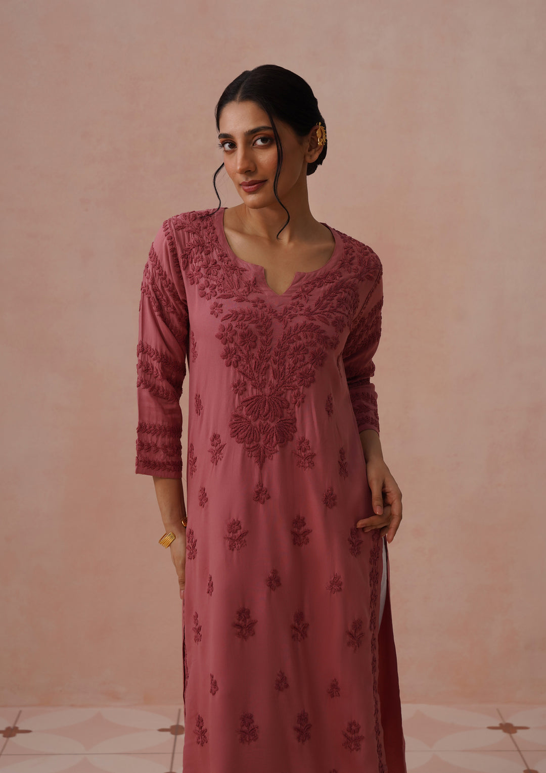 HOC Rayon Chikankari Solid Women's Long Kurta - Peach