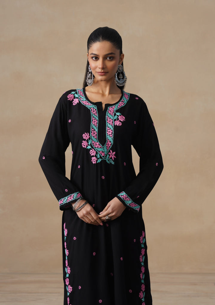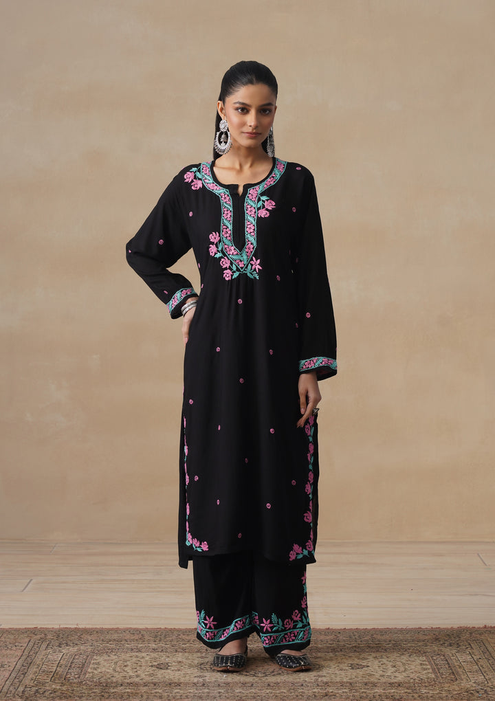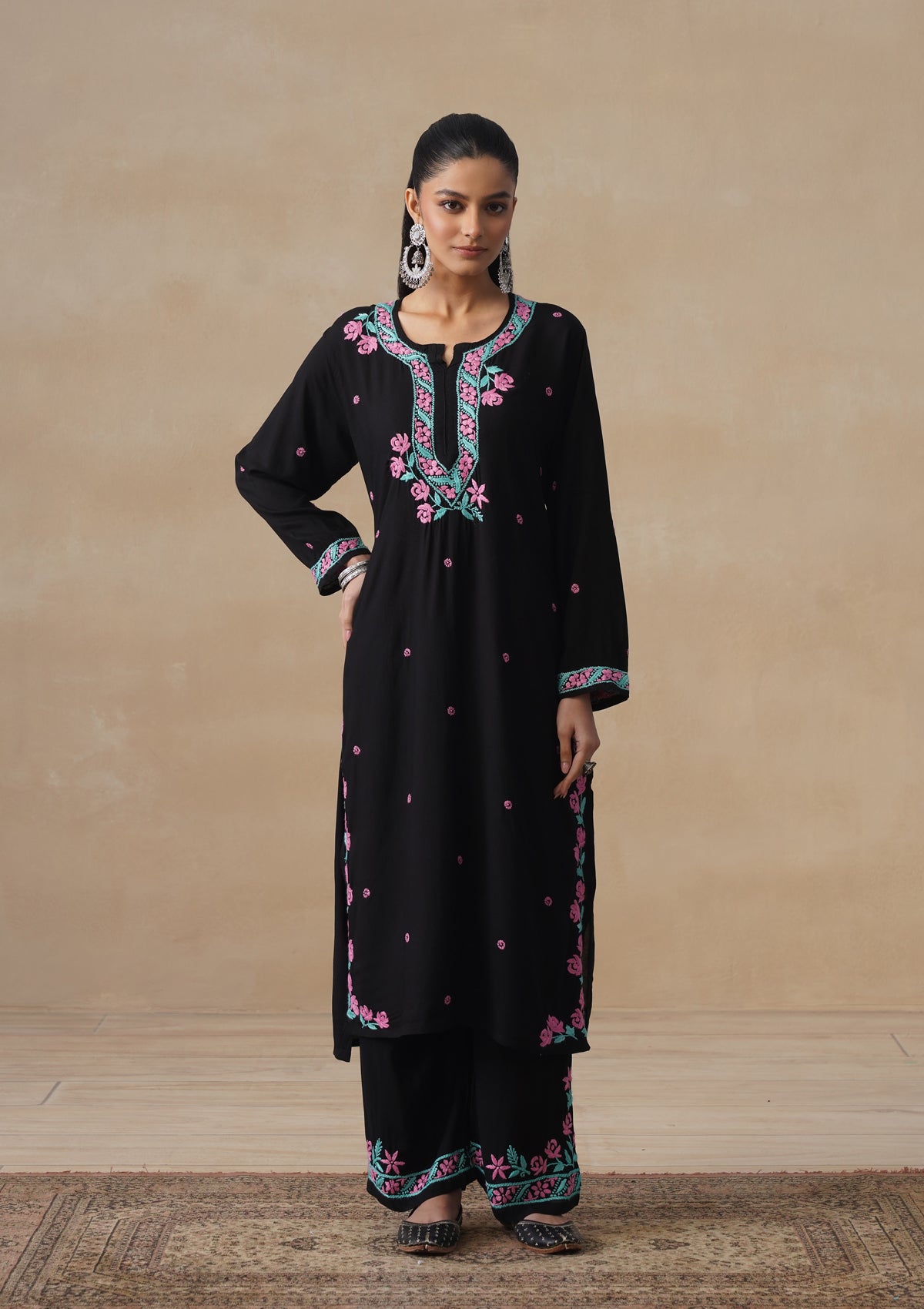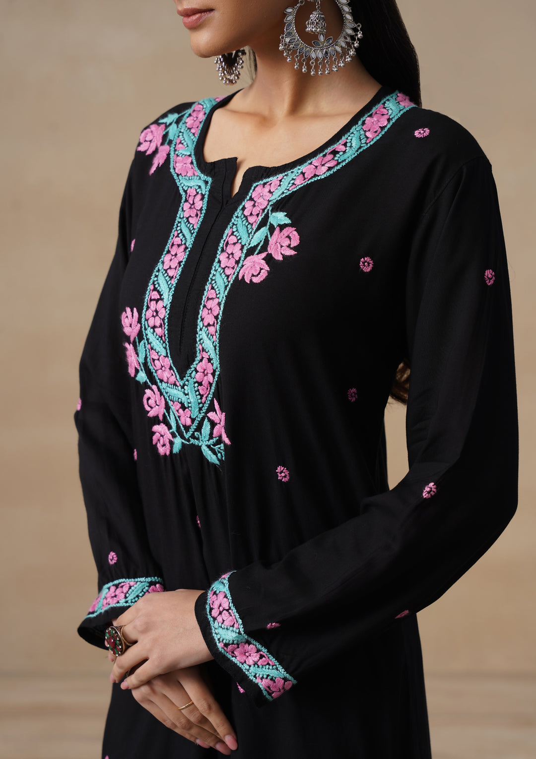 HOC Rayon Chikankari Solid Women's Long Kurta Set - Black