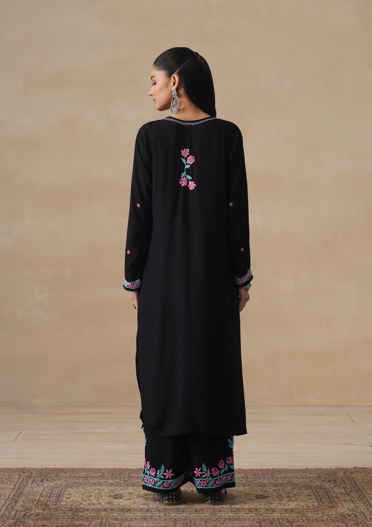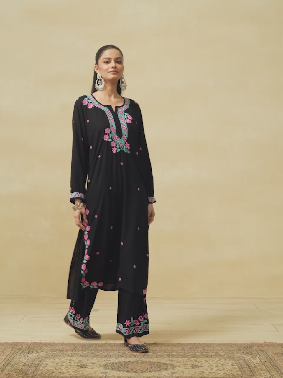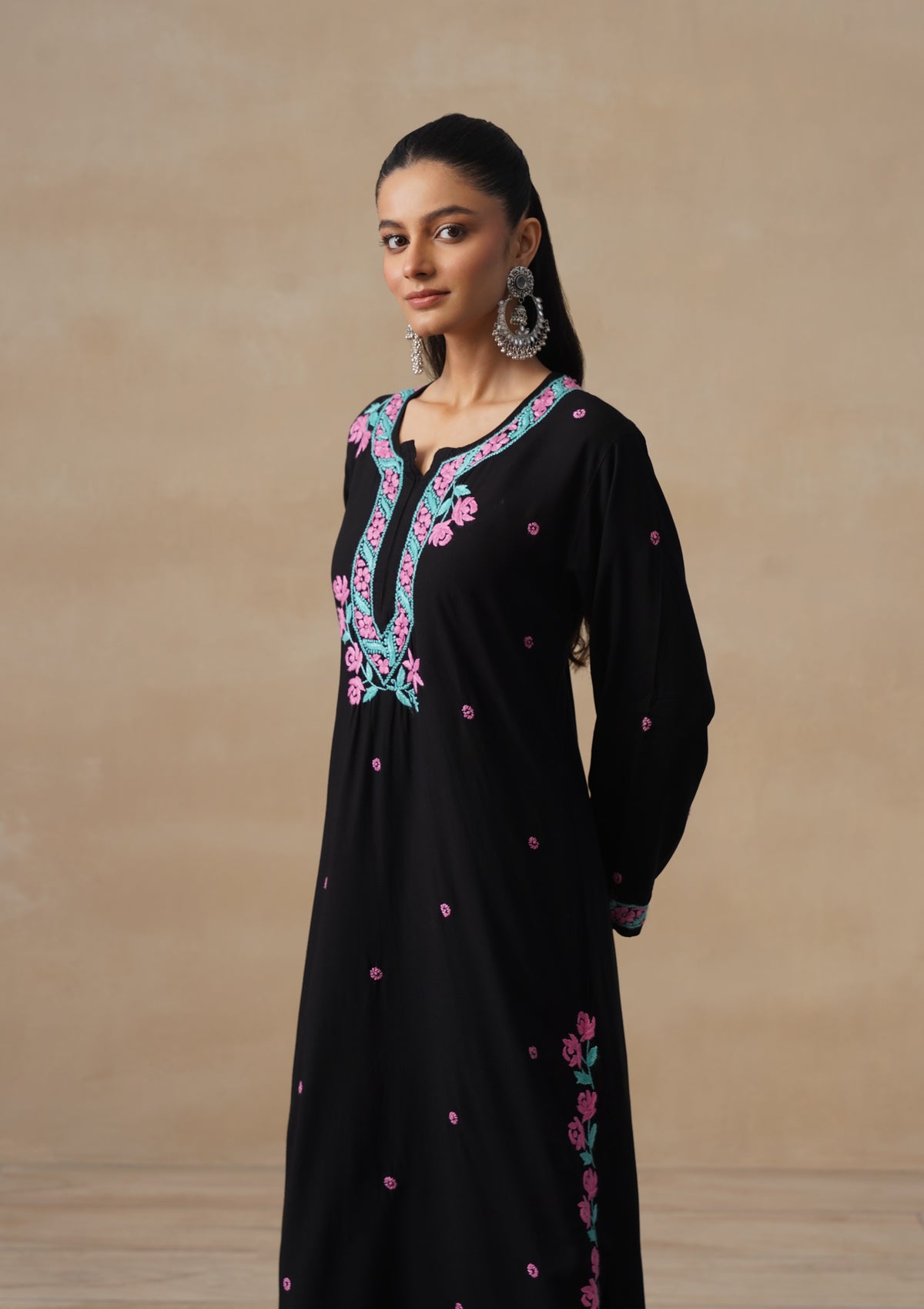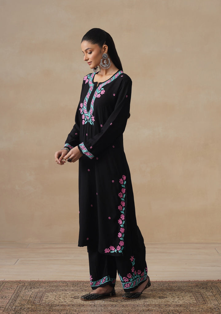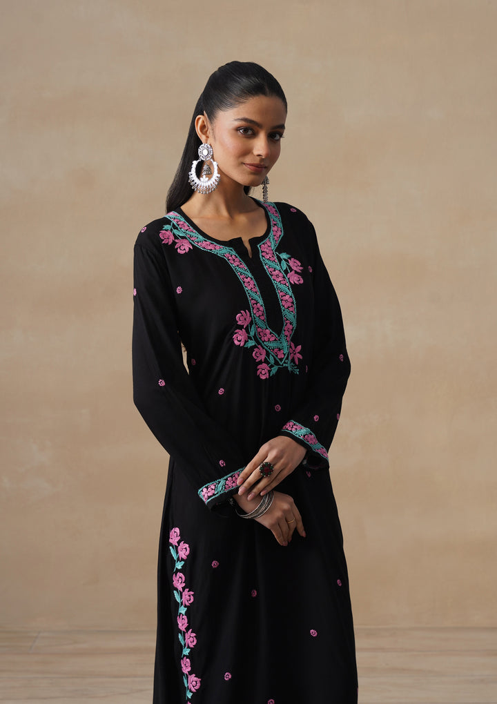 HOC Rayon Chikankari Solid Women's Long Kurta Set - Black
