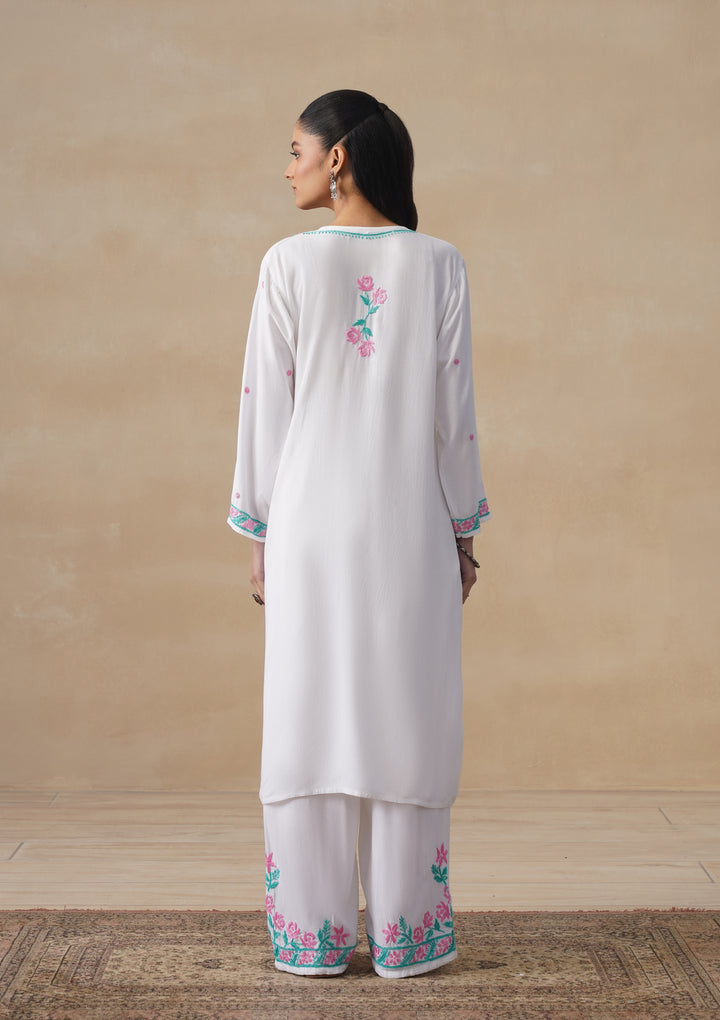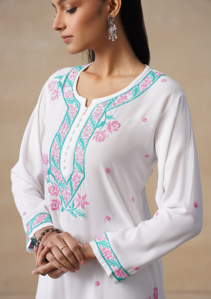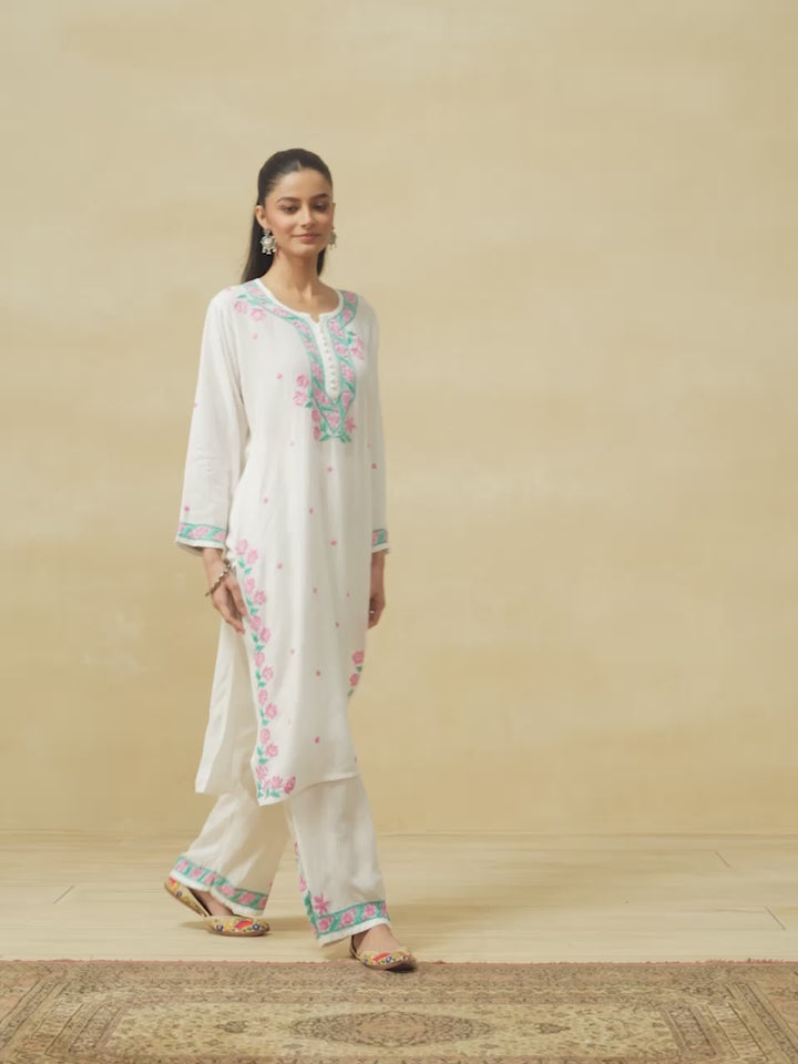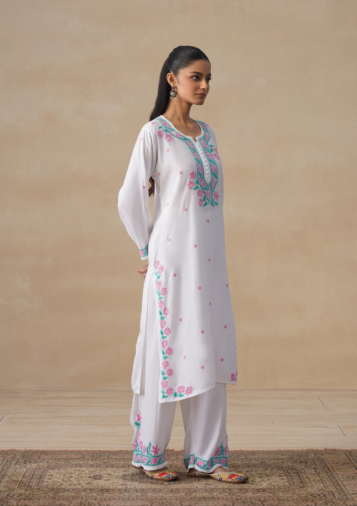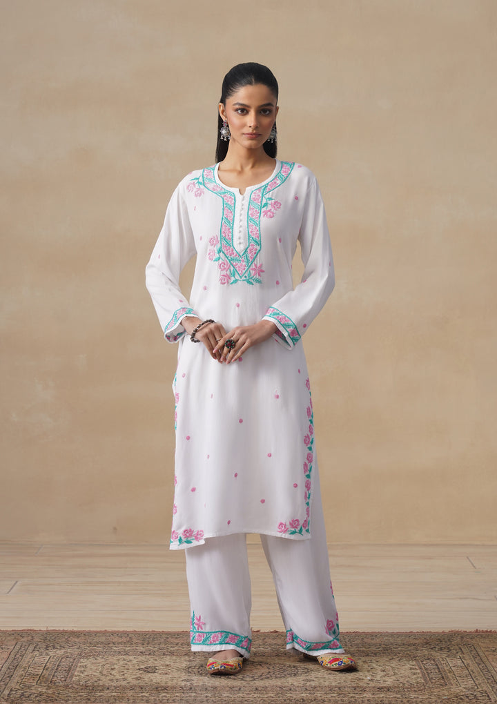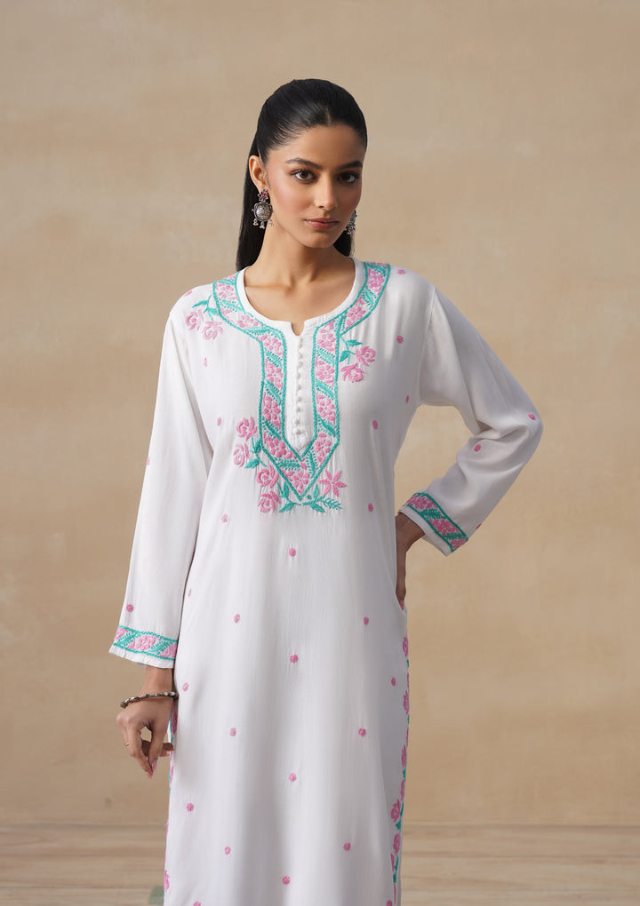HOC Rayon Chikankari Solid Women's Long Kurta Set - White