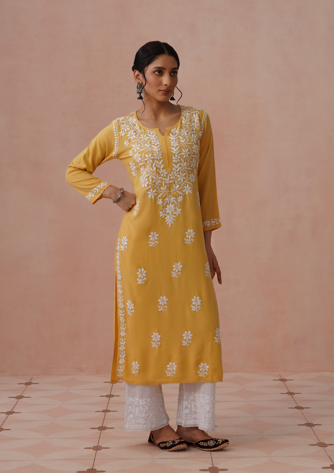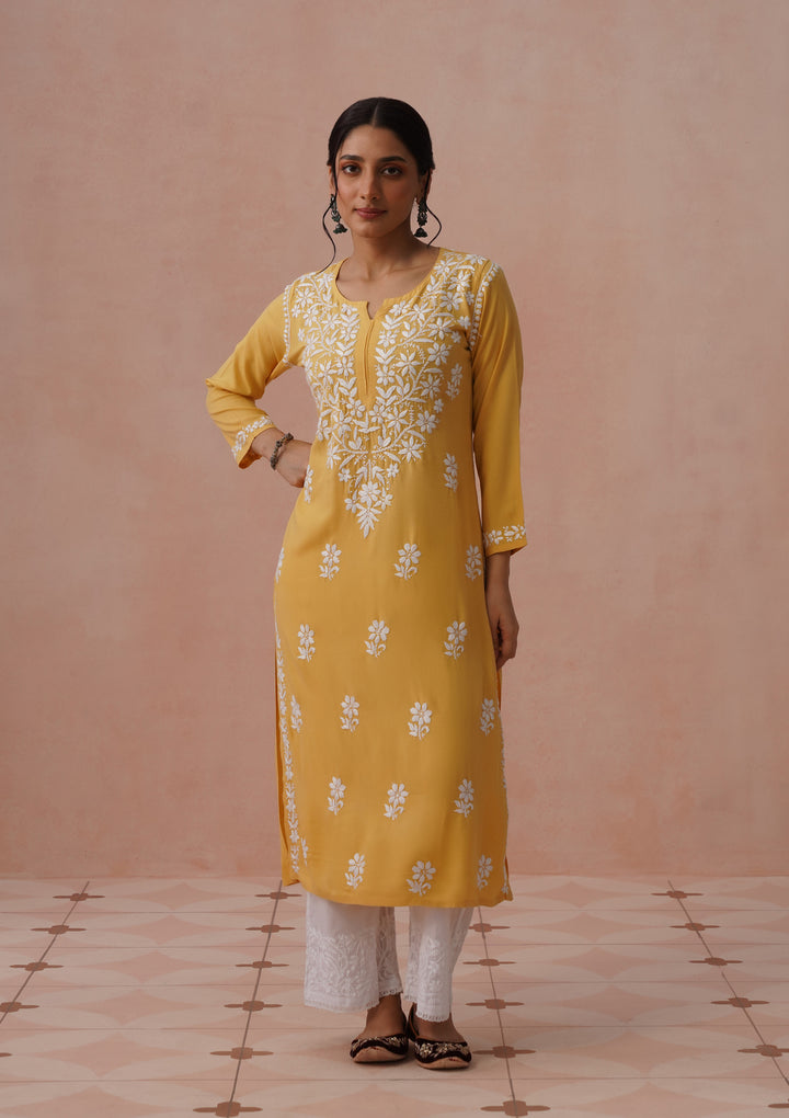 HOC Rayon Chikankari Solid Women's Long Kurta - Yellow