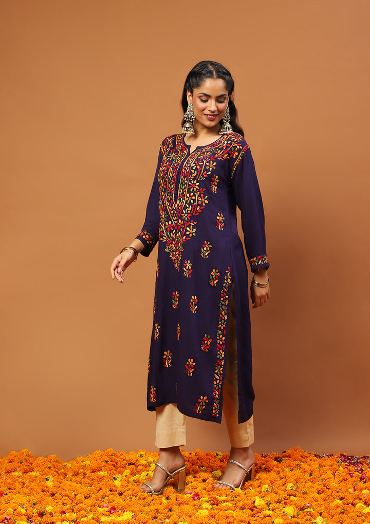HOC Rayon Chikankari Solid Women's Long Kurta -Dark Blue