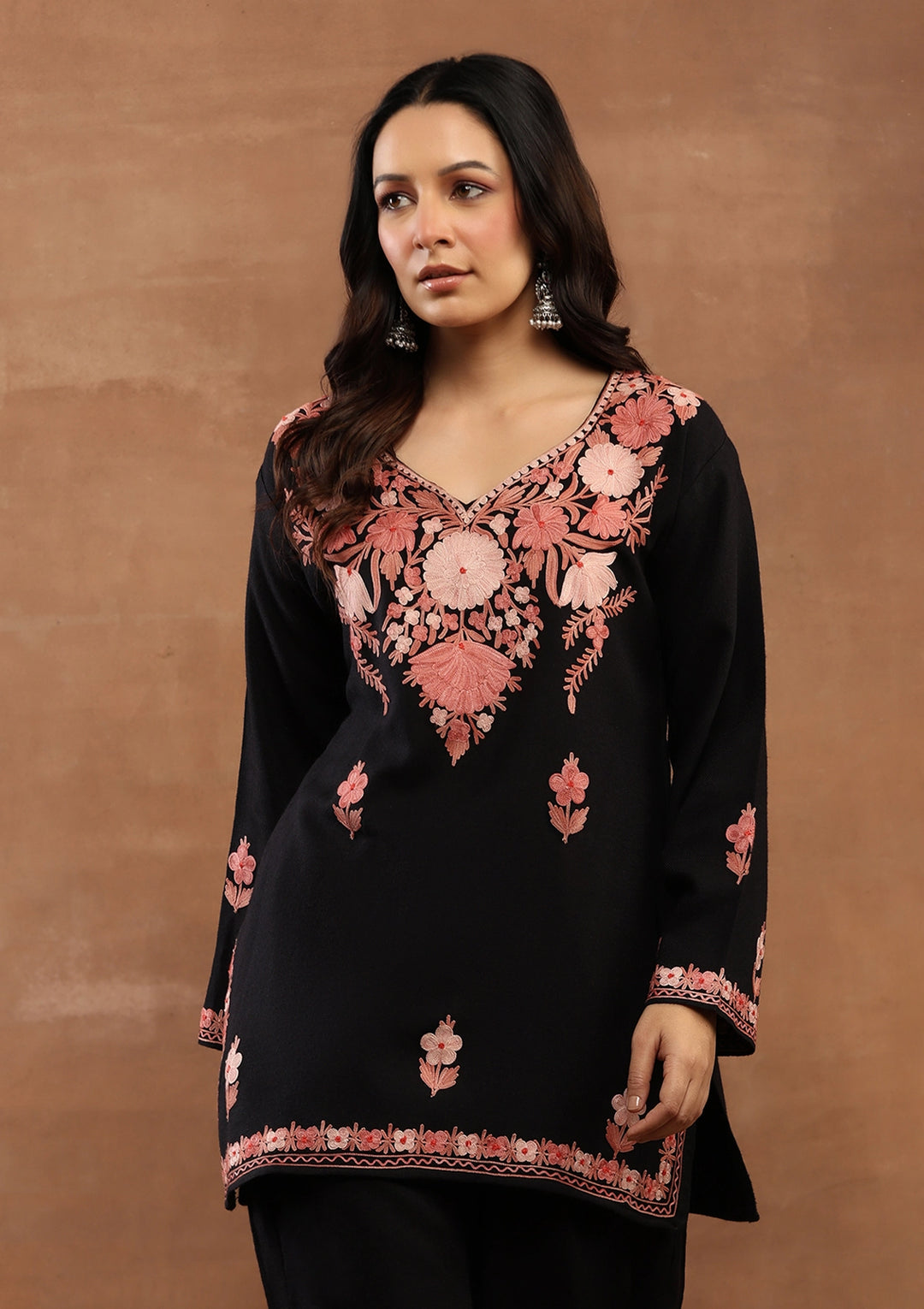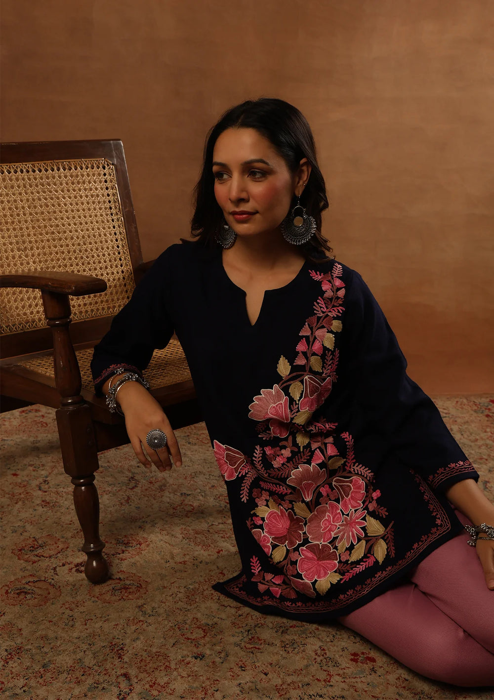 HOC Aari Embroidered Woollen Solid Women's Short Kurta - Turquoise Blue