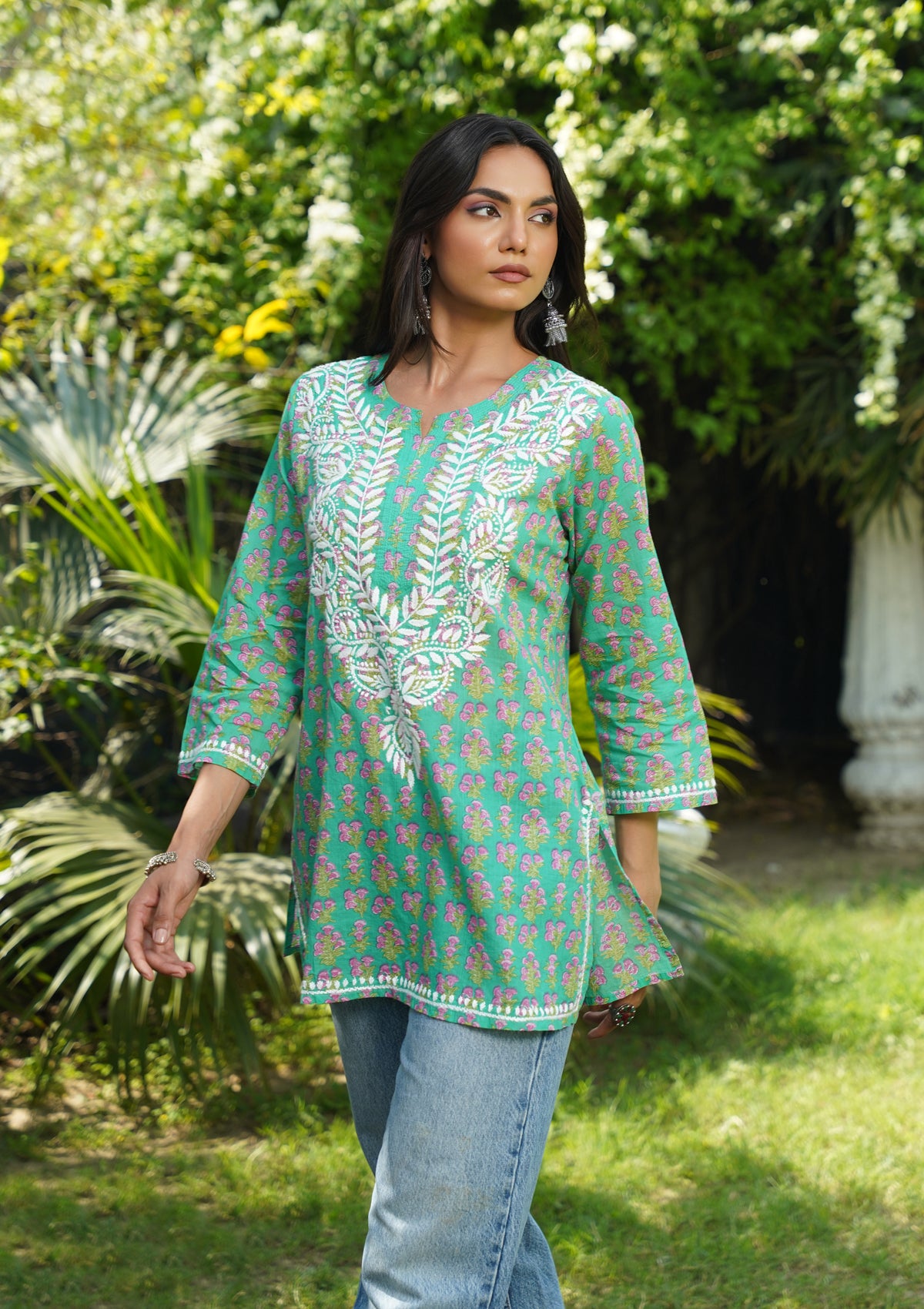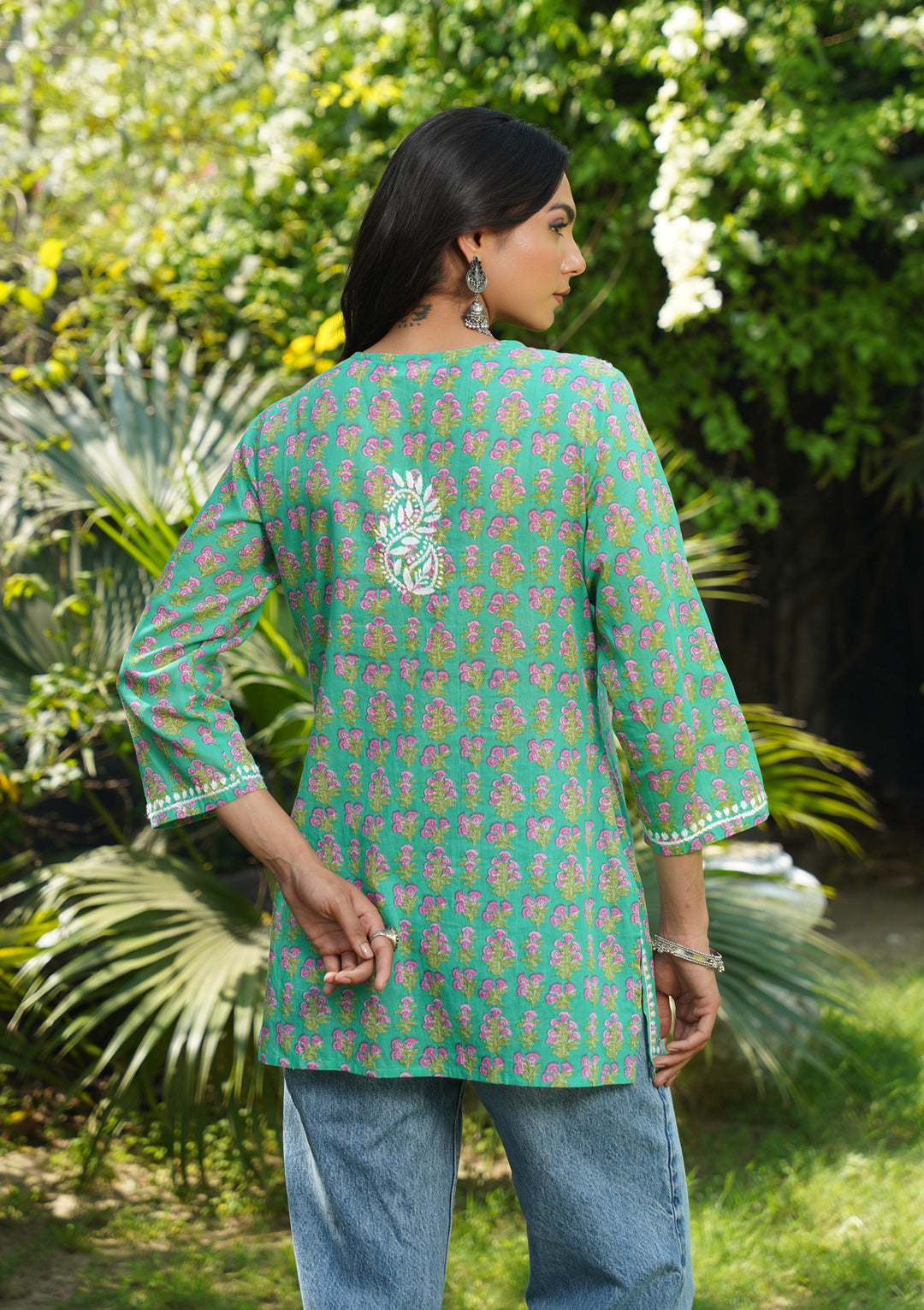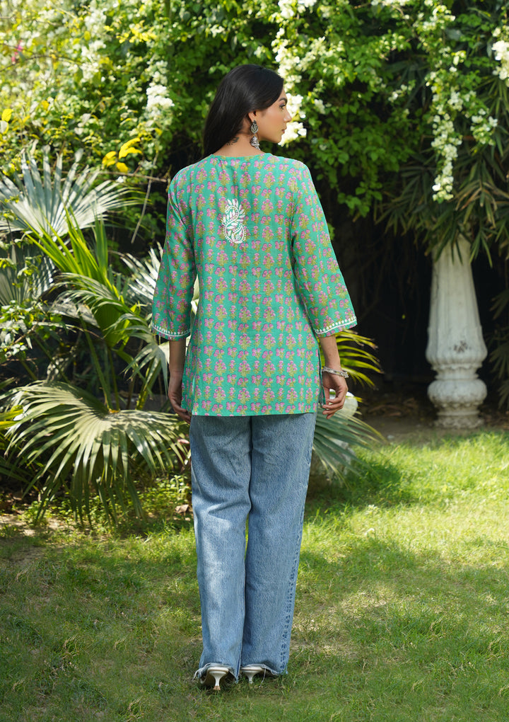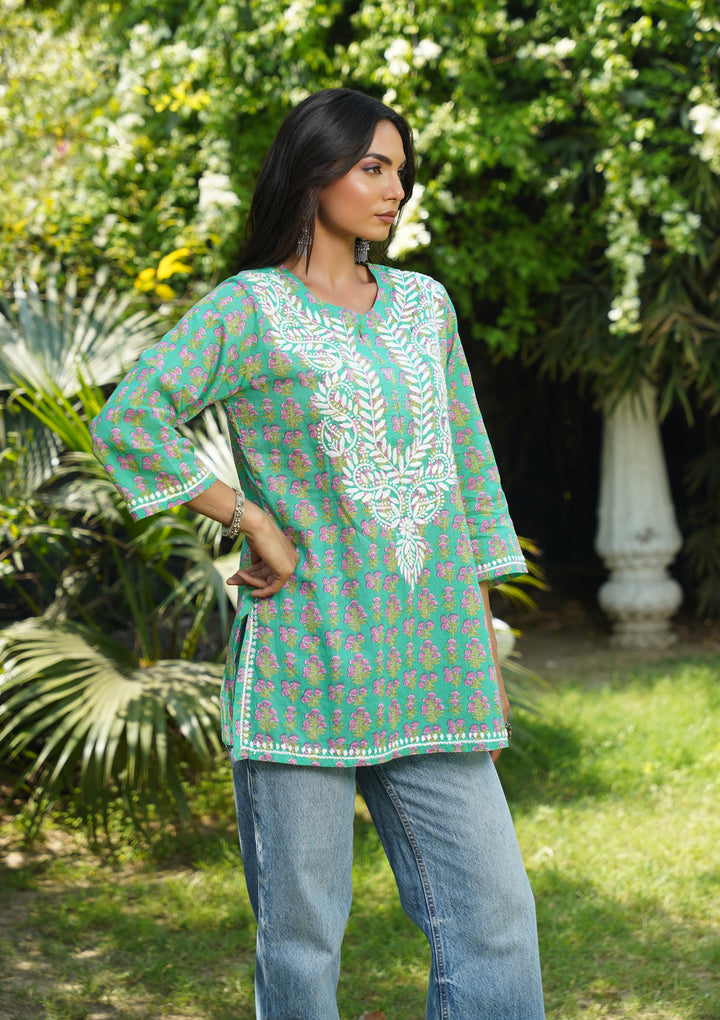 HOC Cotton Chikankari Printed Straight Women's Short Kurta-Teal