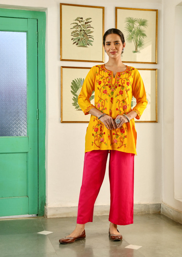 HOC Aari Embroidered Cotton Solid Women's Short Kurta - Yellow