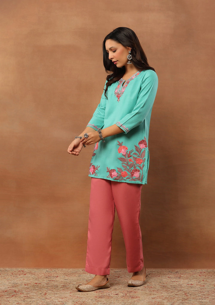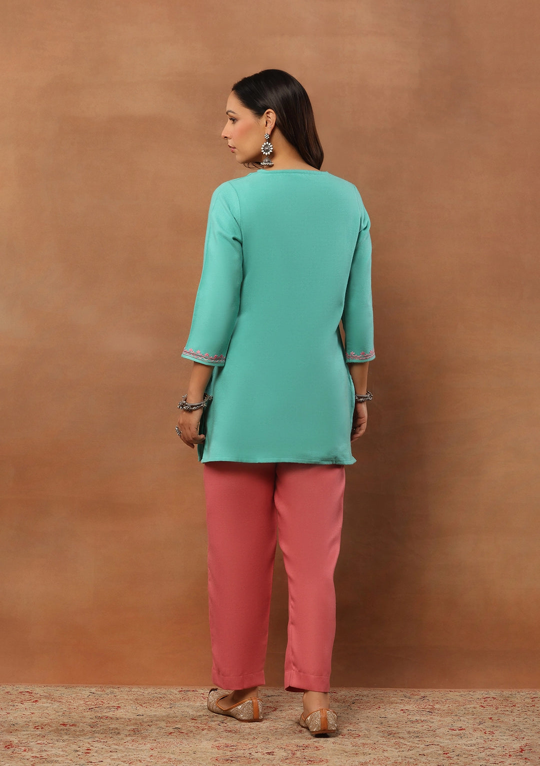 HOC Aari Embroidered Woollen Solid Women's Short Kurta - Turquoise Blue