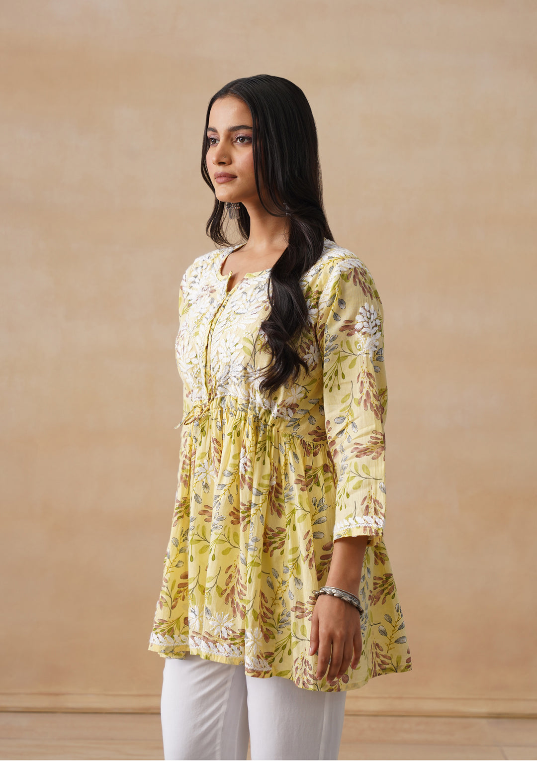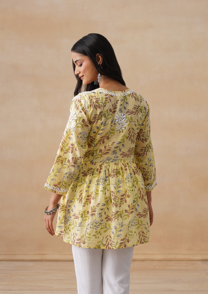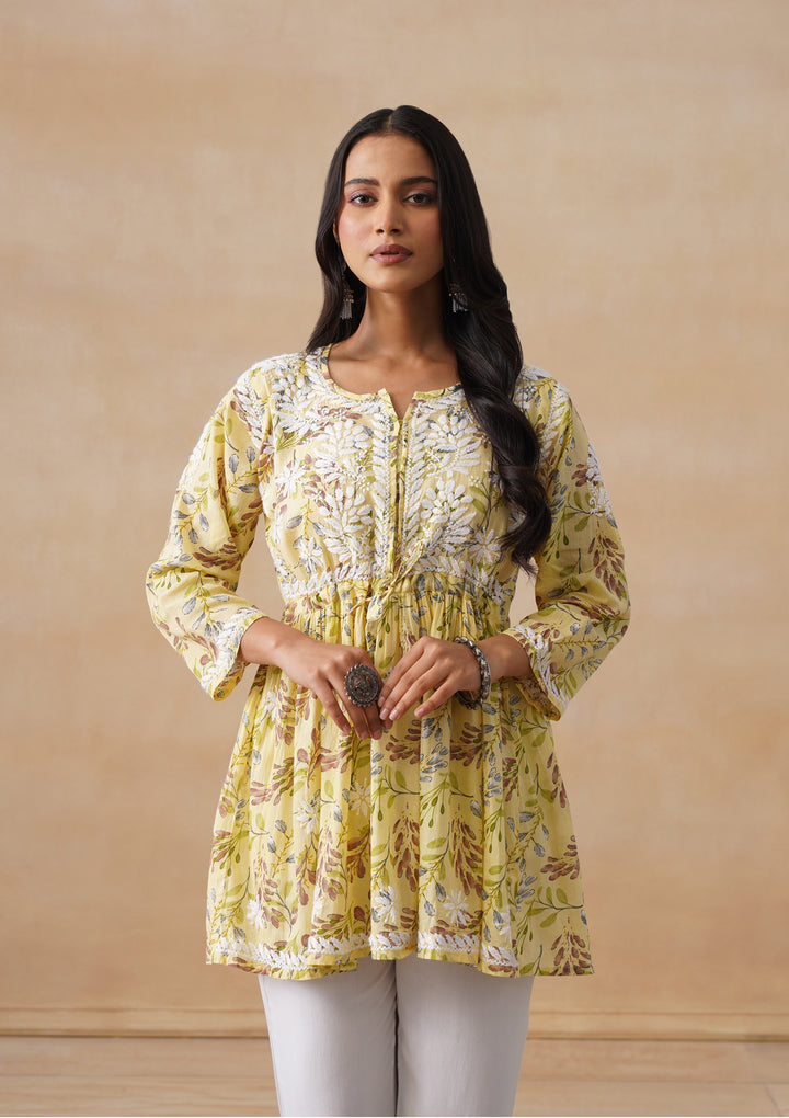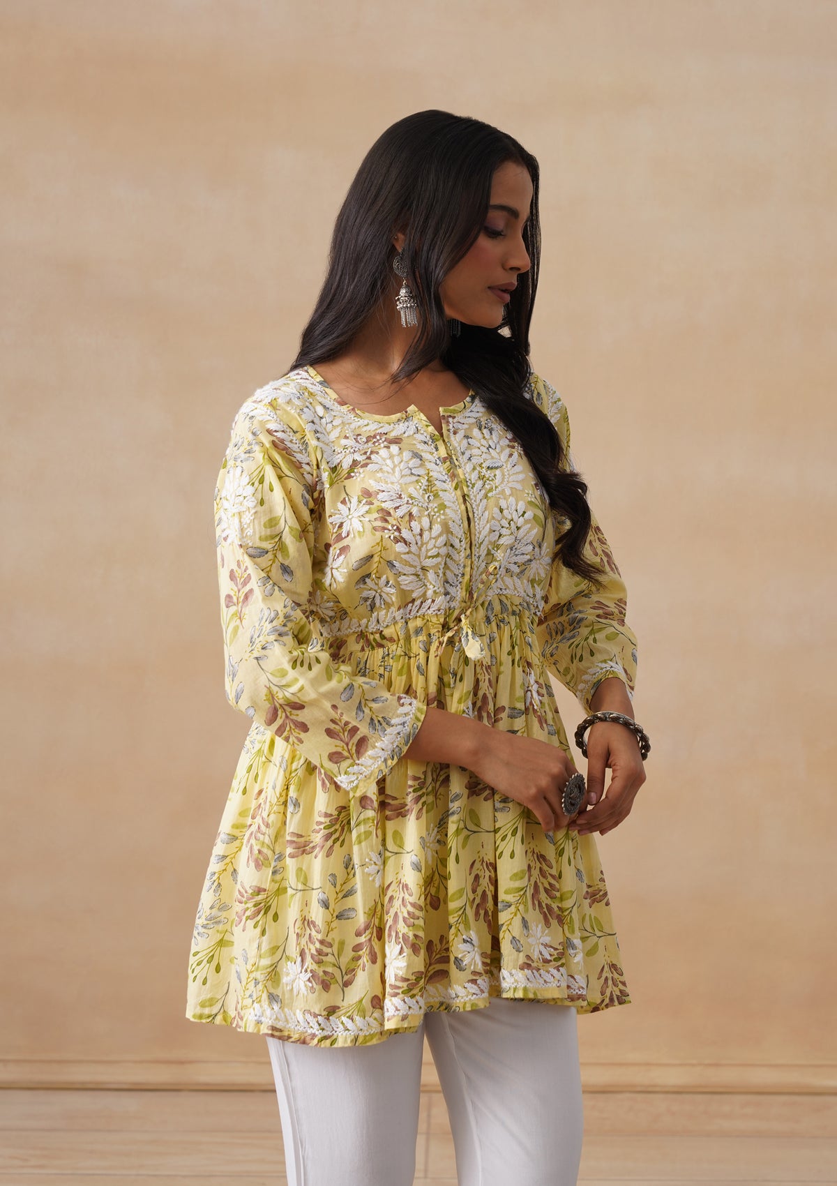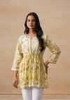 HOC Mulmul Chikankari Printed Women's Short Kurta - Yellow