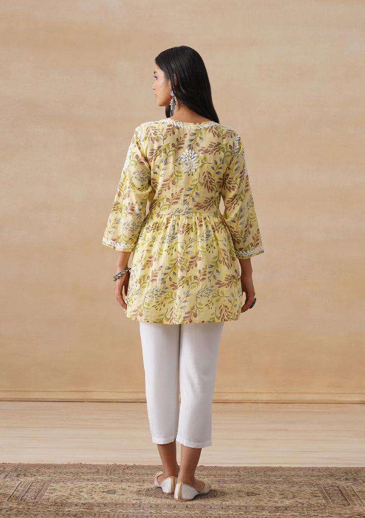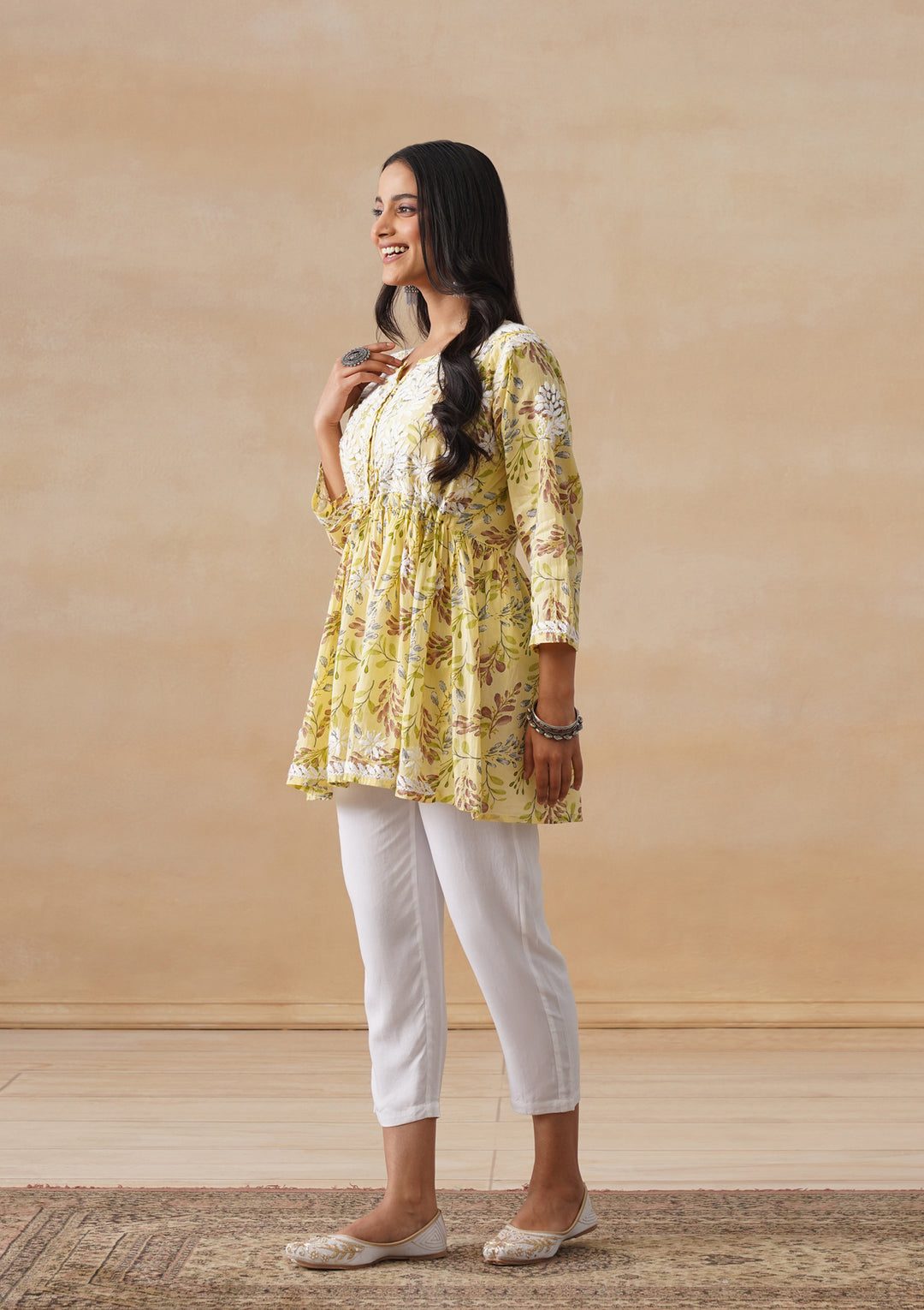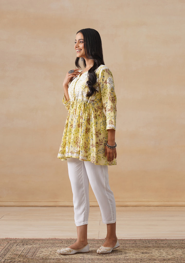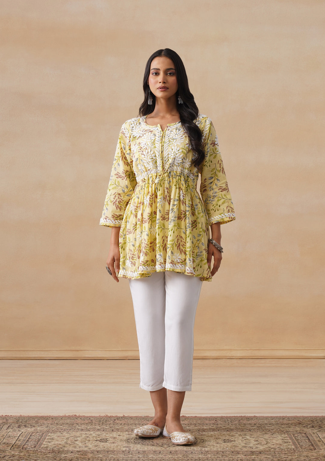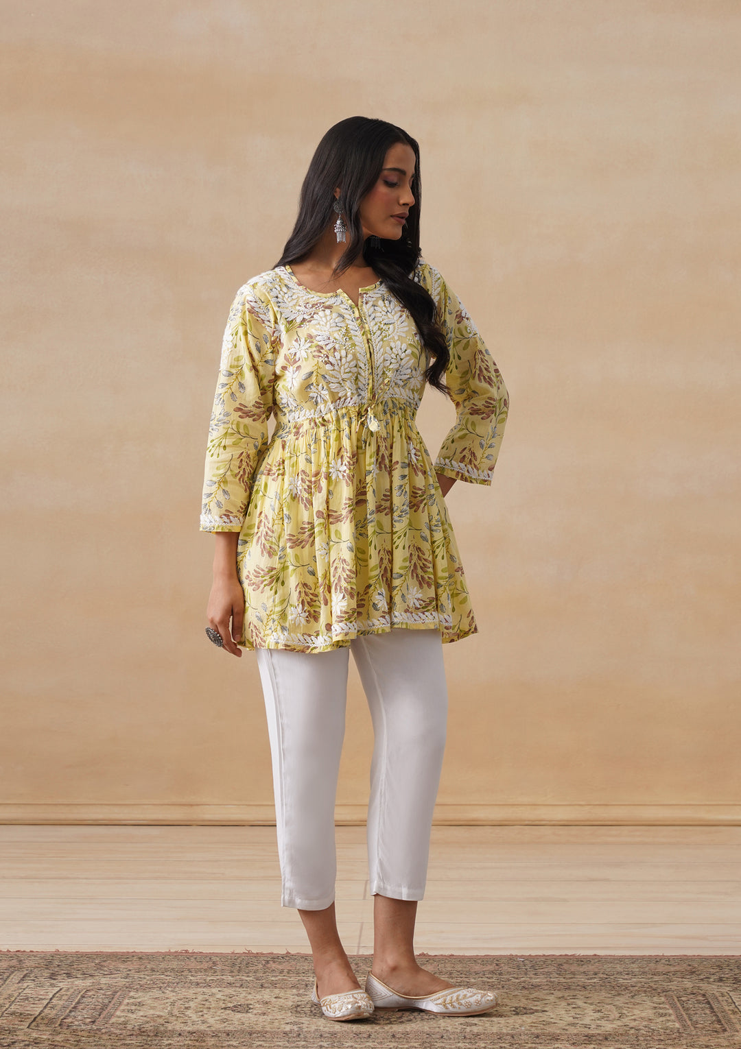 HOC Mulmul Chikankari Printed Women's Short Kurta - Yellow