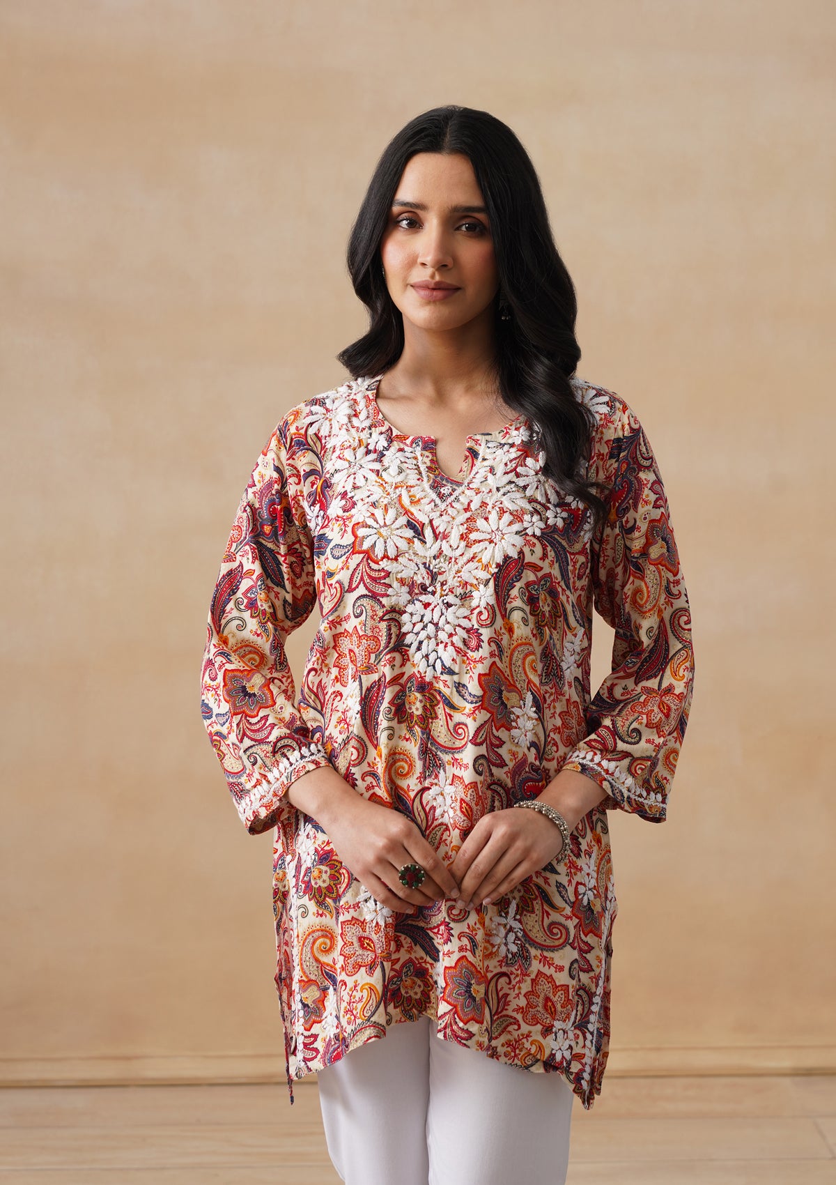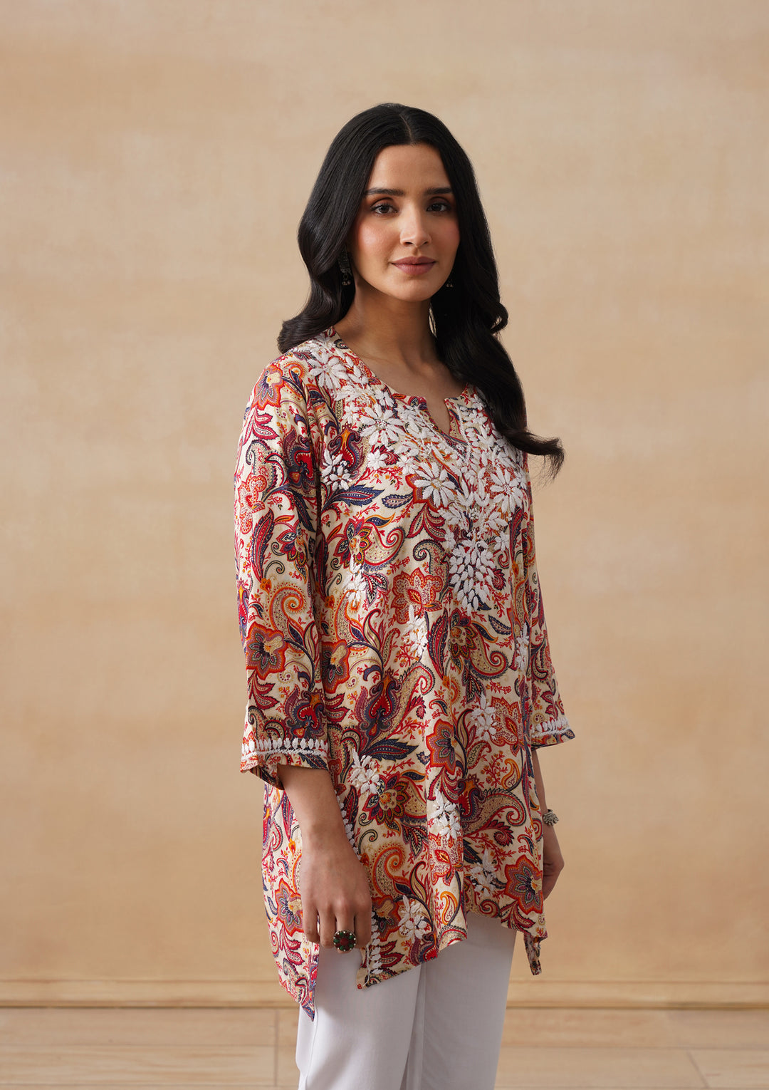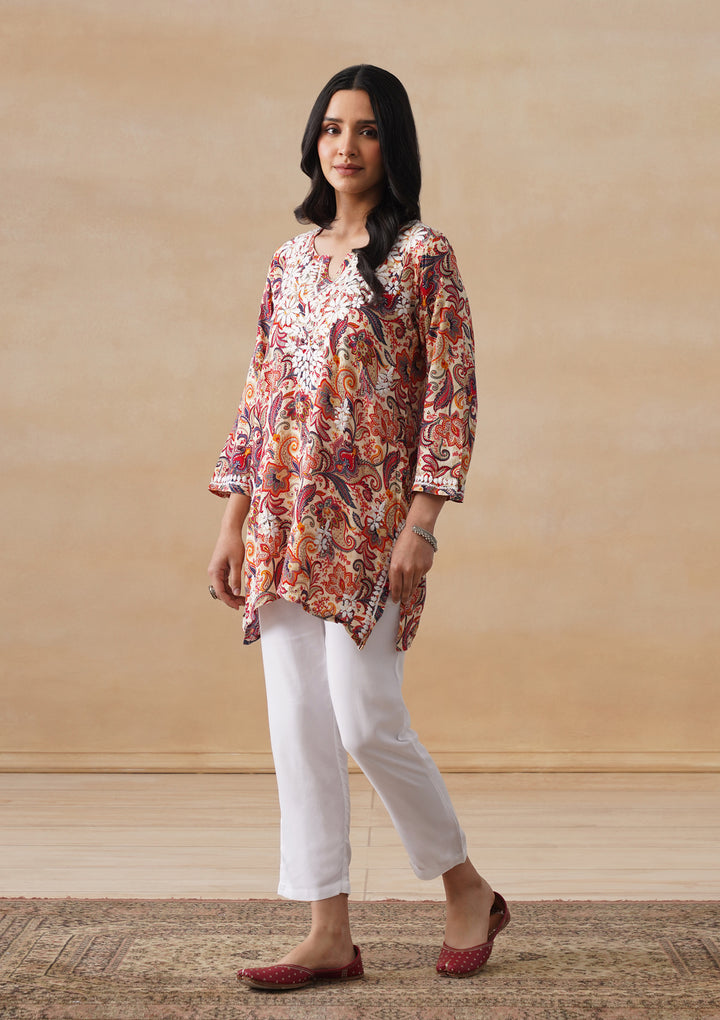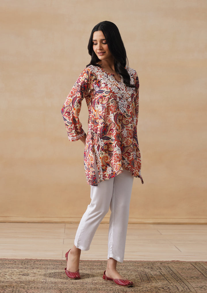 HOC Rayon Chikankari Printed Women's Short Kurta - Off white