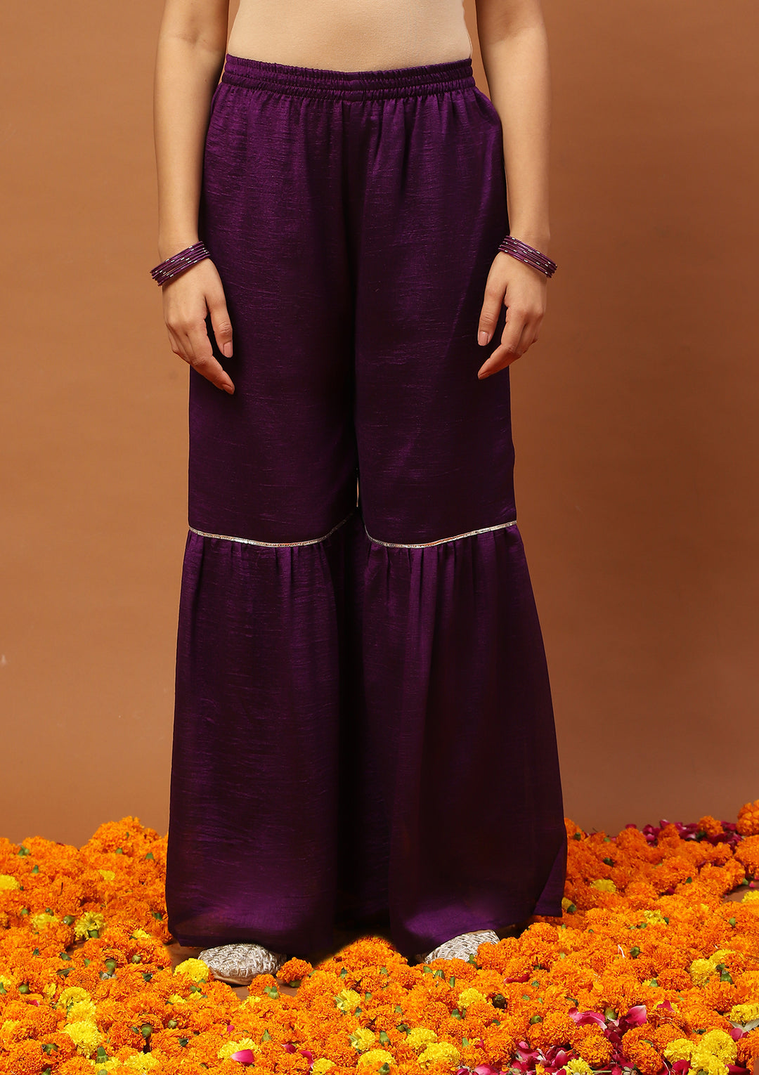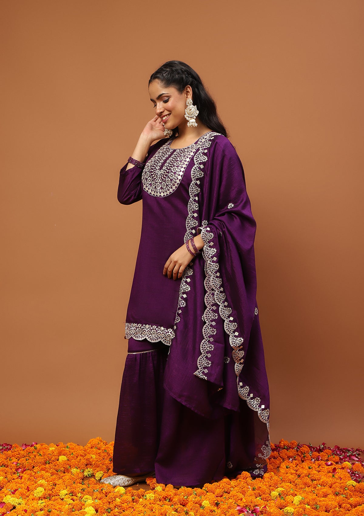 HOC Silk Blend Embroidered With Sequins Solid Women's 3 PC Gharara Kurta Set-Purple