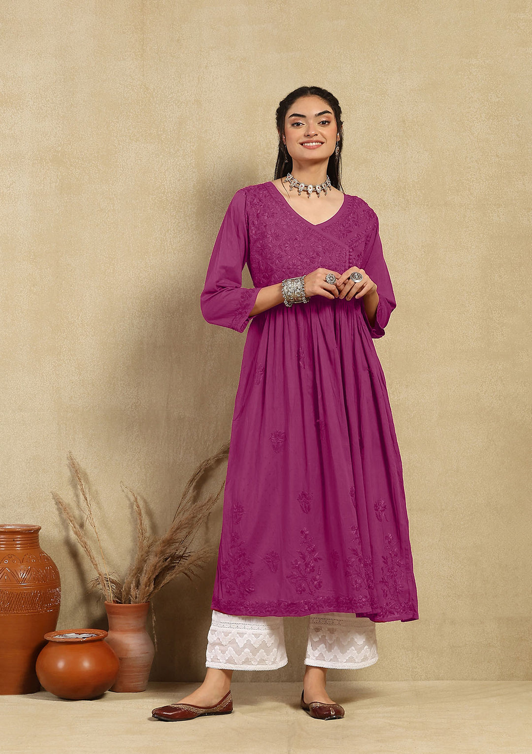 Dobby Cotton Chikankari Solid Women's Angrakha Kurta - Fuchsia