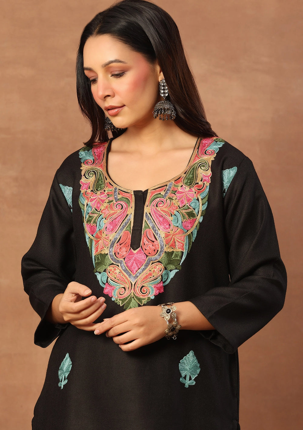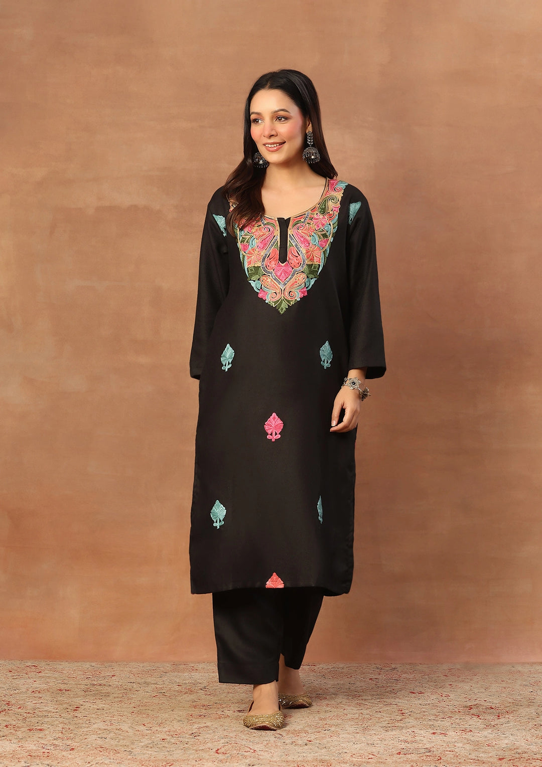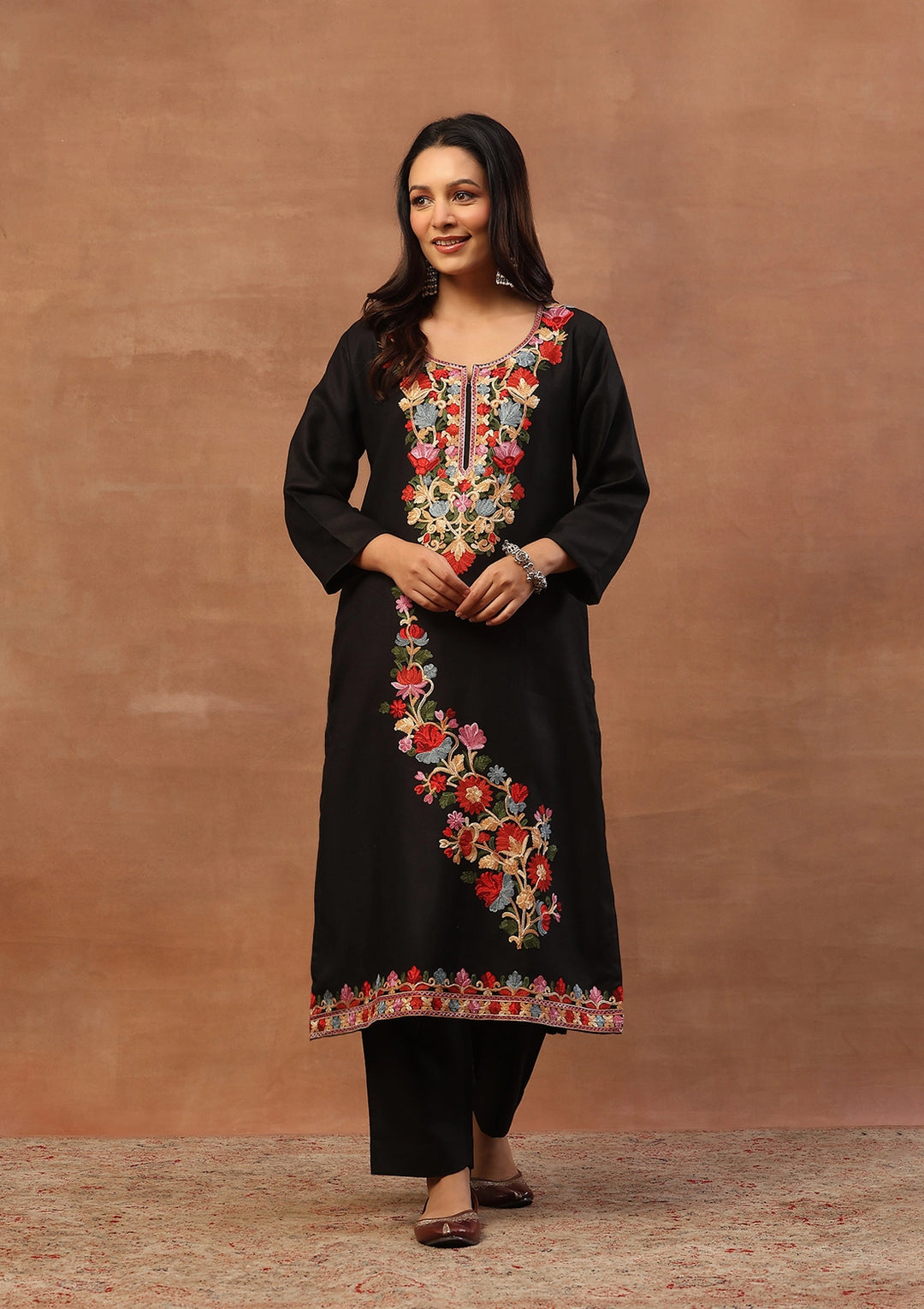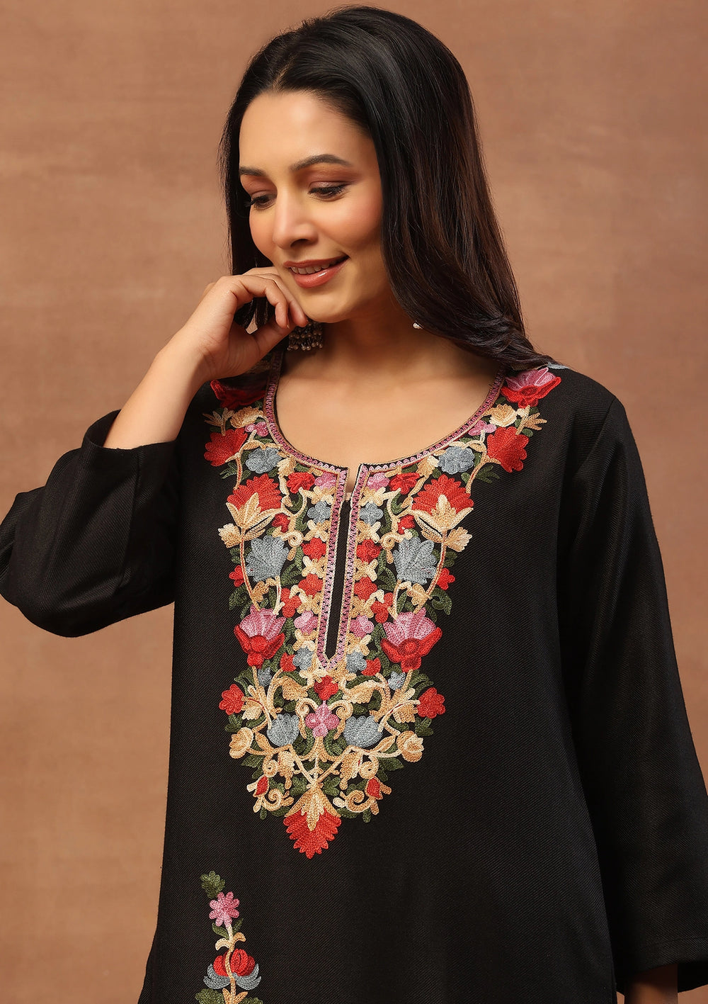 HOC Wool Aari Embroidered Solid Women's Long Kurta Set-Black