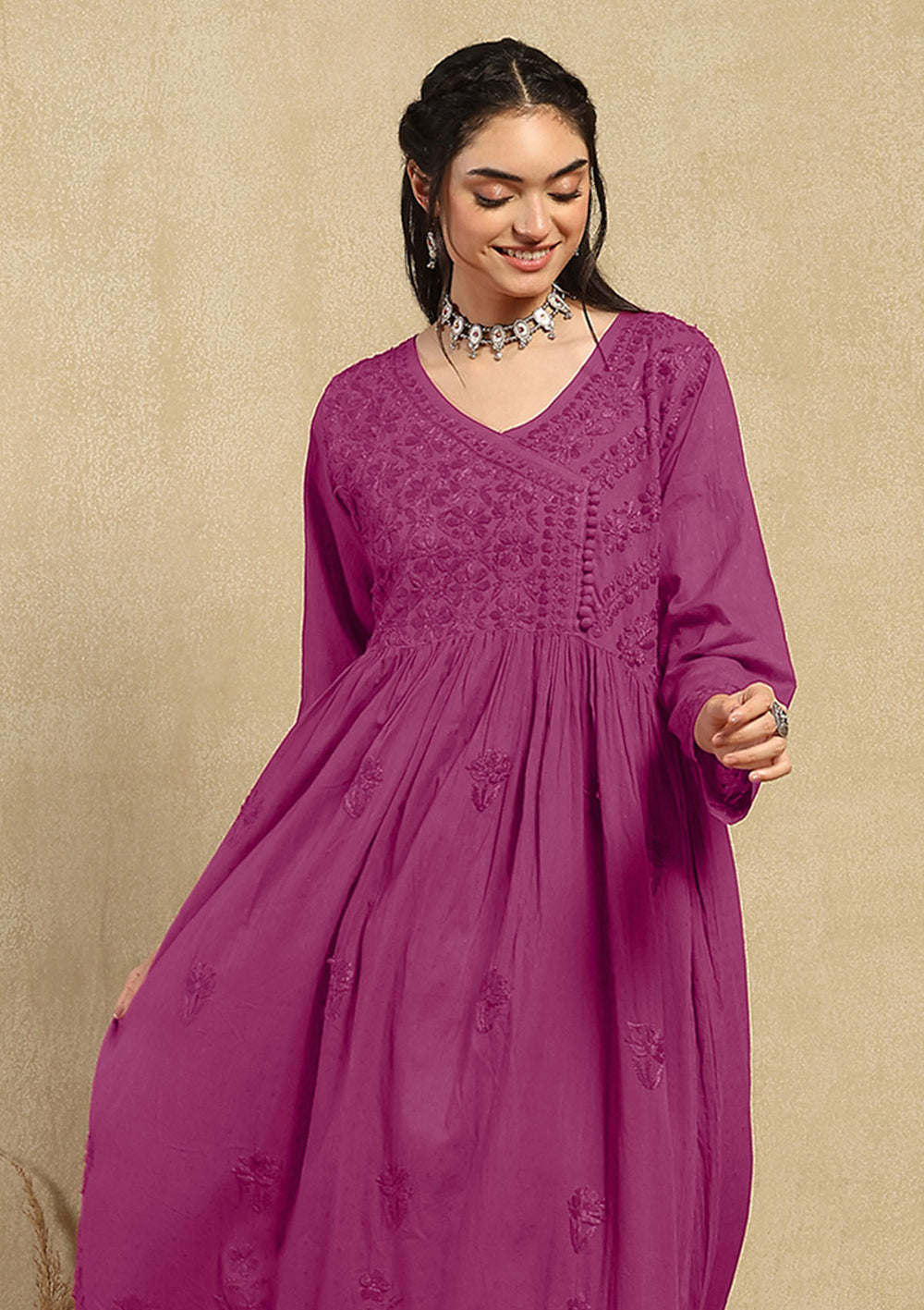 Pure Cotton Chikankari Solid Women's Long Kurta-Fuschia