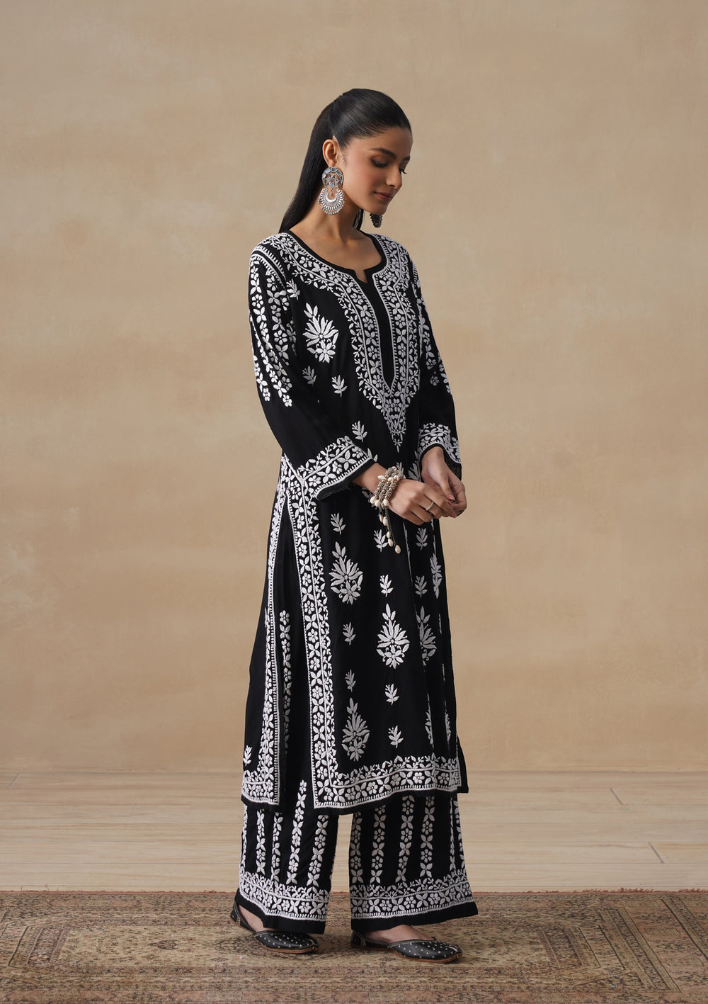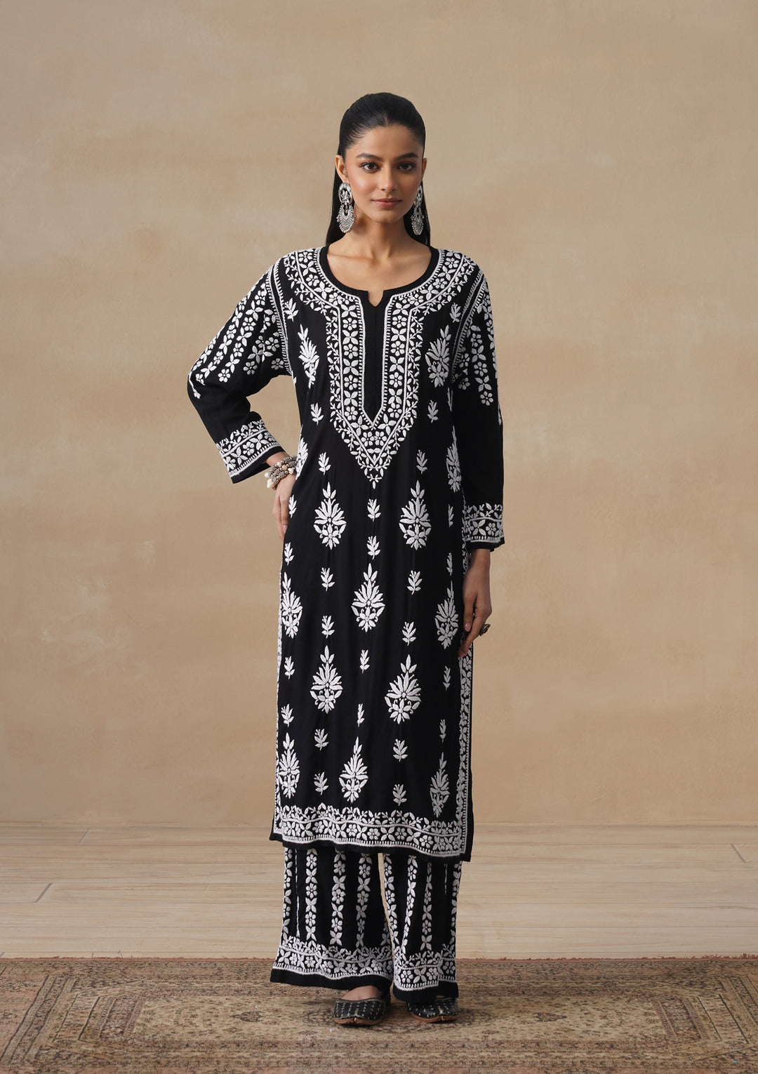 HOC Modal Chikankari Solid Women's 2 PC Long Kurta Set - Black