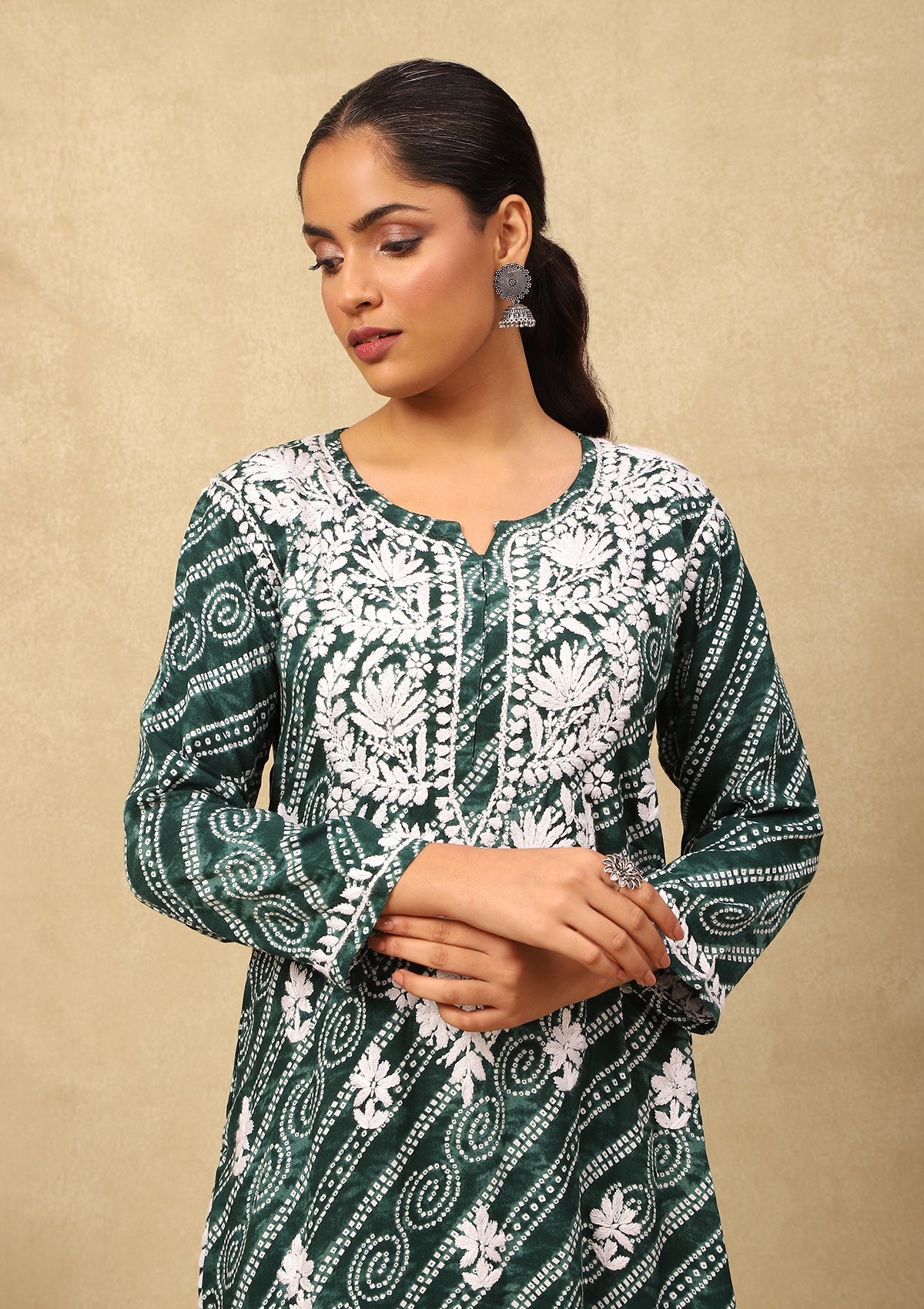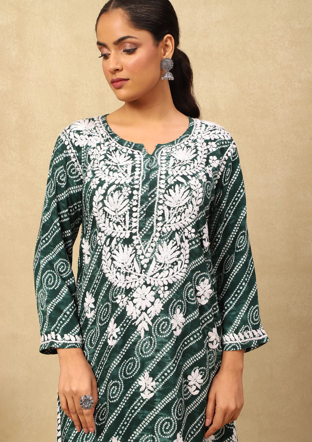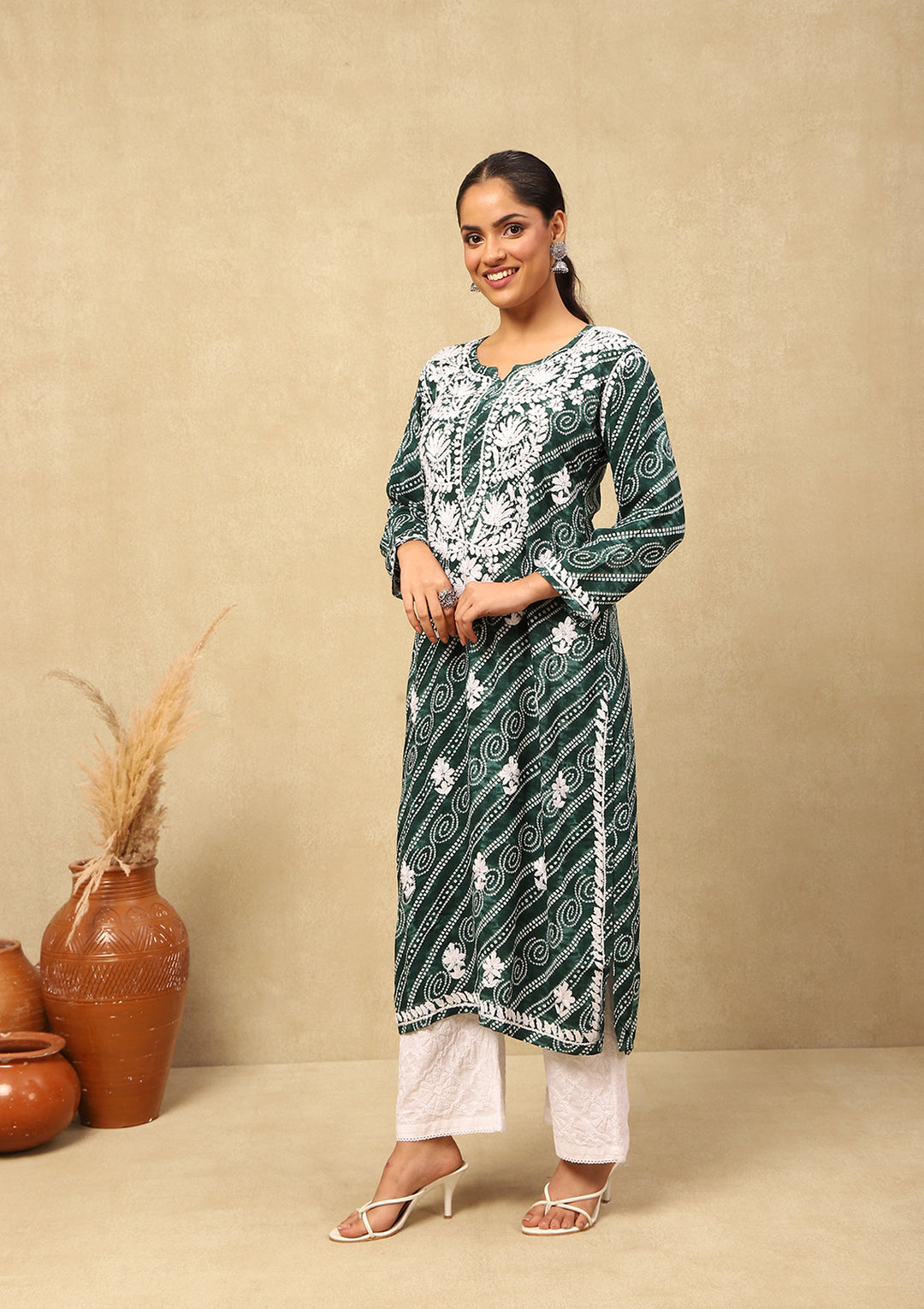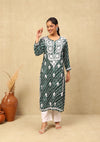 HOC Rayon Chikankari Bandhani Printed Women's Long Kurta-Green