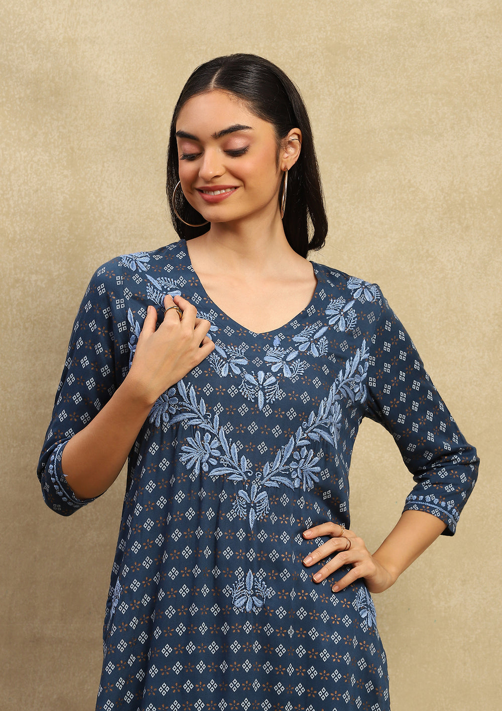 HOC Rayon Chikankari Printed Women's Long Kurta - Navy Blue
