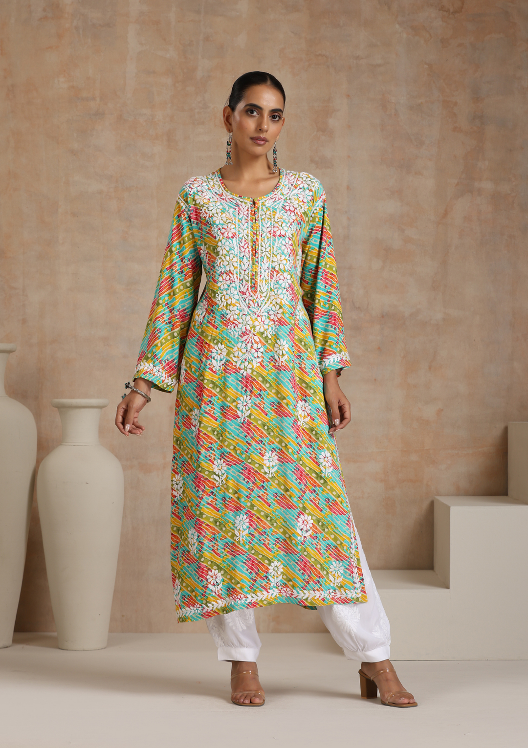 HOC Zainab Chikankari Mulmul Printed Straight Kurta -Yellow