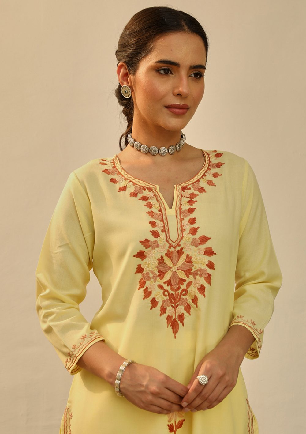 HOC Kashmiri Wool Aari Embroidered Straight Short Kurta Set- Maroon
