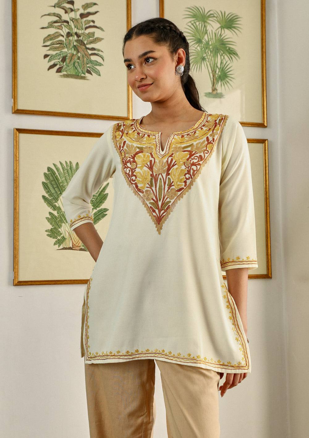 HOC Kashmiri Wool Aari Embroidered Solid Women's Short Kurta- Grey