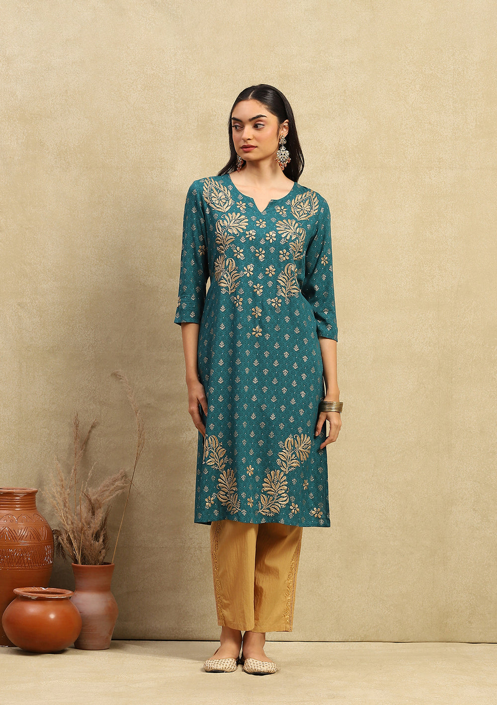 HOC Rayon Chikankari With Mukaish Solid Women's 2 PC Long Kurta Set - Green