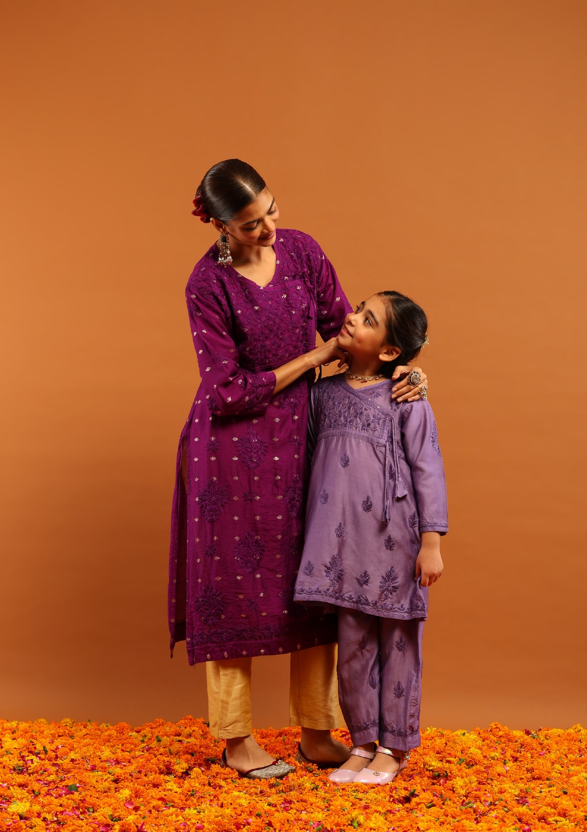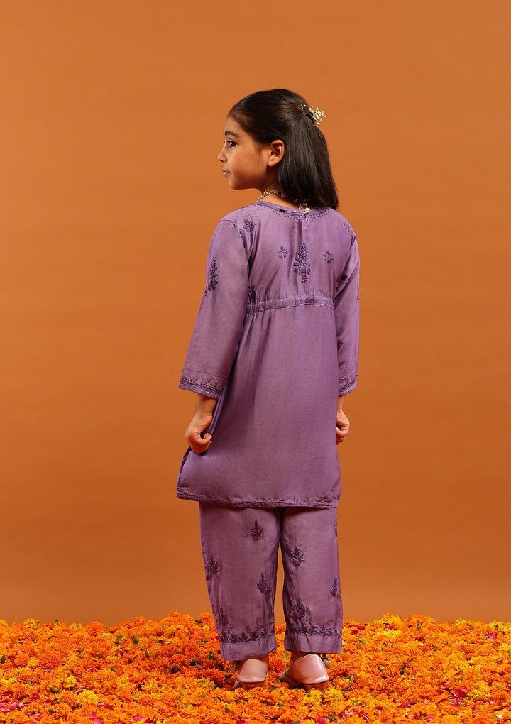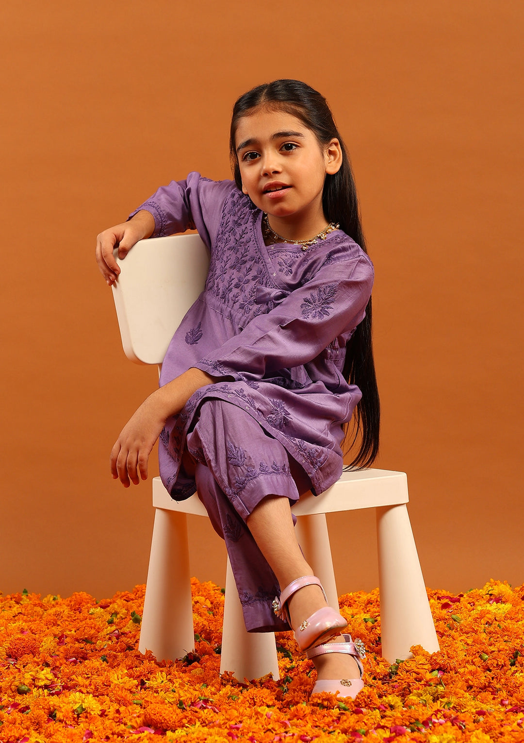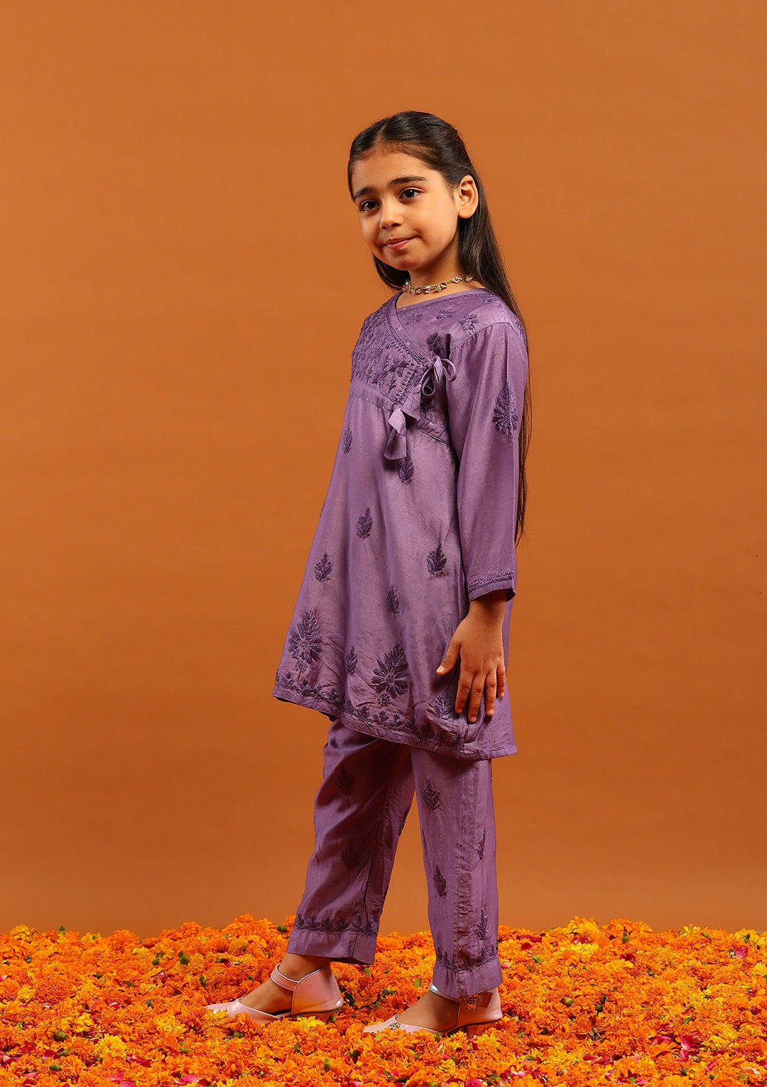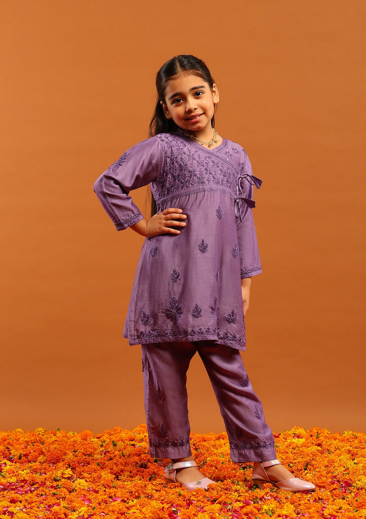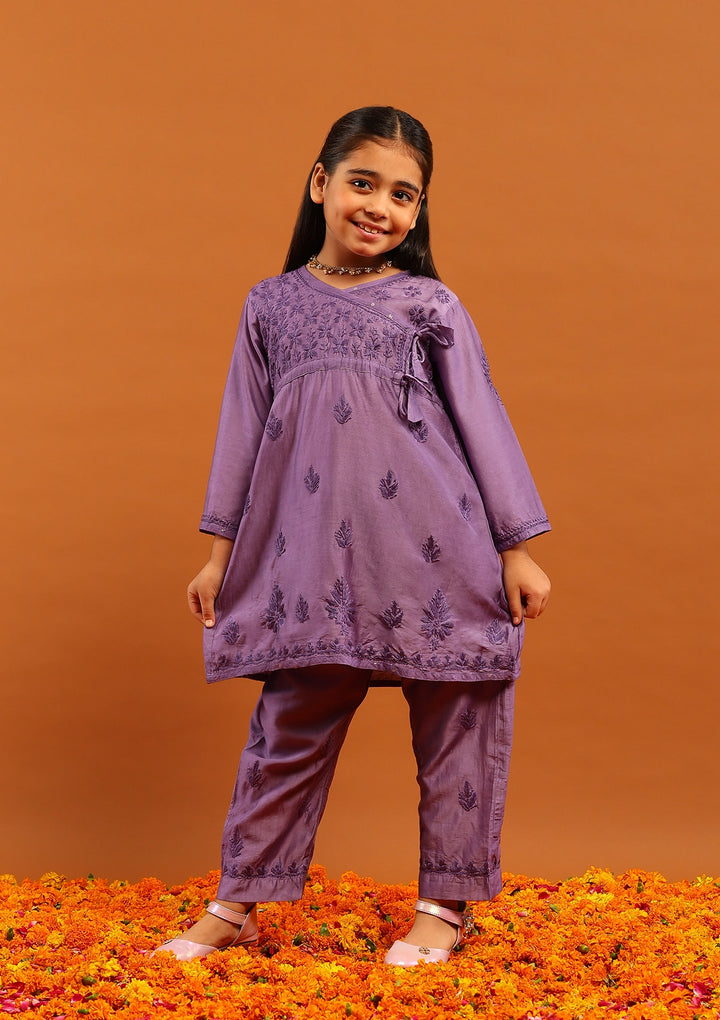 HOC Chanderi Chikankari Solid Girl's 2 PC Kurta Set Angrakha-Lavender