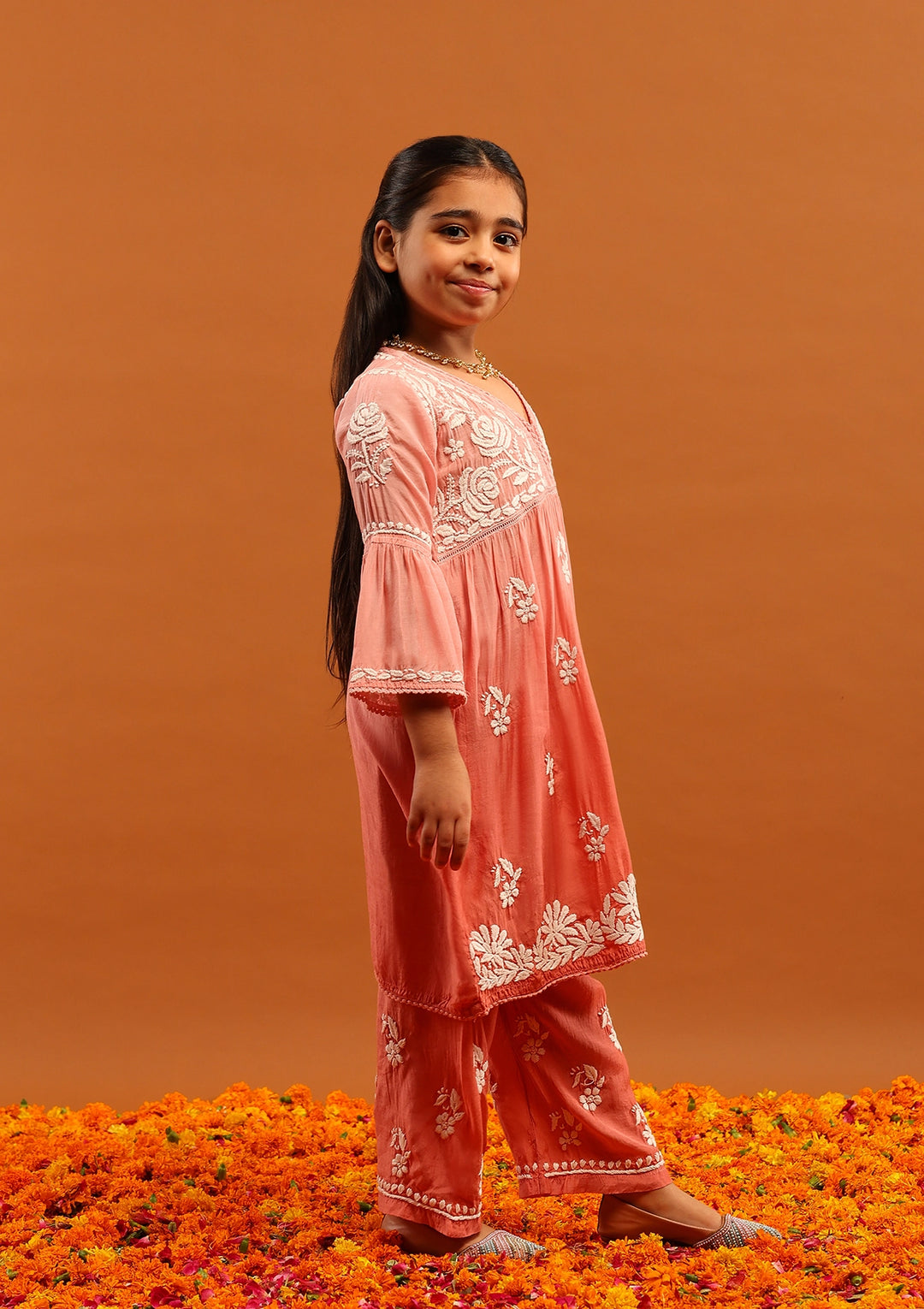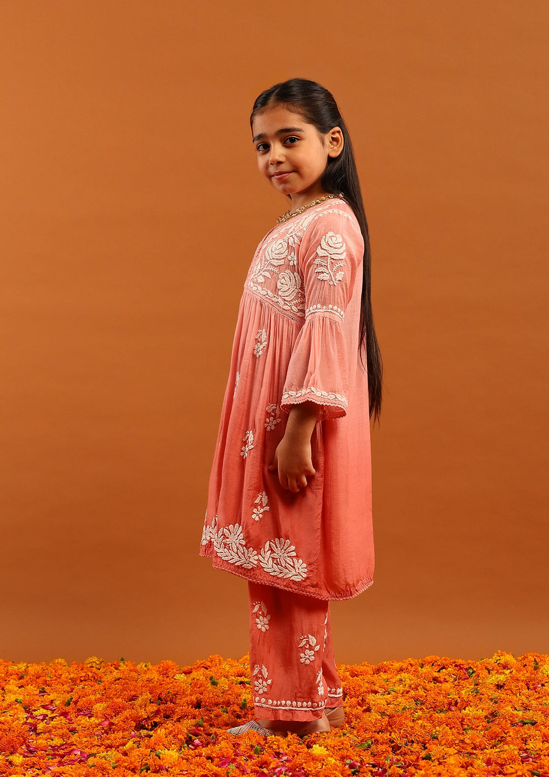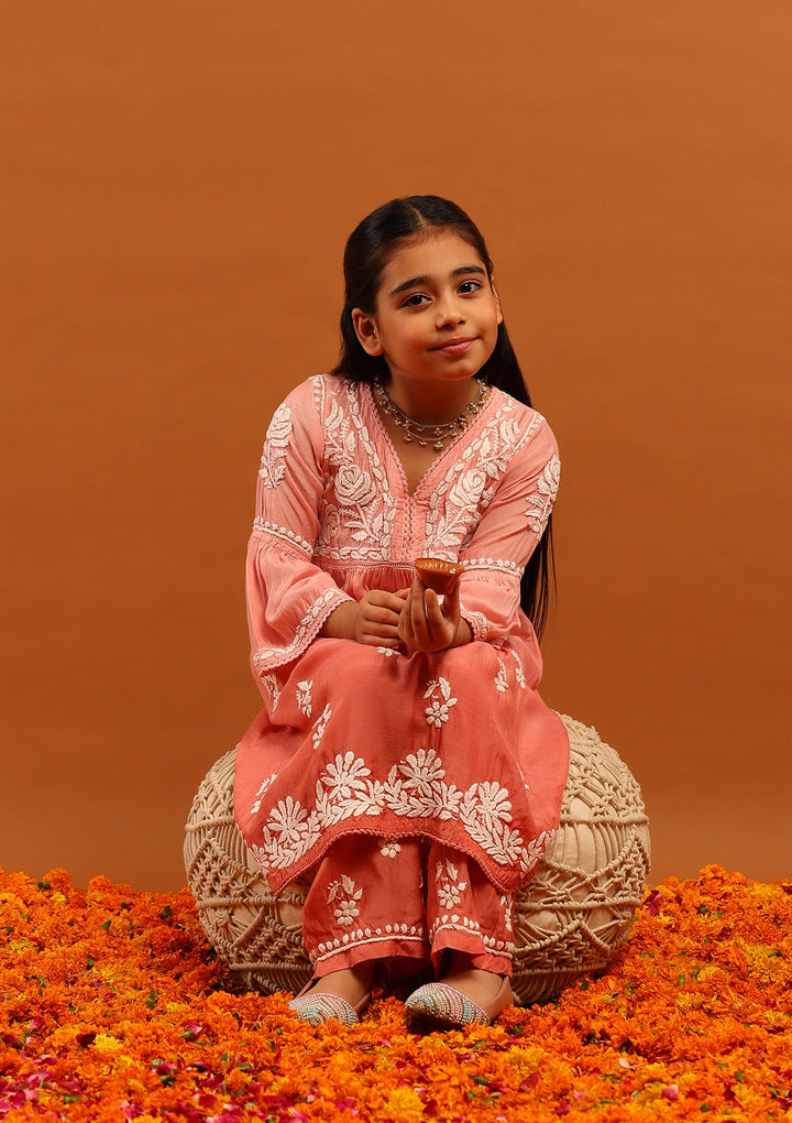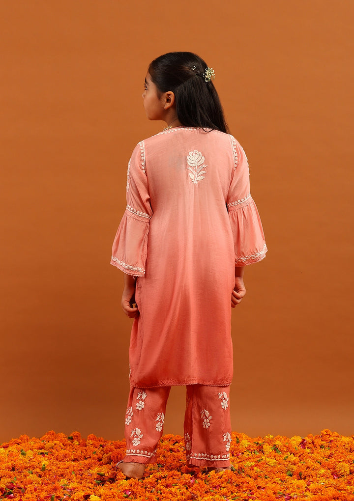 HOC Muslin Chikankari Ombre Girl's 2 PC A-Line Kurta Set-Peach Ombre