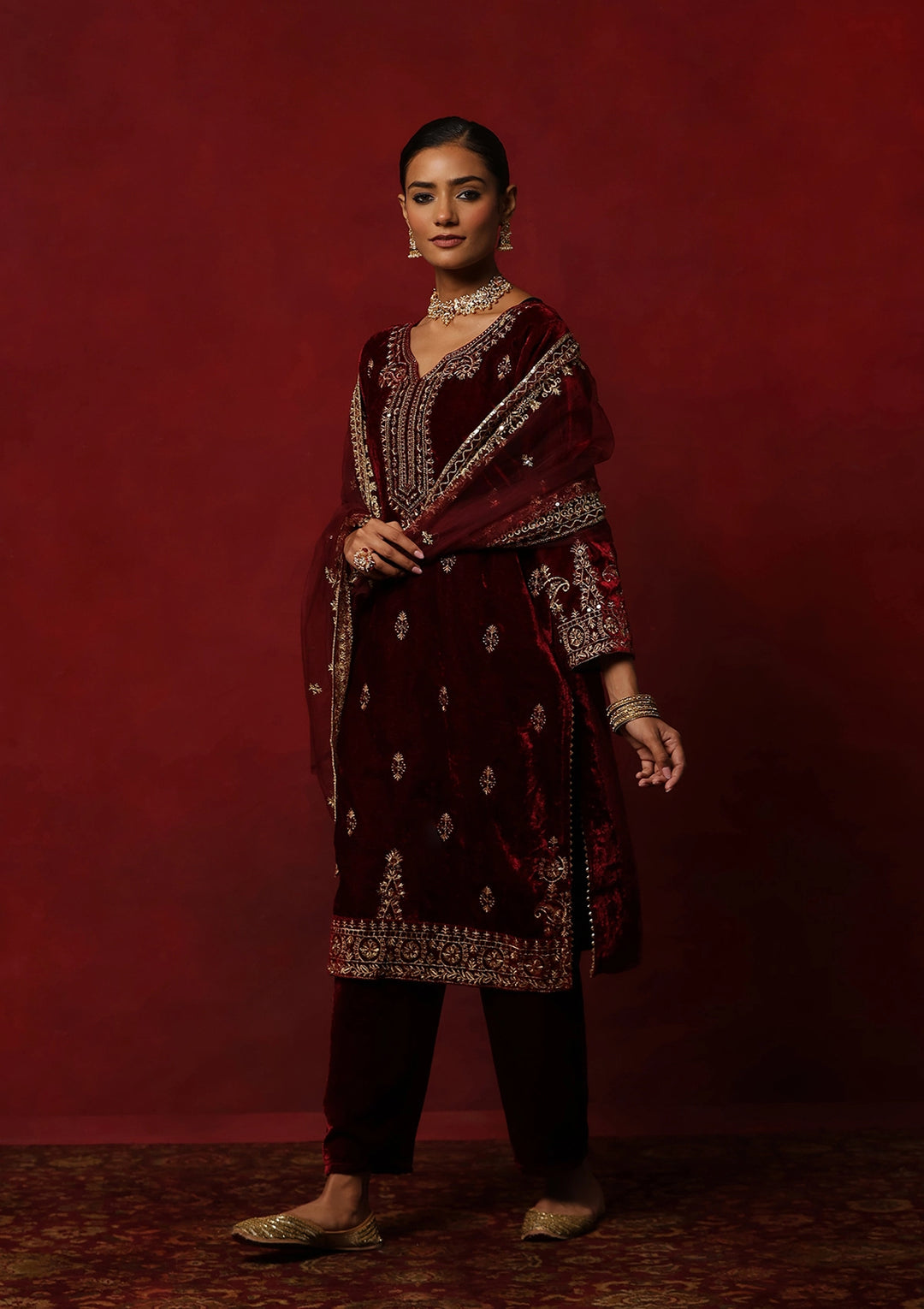 HOC Velvet Embroidered & Embellished Solid Women's 3 PC Kurta Set- Maroon