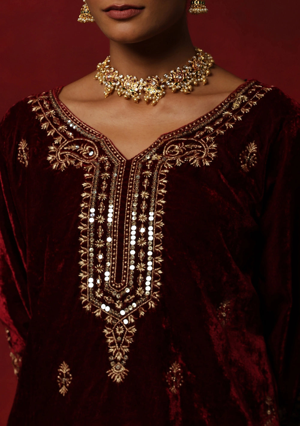 HOC Kashmiri Velvet Tilla Embroidered Solid Women's 2 PC Phiran Set -Maroon