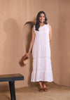 HOC Dobby Cotton Chikankari Solid Women's Long Dress With Crochet Lace & Ruffle-White