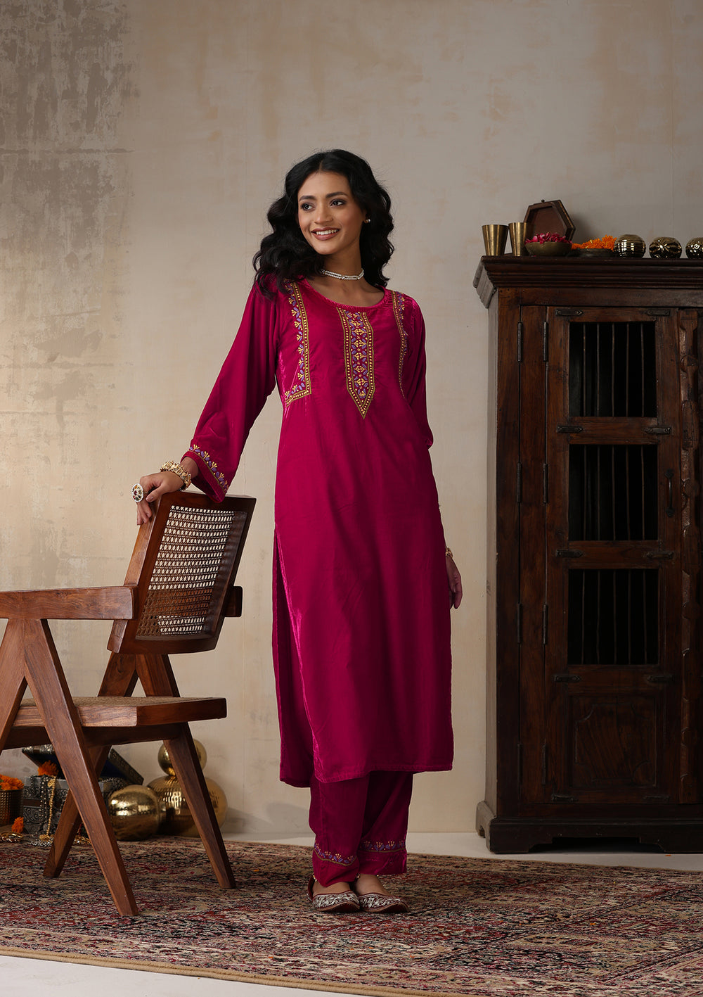 HOC Kashmiri Wool Aari Embroidered Straight Kurta Set with Dupatta-Pink