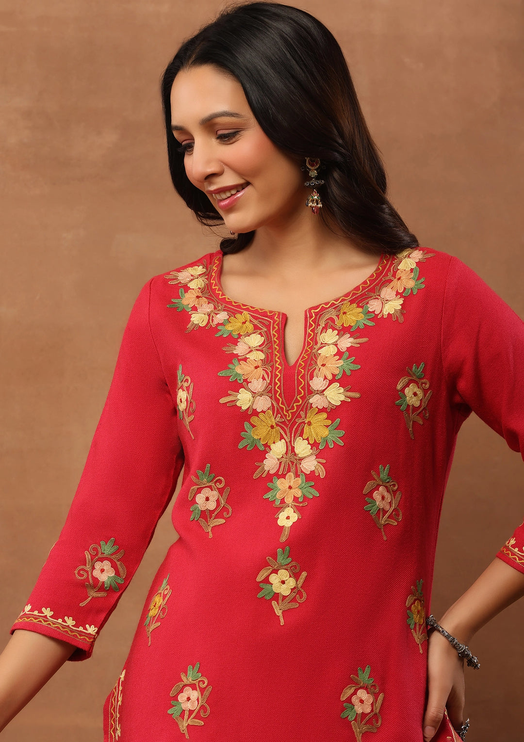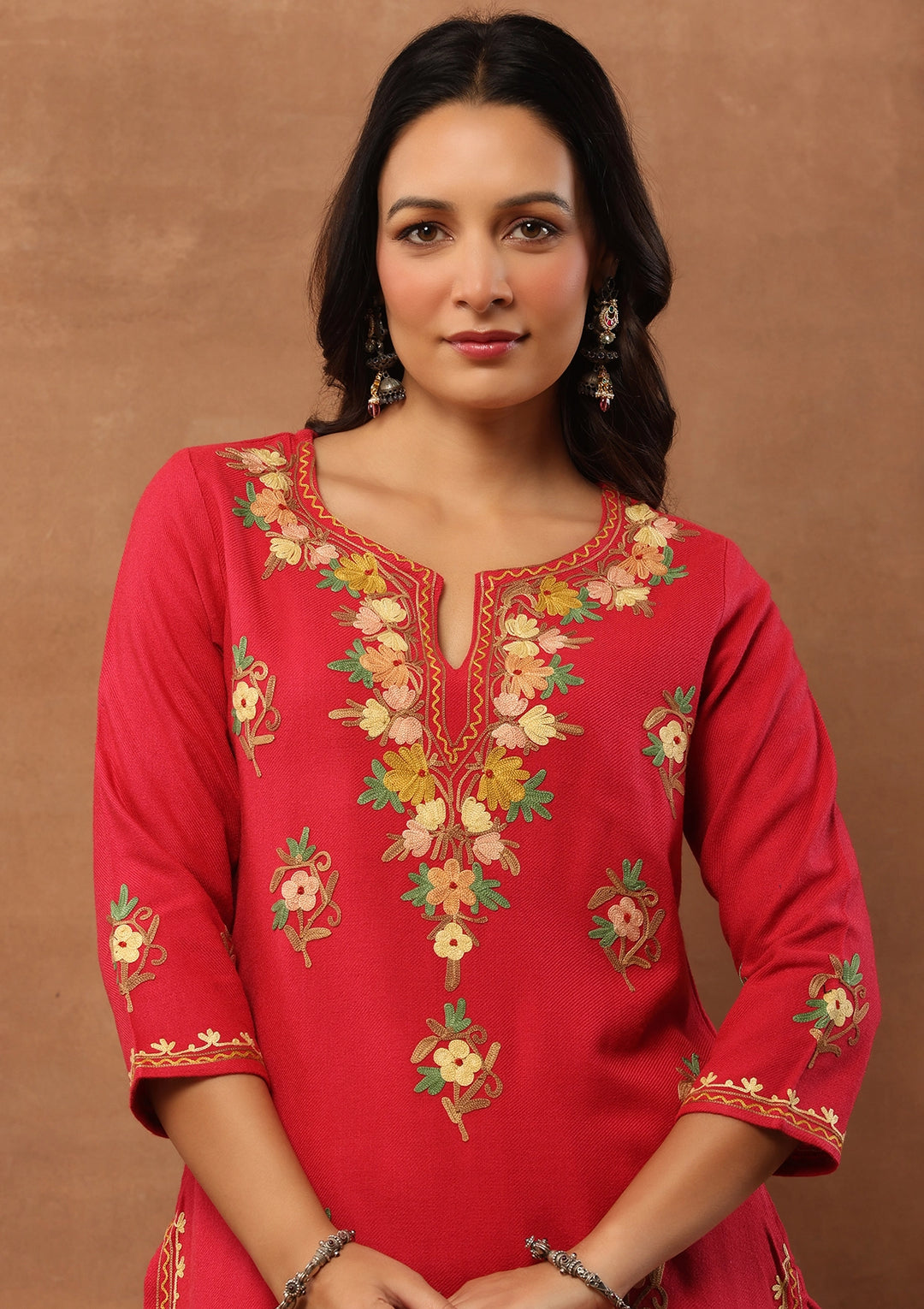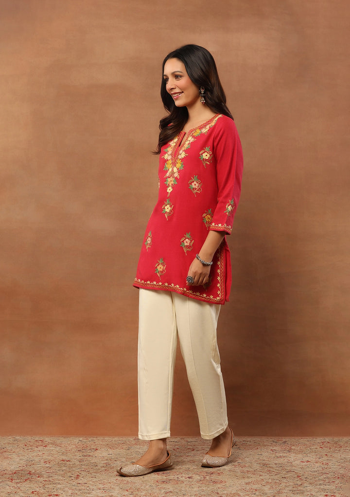 HOC Kashmiri Wool Aari Embroidered Solid Women's Short Kurta - Pink